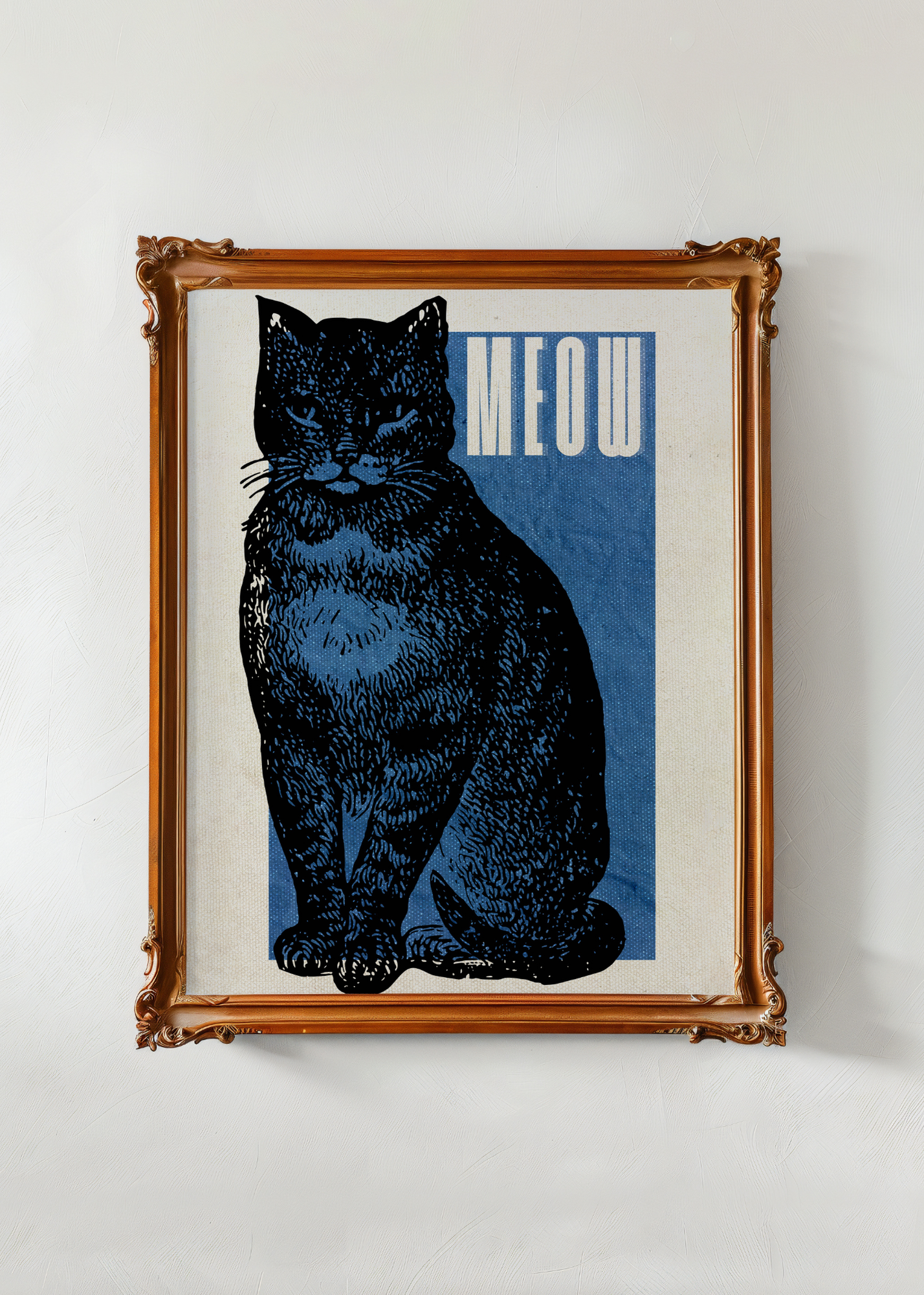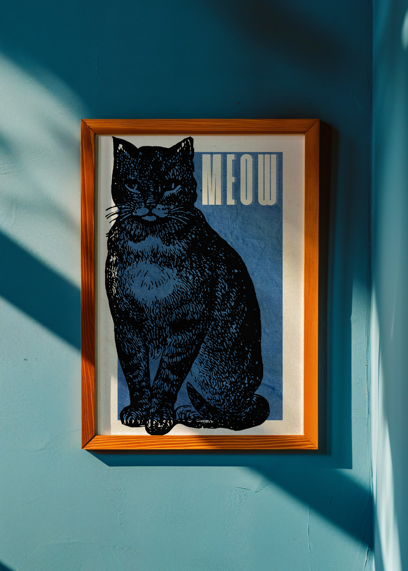 Meow— A single black cat stares with calm curiosity from a blue textured background. In the top corner, the word “meow” perches in crisp lettering. Minimal, modern, and purr-fect for cat lovers with a taste for the sleek and stylish.
