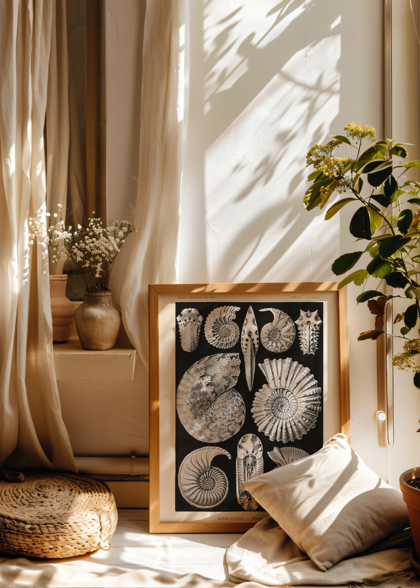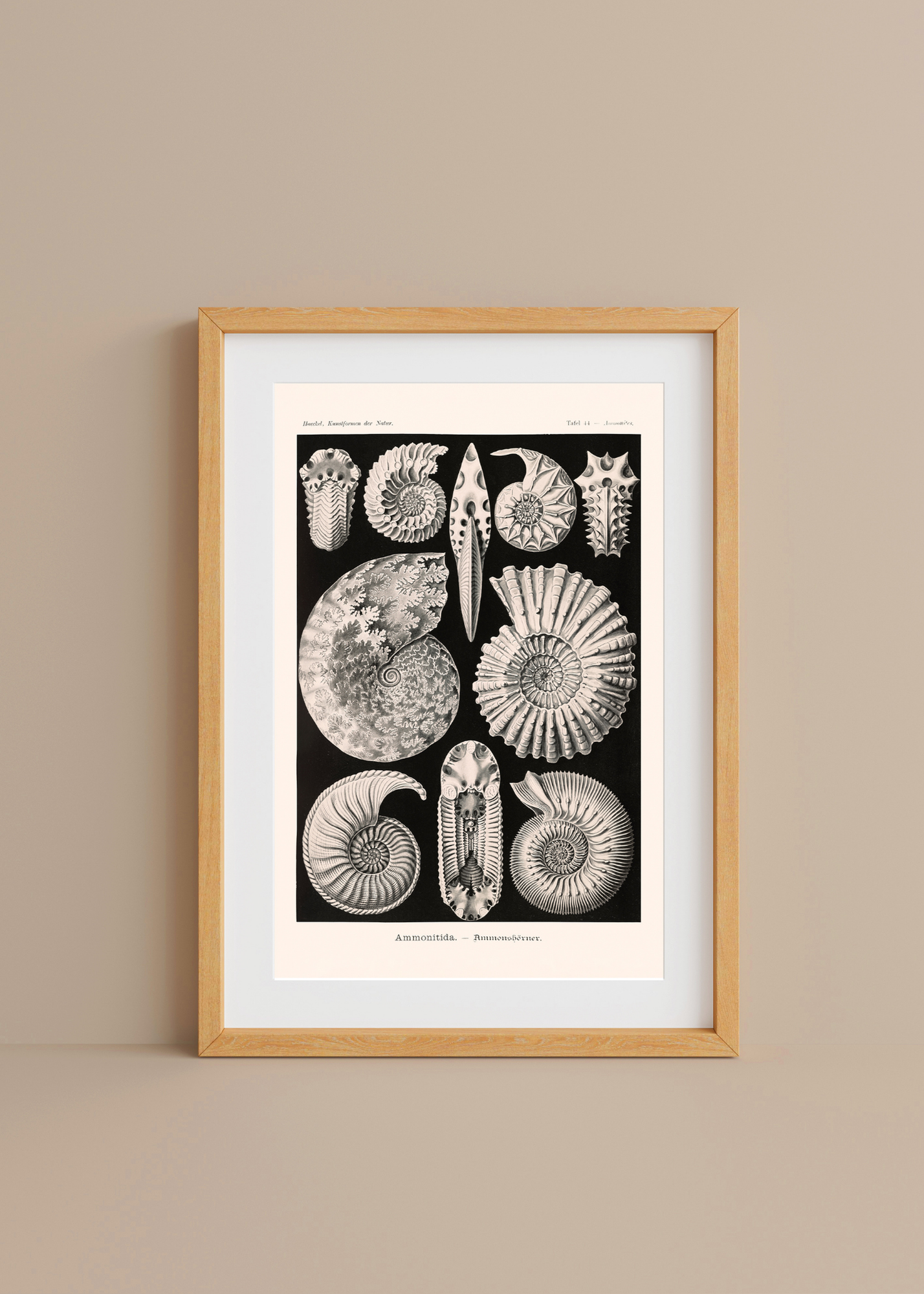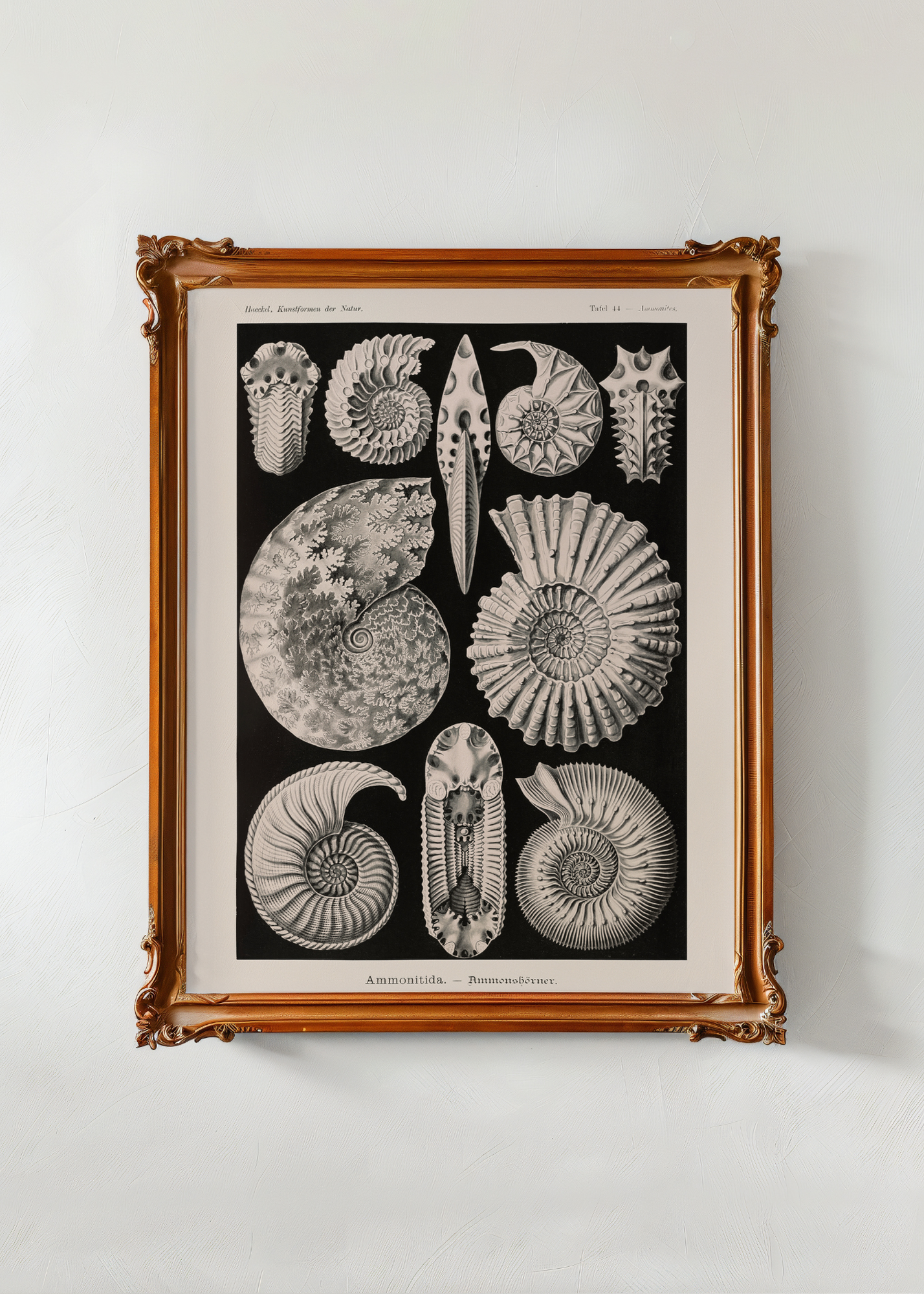 Ammonitida— In Ammonitida, Ernst Haeckel unearths a lost world etched in stone—a spiraled archive of ancient seas and vanished time. Each ammonite, with its coiled geometry and intricate ridges, tells a silent story of life beneath prehistoric waves. Rendered with scientific precision and artistic wonder, Haeckel’s composition transforms fossilized shells into delicate sculptures, as if time itself had become ornate.