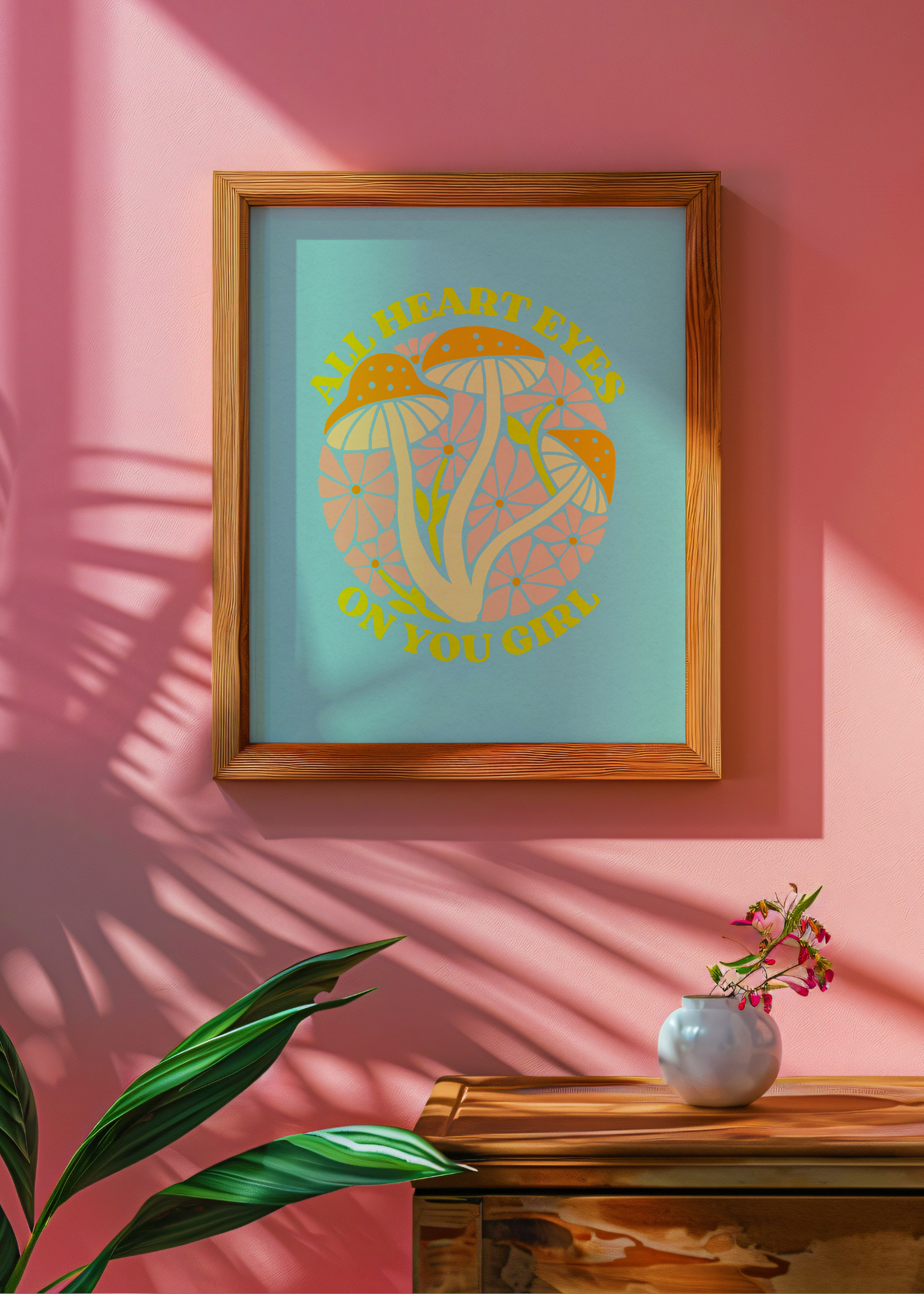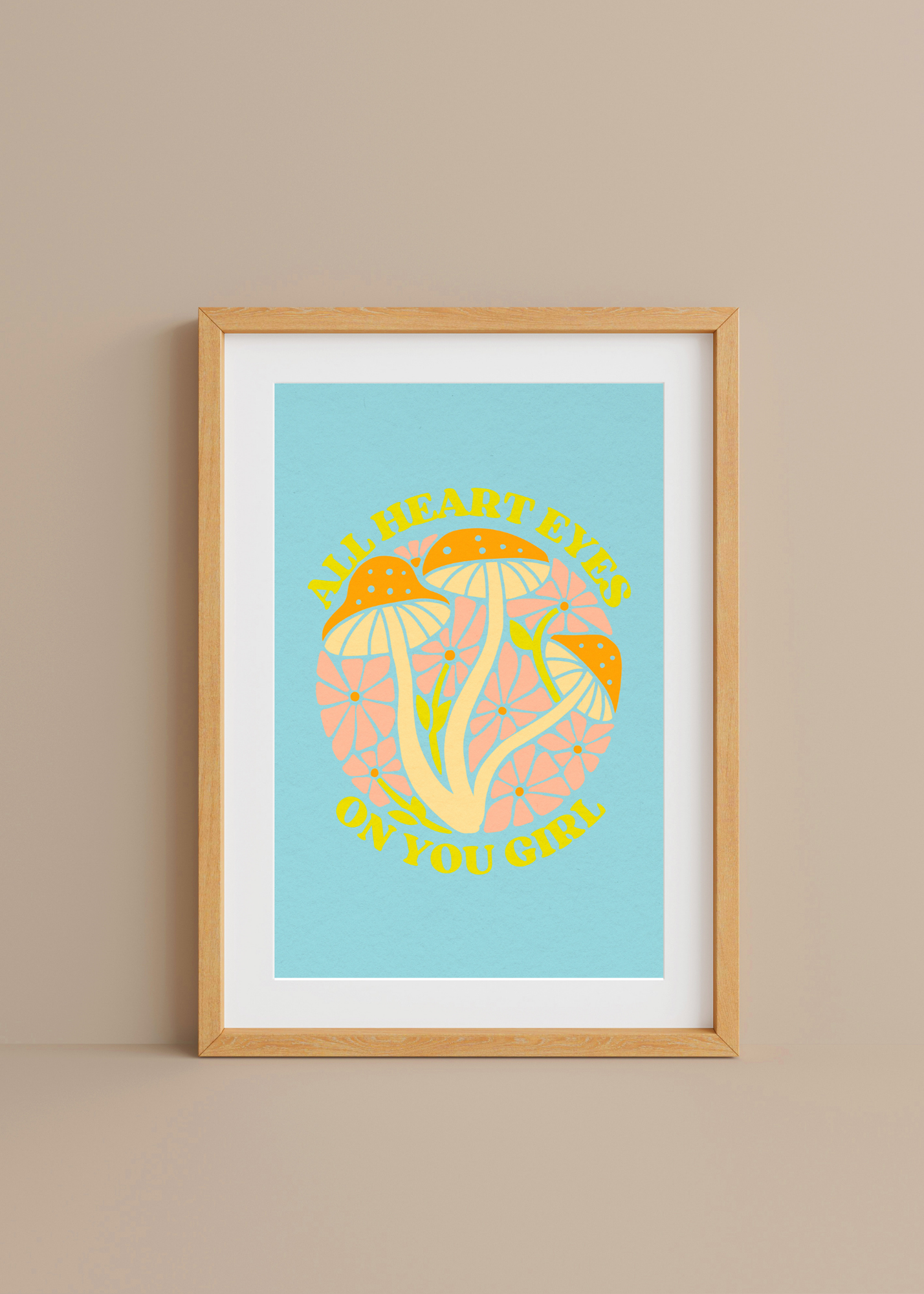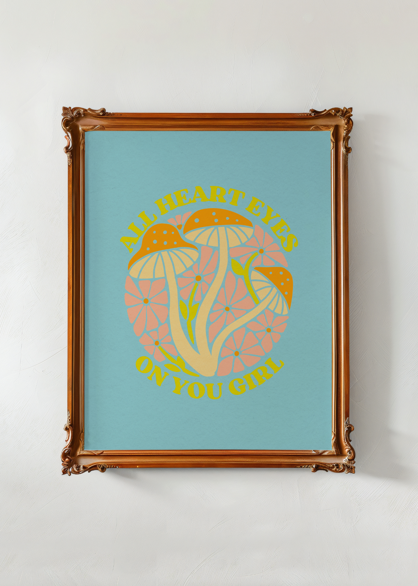 All Heart Eyes on You— With its soft sky-blue base and warm peach-and-golden tones, this print beams with sweetness and sunshine. The playful mushrooms stretch upward like they're soaking in love, surrounded by daisy-like blooms and the joyful phrase: All Heart Eyes On You Girl. This one’s made for the dreamers, the bold lovers, and the friends you hype up like sunshine in a bottle.