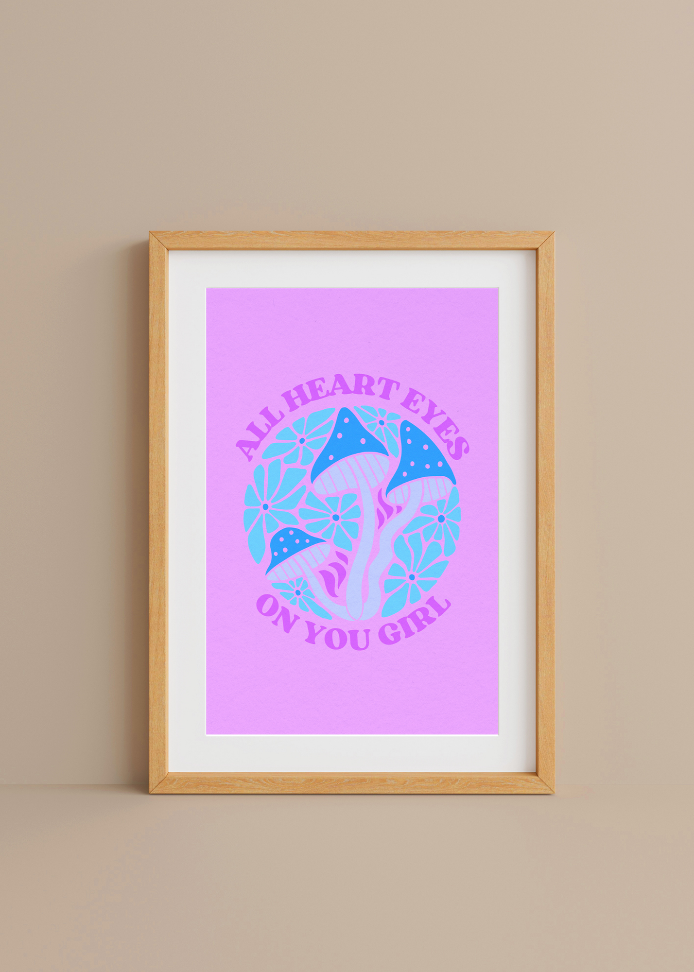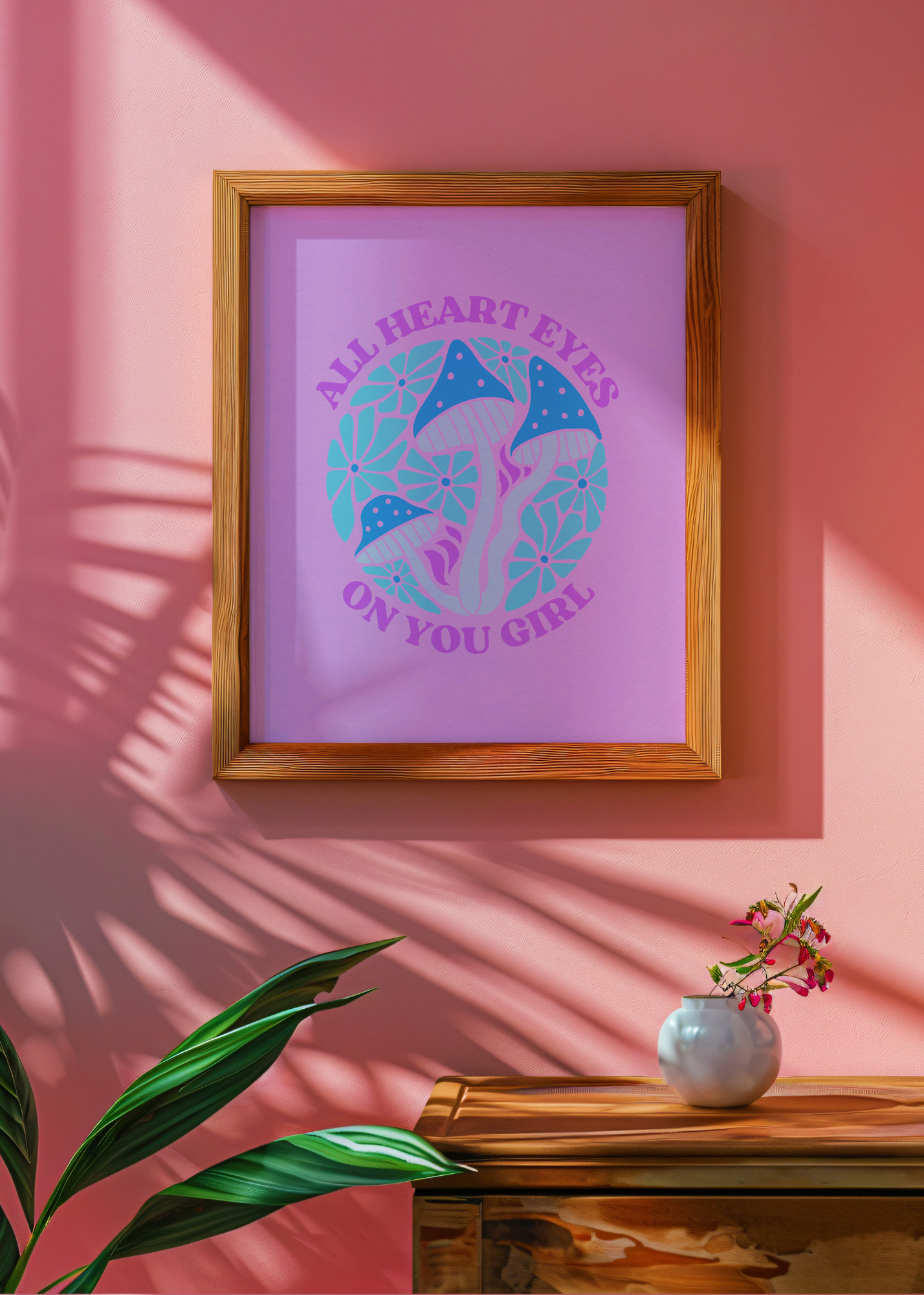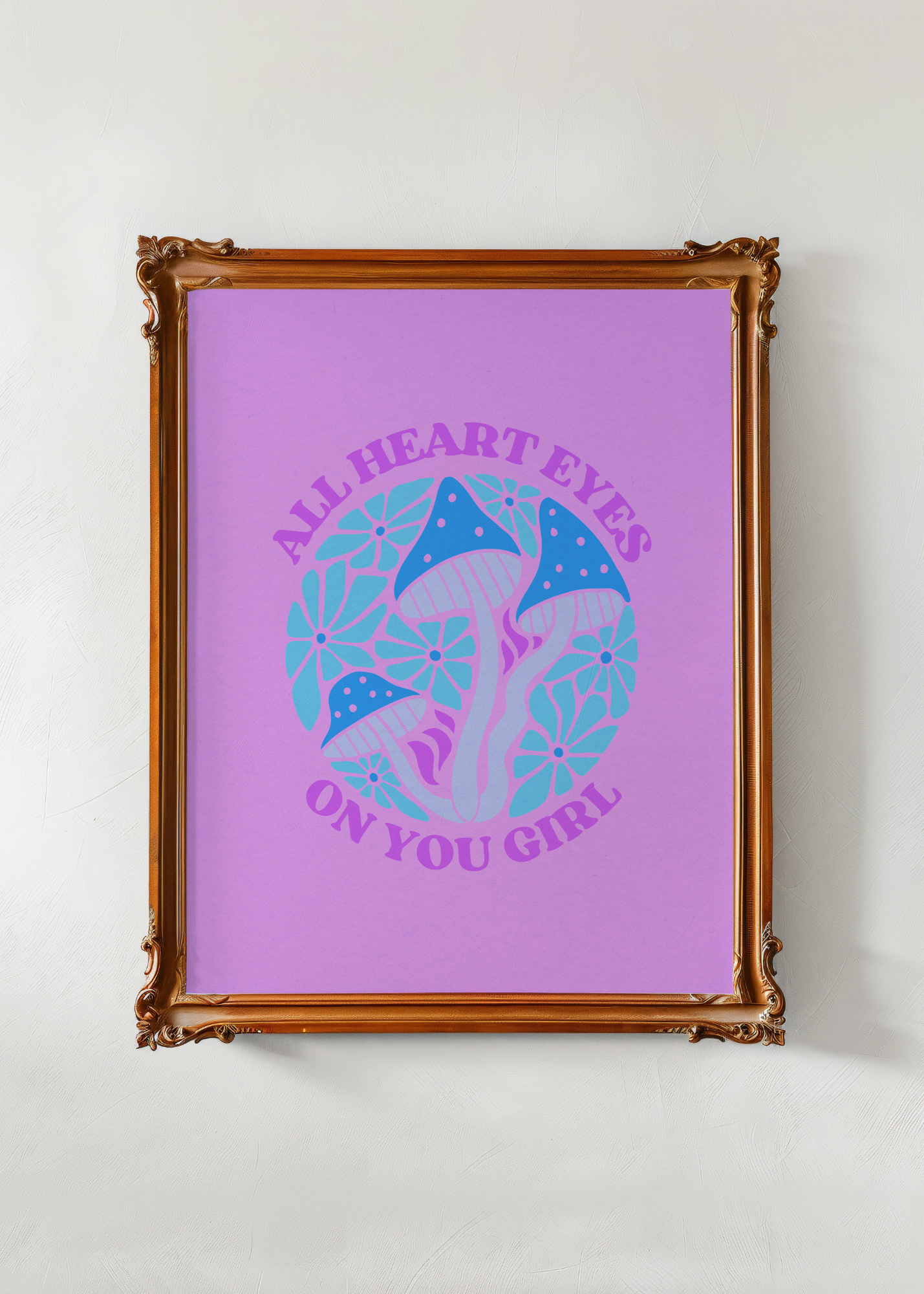 All Heart Eyes on You— Soft and dreamy with a playful twist, this print feels like a pastel-powered love spell. Vivid blue mushrooms stand tall among sky-kissed blooms, wrapped in lavender warmth and a reminder that the love you give is the love you deserve. This one is a peaceful but powerful anthem of self-worth and wildflower joy.