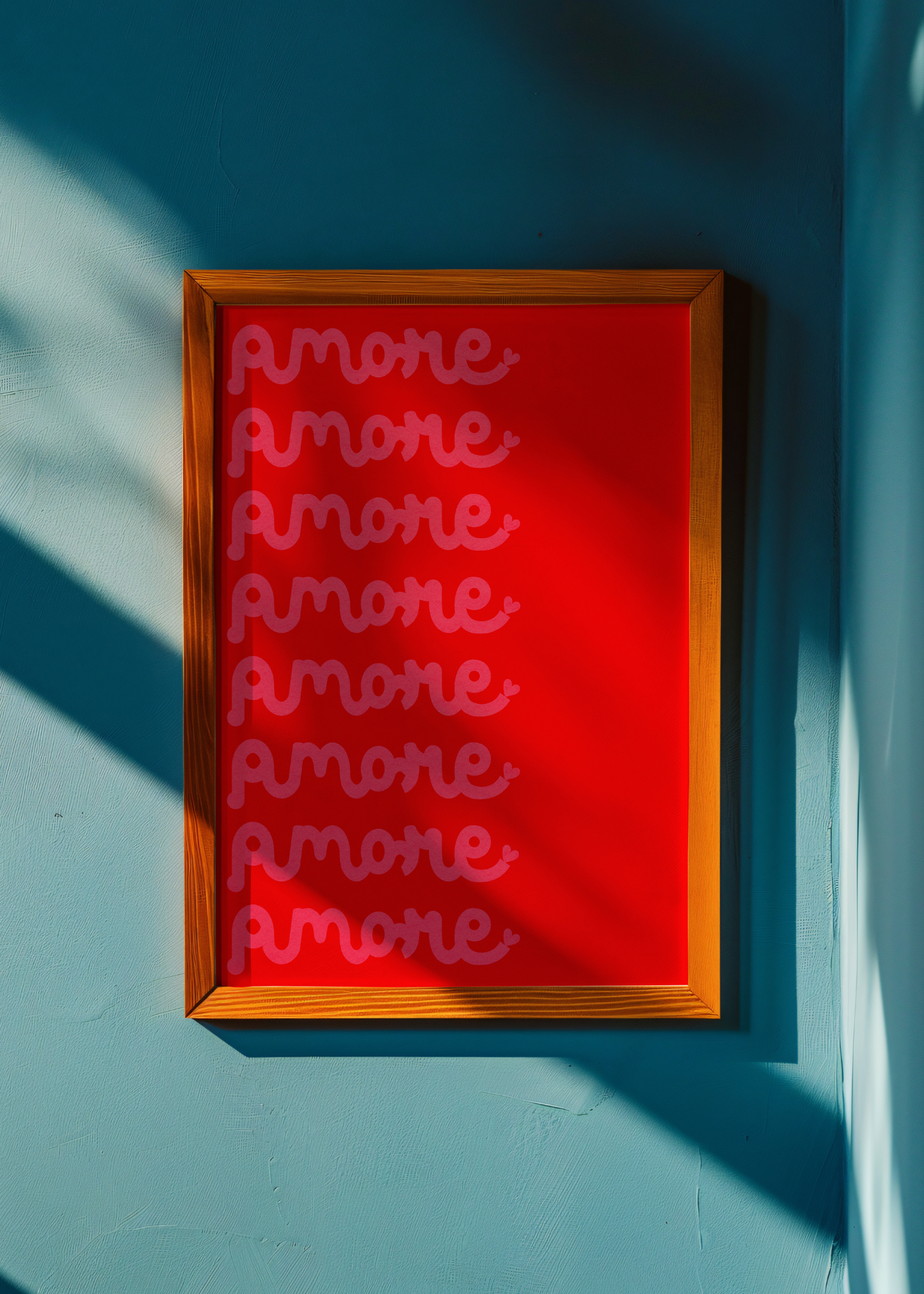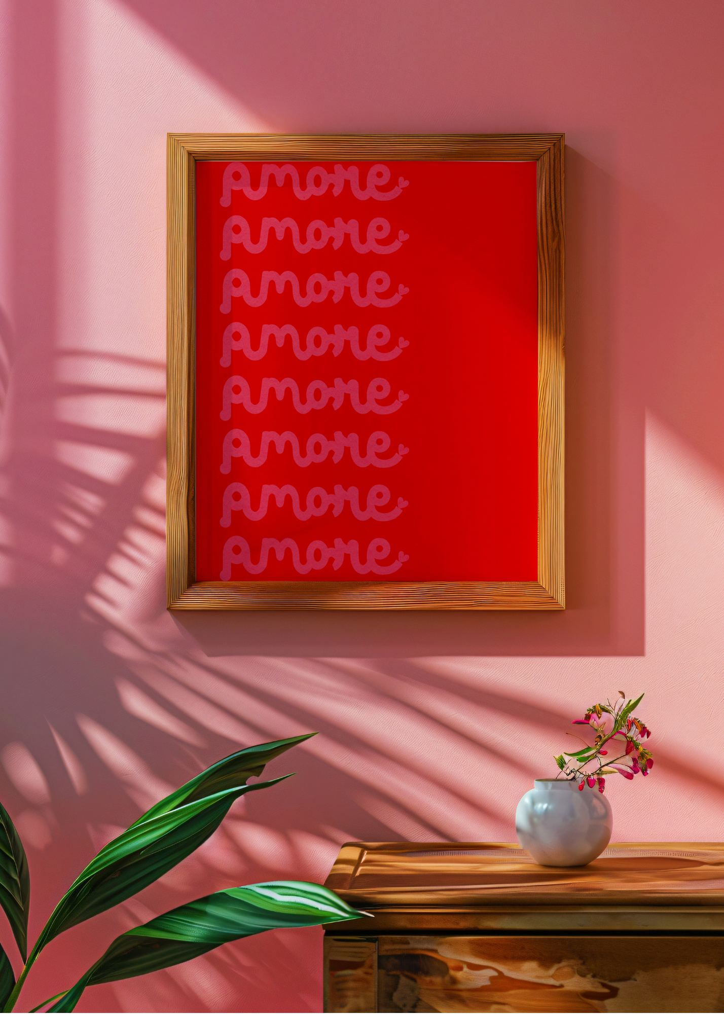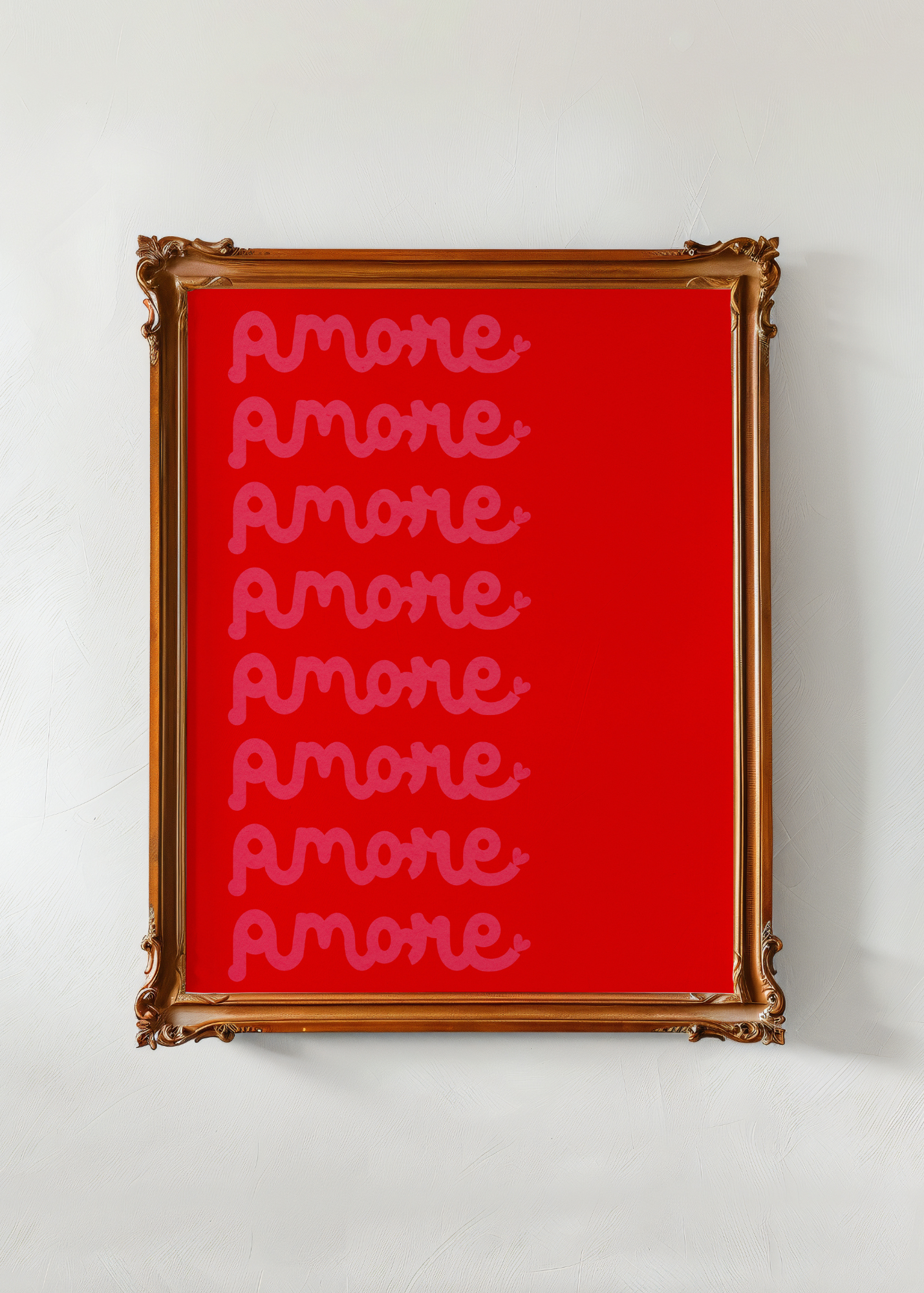 Amore Amore— A bold and joyful love letter in repeat—in a cascade of color and rhythm, Amore Amore pulses with playful devotion. Repeating in bold, lettering, the word unfurls like a love song on loop. Simple, loud, and undeniably fun, this print is a celebration of love in all its giddy, electric, unapologetic glory. With a crimson backdrop and rose-toned script, this piece radiates warmth, charm, and a fearless kind of tenderness.