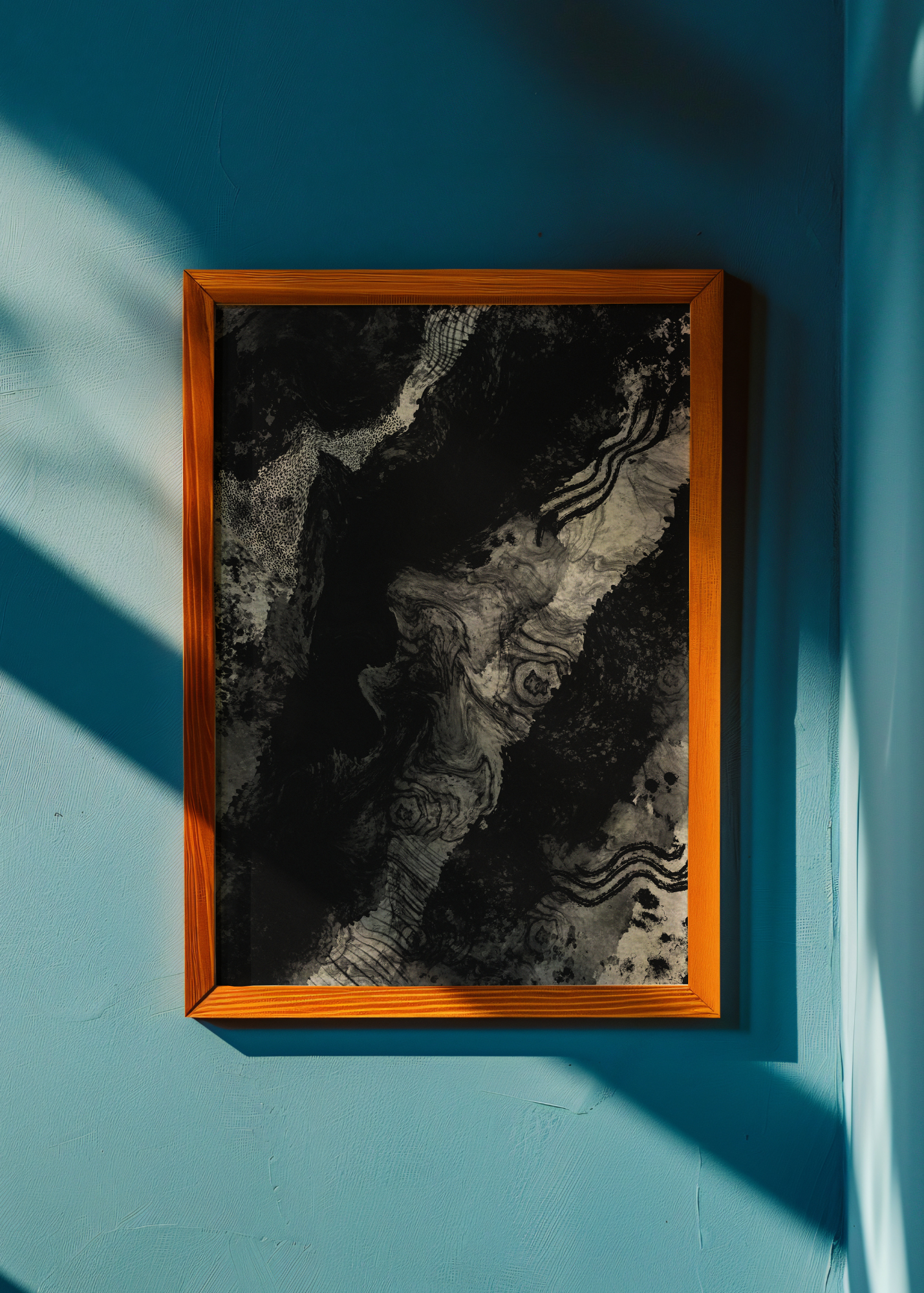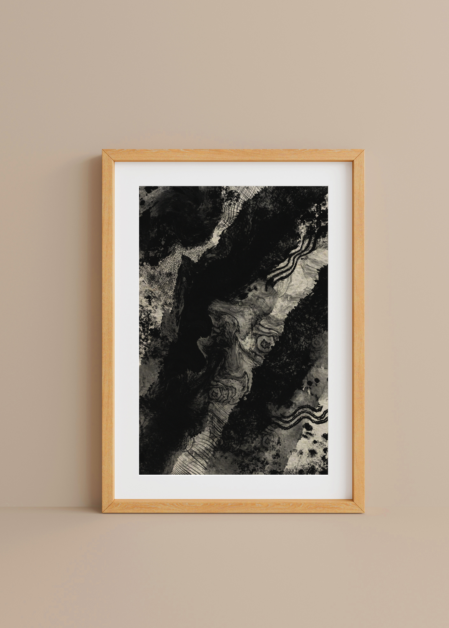 Cosmos Abstract— An original piece, this textured exploration in black and white drifts between softness and shadow — like a galaxy woven from fabric and light. With its bold contrast and flowing form, it invites reflection, interpretation, and calm. A versatile work that adds quiet depth to any space.