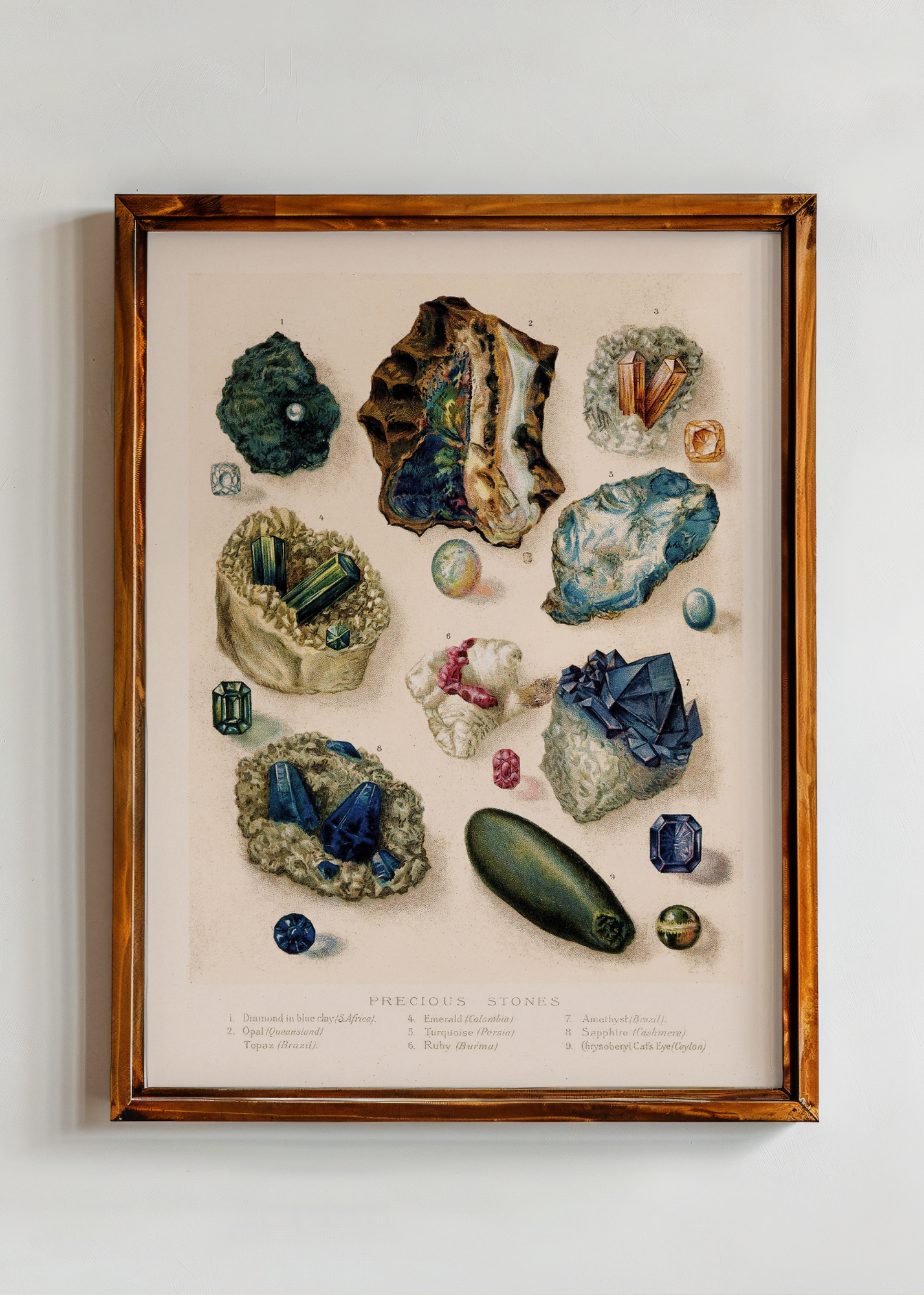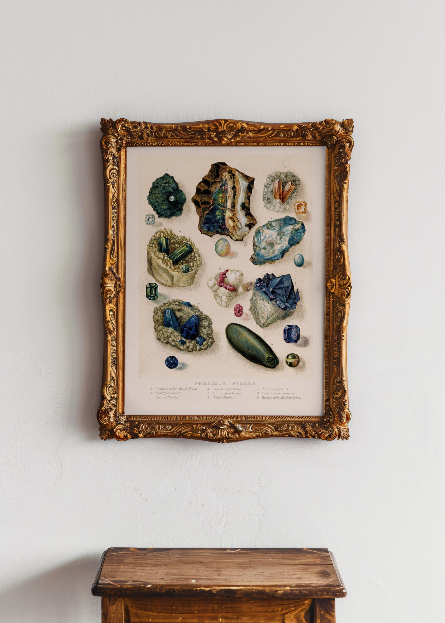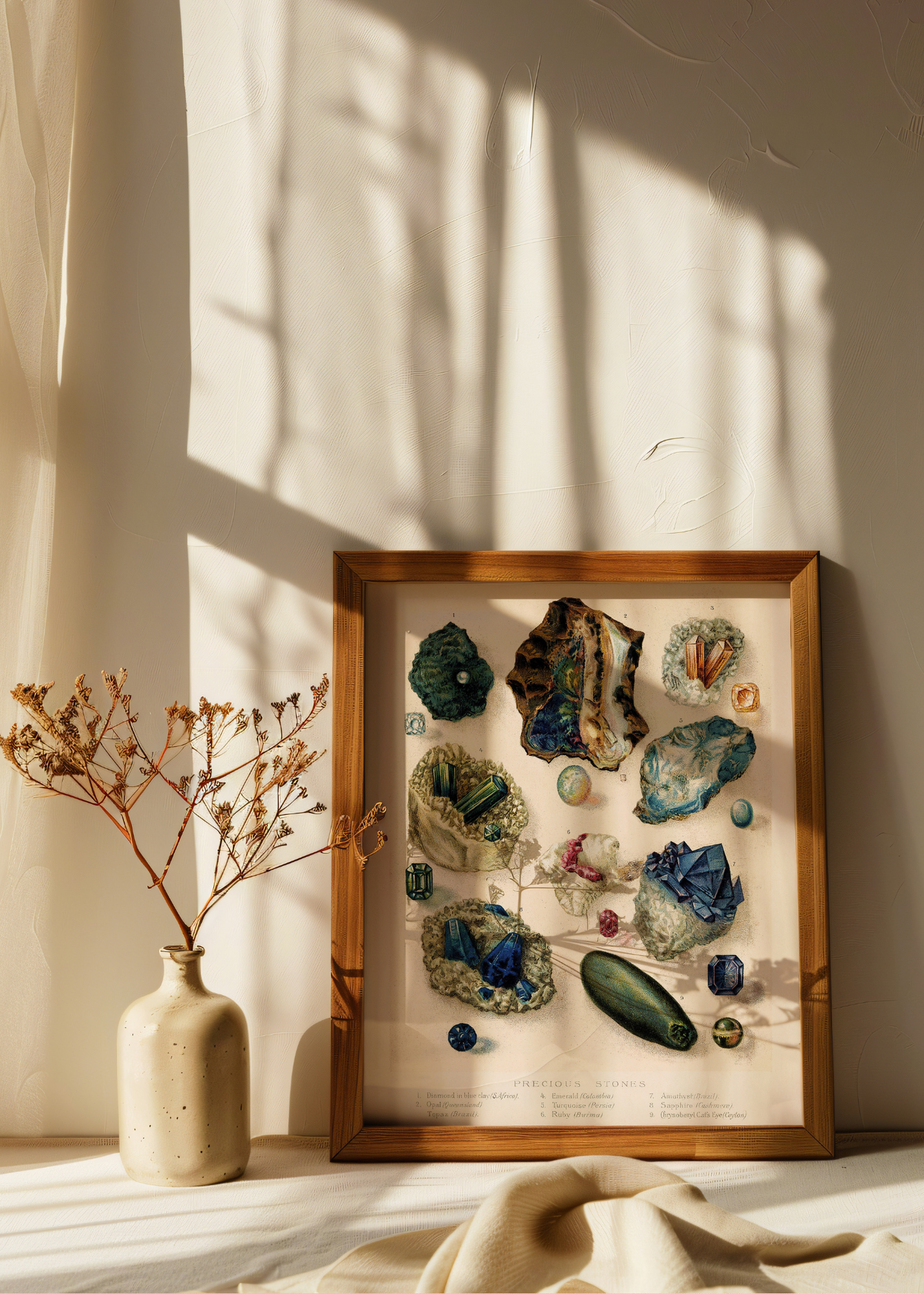 Geology: Various Crystalline Substances— On a pale, creamy canvas, glittering gems and minerals gather in a delicate arrangement—each stone an intimate portrait of Earth's hidden architecture. From clear quartz clusters and honey-hued calcites to velvety malachite and smoky agates, “Various Crystalline Substances” is a celebration of the silent geometry locked within natural forms.