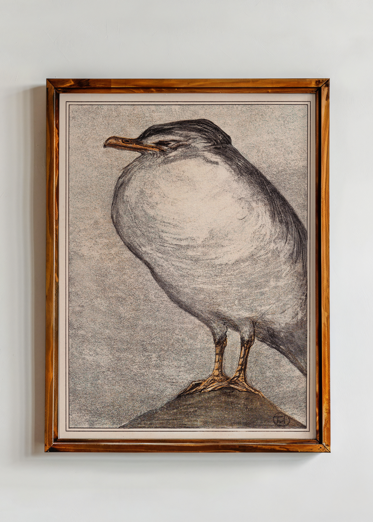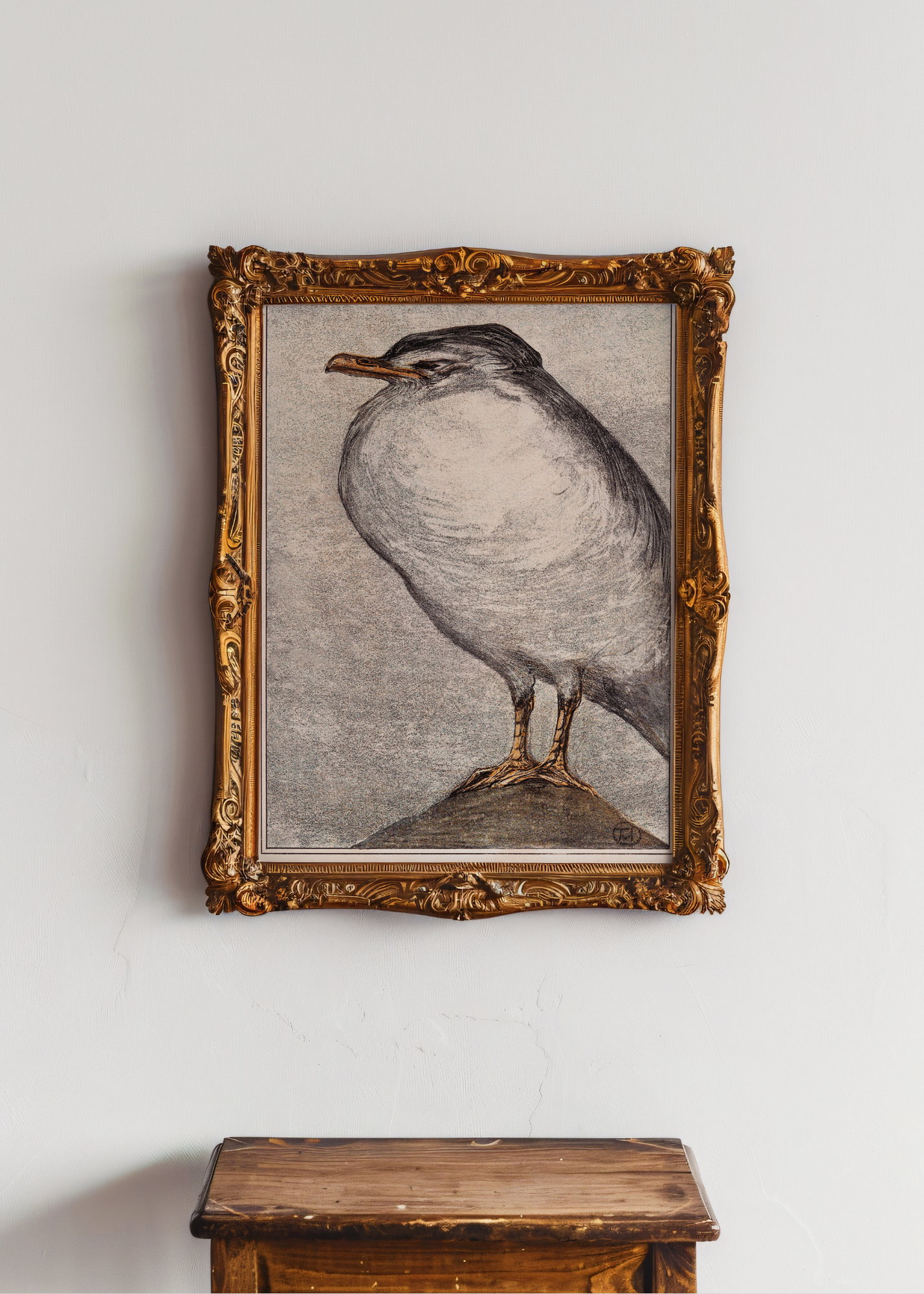 Herring Gull— With wings outstretched against an unseen sky, Herring Gull drifts in stillness and grace. Theo Van Hoytema captures the essence of the silver gull with quiet reverence— its delicate lines and subtle motion echoing the hush of sea air and distant tide. There is a softness in the form, a tenderness in its solitude, as if suspended in a breath between moments. In this print, time slows, and the ordinary becomes lyrical— etched in the calm of Van Hoytema’s thoughtful hand.