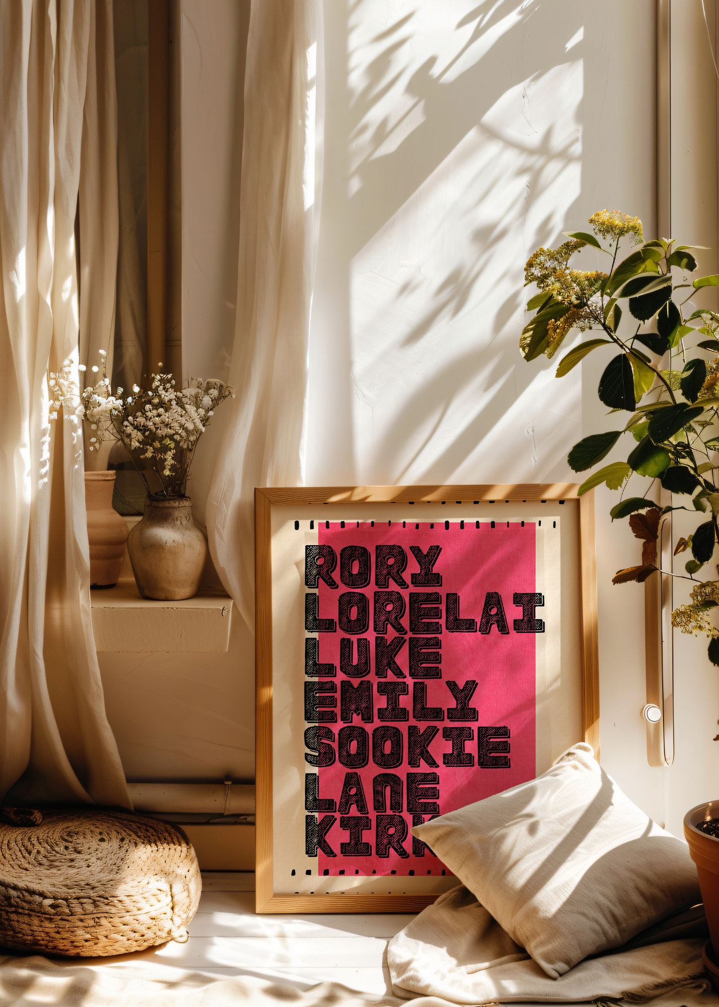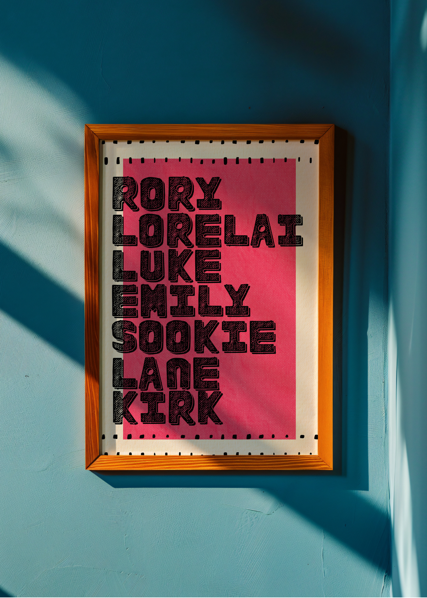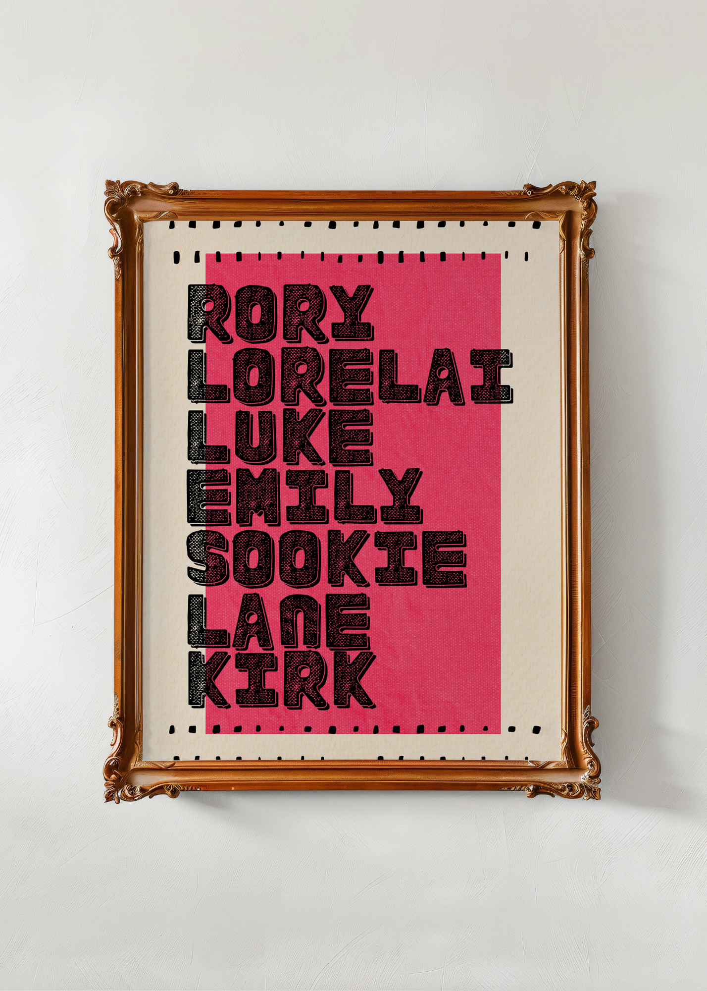 Stars Hollow Cast— Set against a bright pink backdrop bursting with personality, this original design is a joyful homage to the unforgettable cast of Gilmore Girls. Featuring the names—Rory, Lorelai, Luke, Emily, Sookie, Lane, and Kirk—each letter dances in a fun, funky font, echoing the charm and quirk of the show’s beloved world. Bold, cheerful, and full of heart, this print is a vibrant celebration of the characters who made Stars Hollow feel like home.