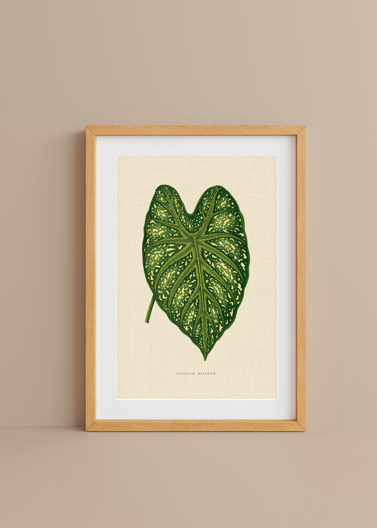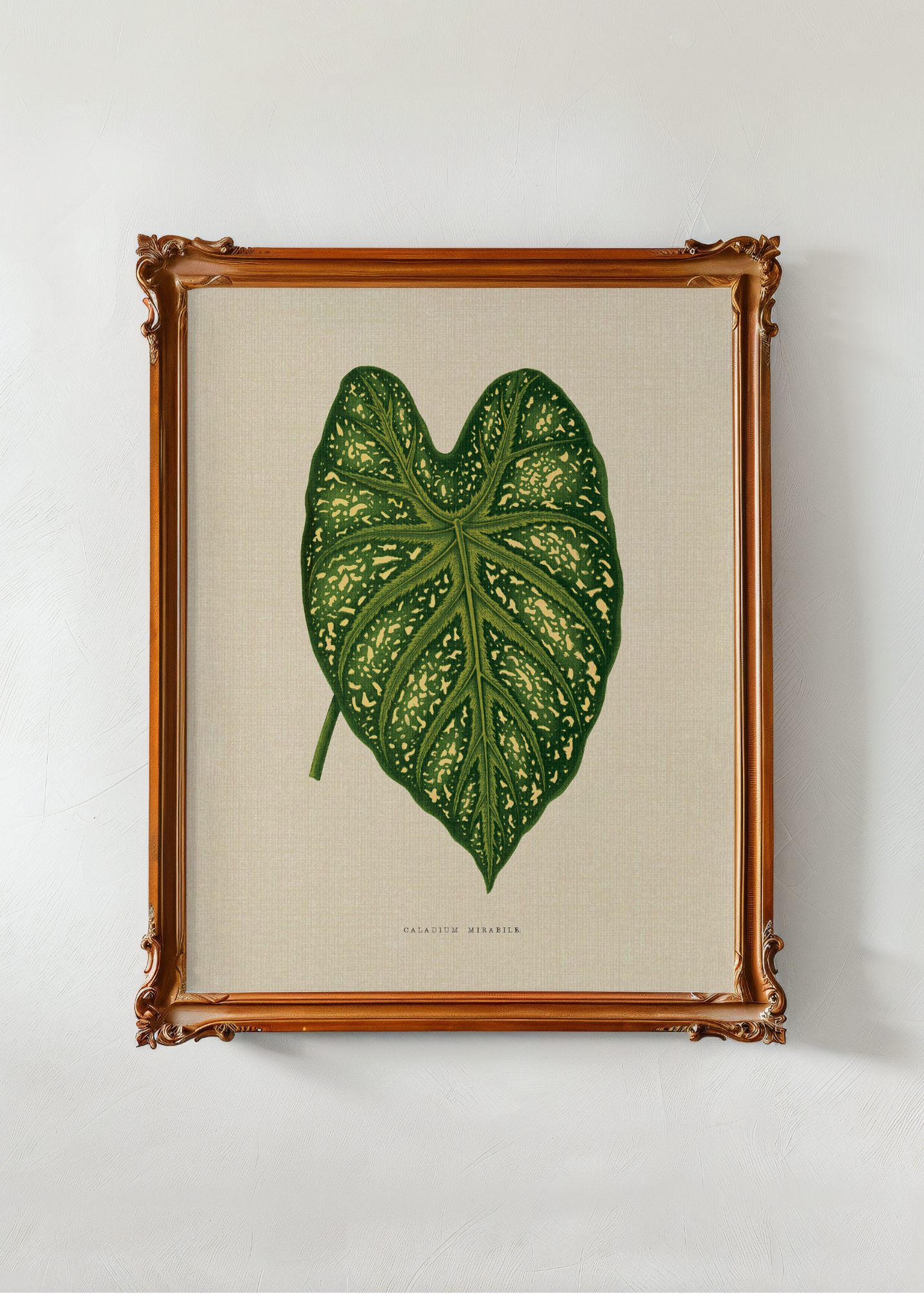 Caladium Mirabile— In Caladium Mirabile, Charles Antoine Lemaire unveils a botanical marvel that feels both earthly and otherworldly—a leaf sculpted by nature’s whimsy, radiant with patterns that dance between shadow and light. Each vein weaves a story, tracing delicate paths of pale cream against deep emerald, as if sunlight itself has been distilled and captured within the leaf’s heart.