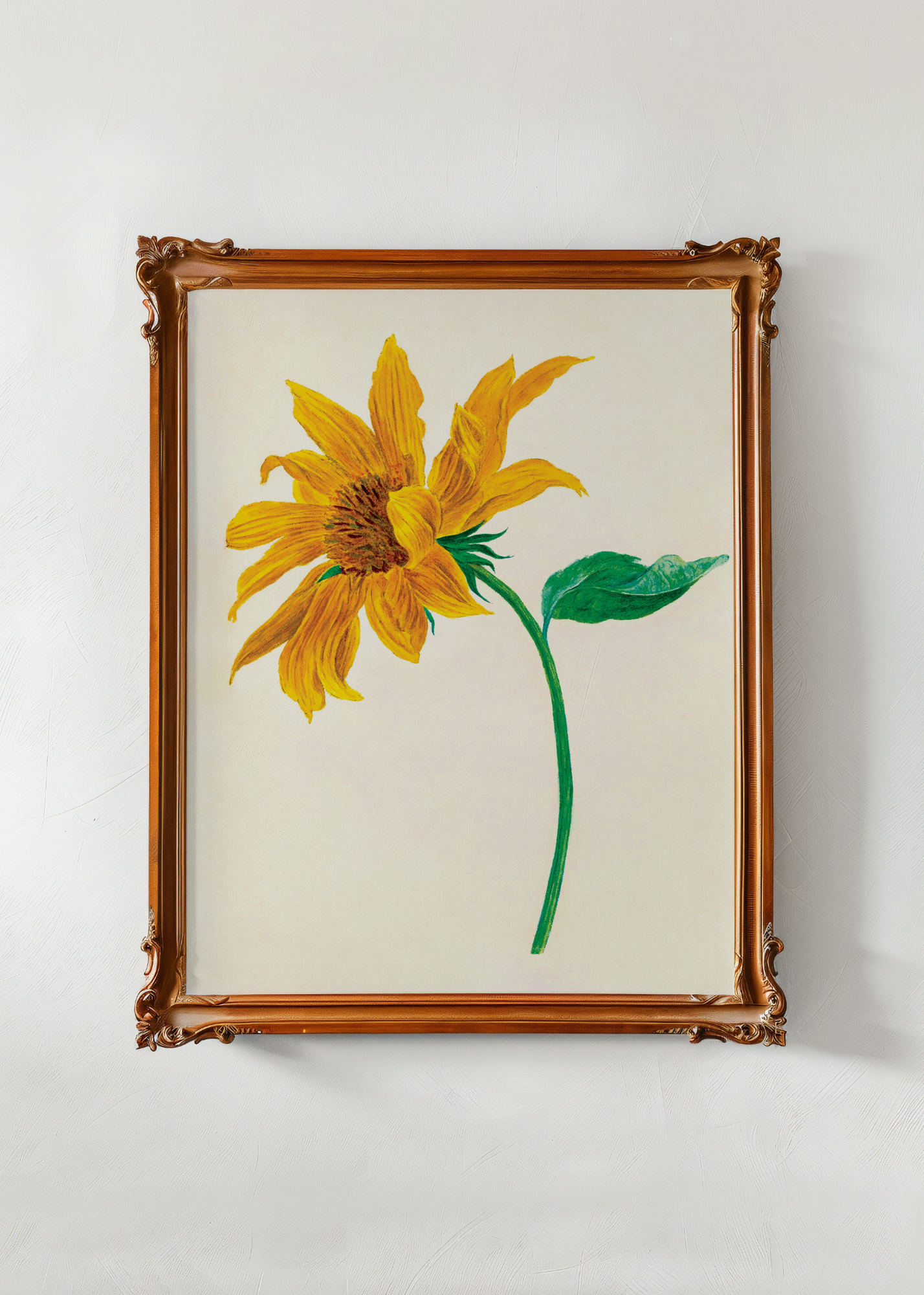 Branch with a Sunflower— In Branch with a Sunflower, Michiel van Huysum transforms botanical illustration into a luminous act of devotion. The sunflower, bold and radiant, stretches across the composition like the sun itself made floral—its petals unfurling in golden arcs, its center dense with shadowed depth. Leaves twist and curl in a vibrant counterbalance, veined with exquisite detail and rich in green vitality. Every element—blossom, stem, leaf—has been rendered with a painter’s joy and a naturalist’s care. This is not just a study of a plant, but a portrait of exuberance, of sunlight captured in pigment, and of nature’s tendency to reach always toward brightness.