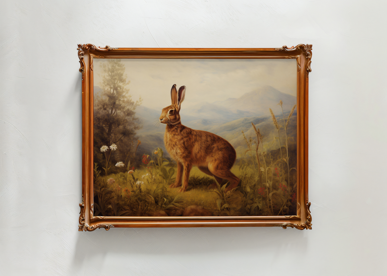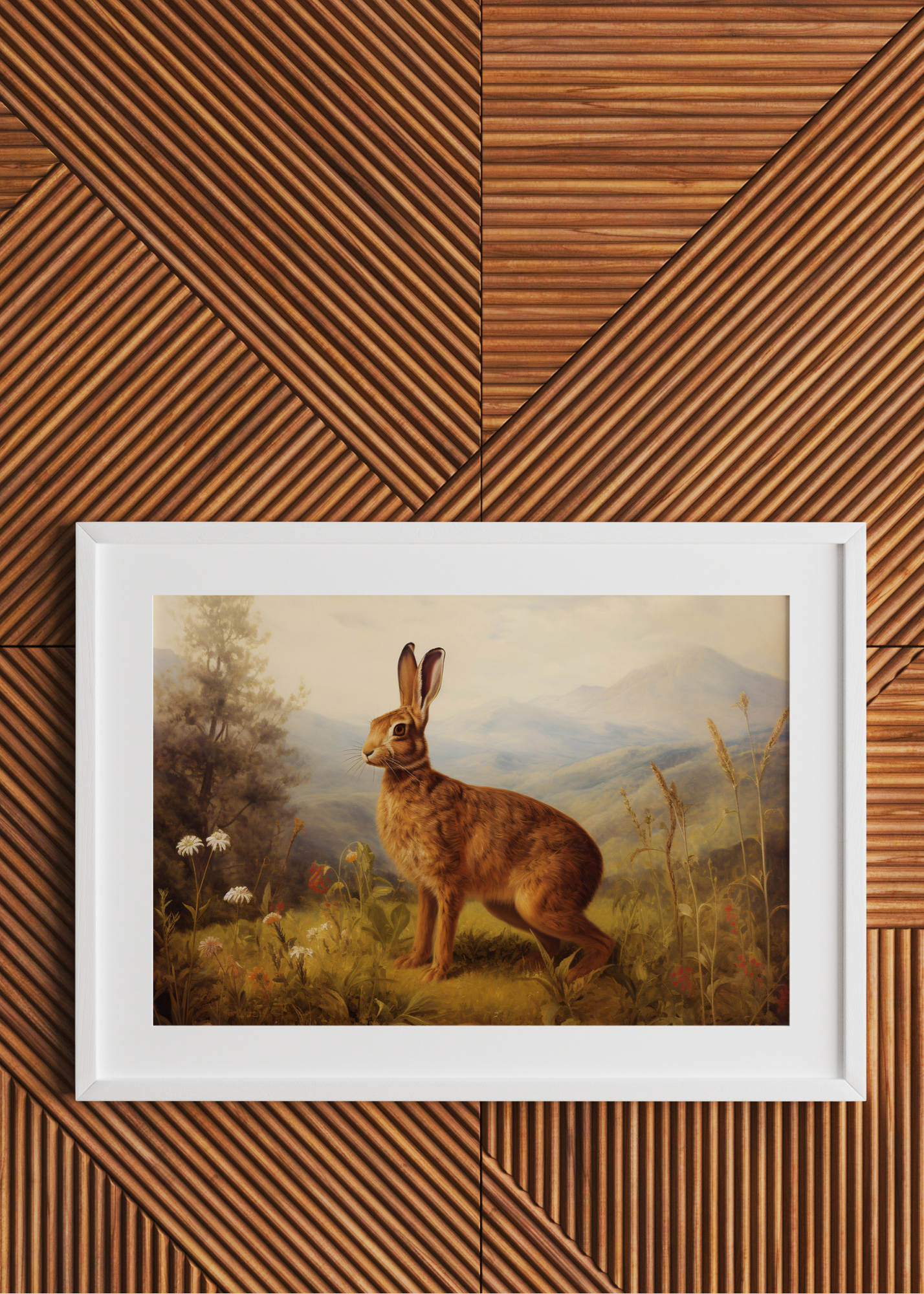 Mountain Meadow Magic— A hare stands against a backdrop of rolling blue hills, wildflowers in bloom at its feet. There’s a gentle strength in its stance, a readiness to leap or simply stay and savor. The sky is kissed with soft clouds, while tall grasses frame the scene with movement and grace. This piece is full of wanderlust and wonder, perfect for sparking stories and grounding hearts.