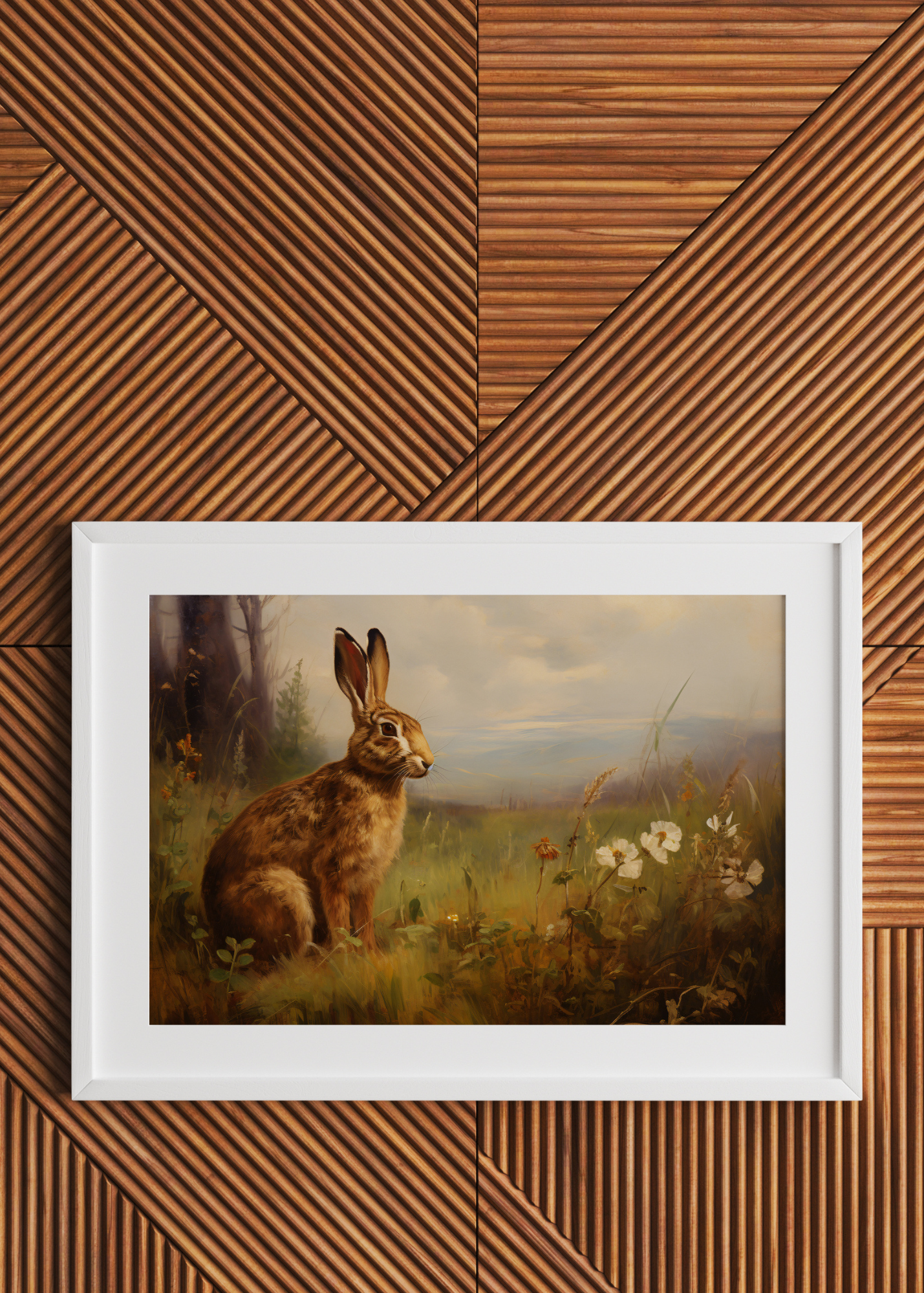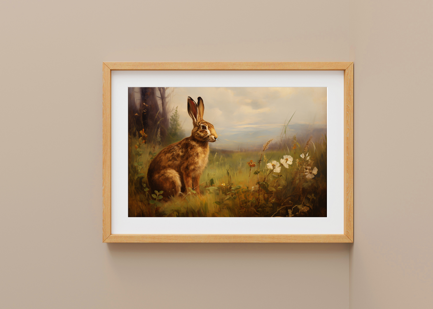 Meadow Morning— A hare stands tall in a golden field, ears perked, gaze curious. You can almost hear the gentle hum of bees and the rustle of the wind through wildflowers. Behind the hare, a landscape of distant hills unfolds beneath a soft morning sky. Every stroke radiates light and warmth, from the tender eyes of the hare to the wild blooms that surround it. This piece is an ode to stillness, the beauty of presence, and the calm that comes with returning to nature.