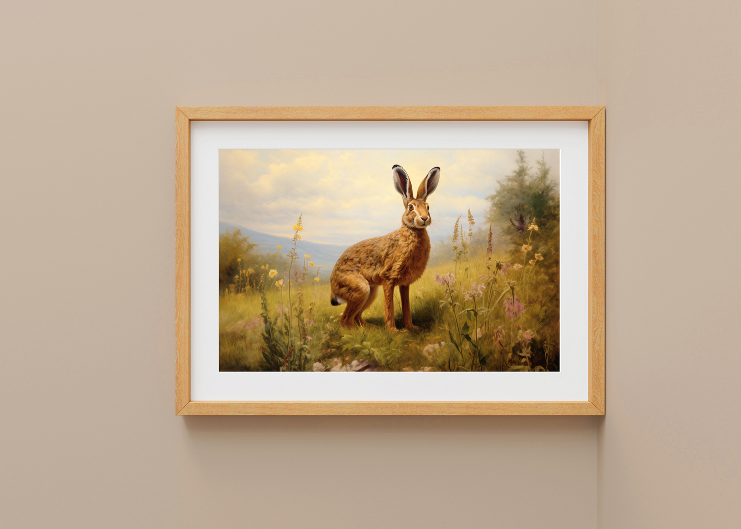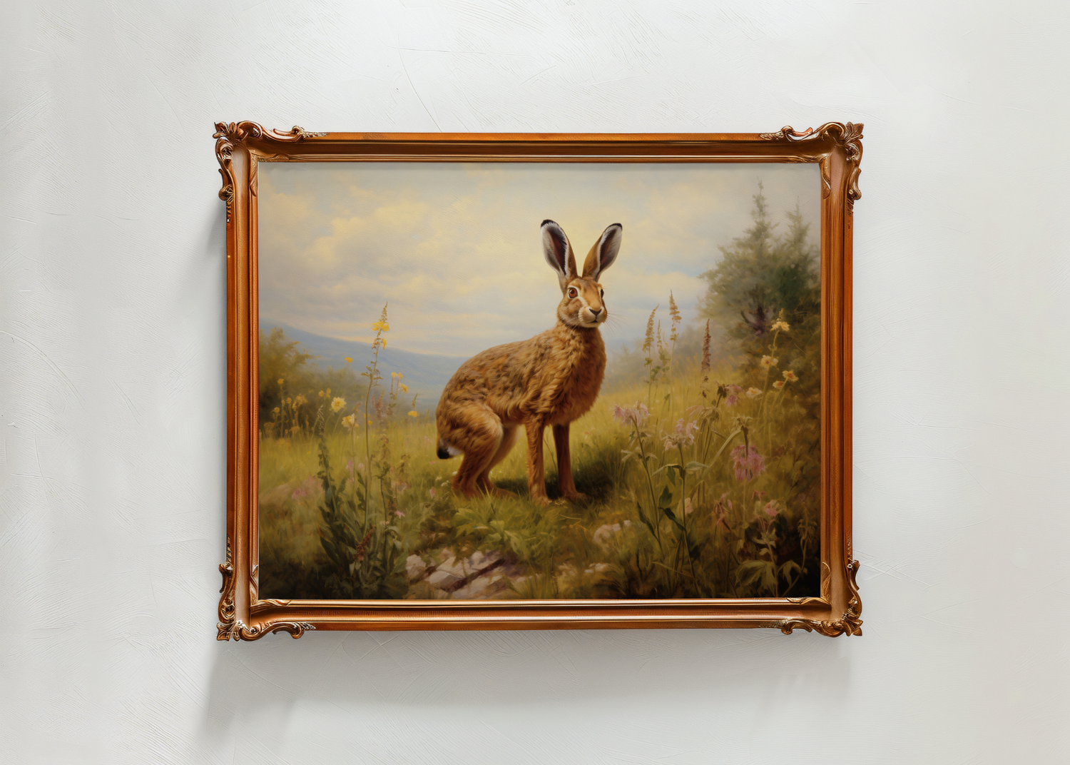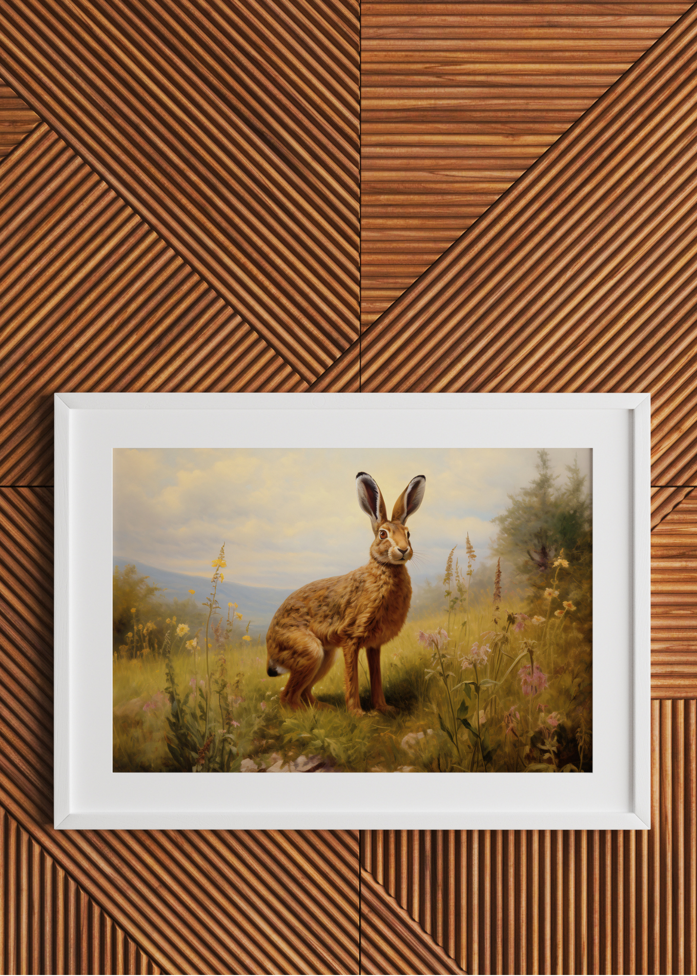 Wildflower Hare— This hare, nestled in a summer field thick with white blooms and tall grasses, feels like a guardian of twilight. With a thoughtful expression and fur catching the golden light, it rests among wildflowers as a soft breeze drifts through. The slightly misty background offers hints of a world beyond— quiet, rolling hills and whispering trees. It's a love letter to slow moments, sun-warmed fields, and stories that begin at dusk.