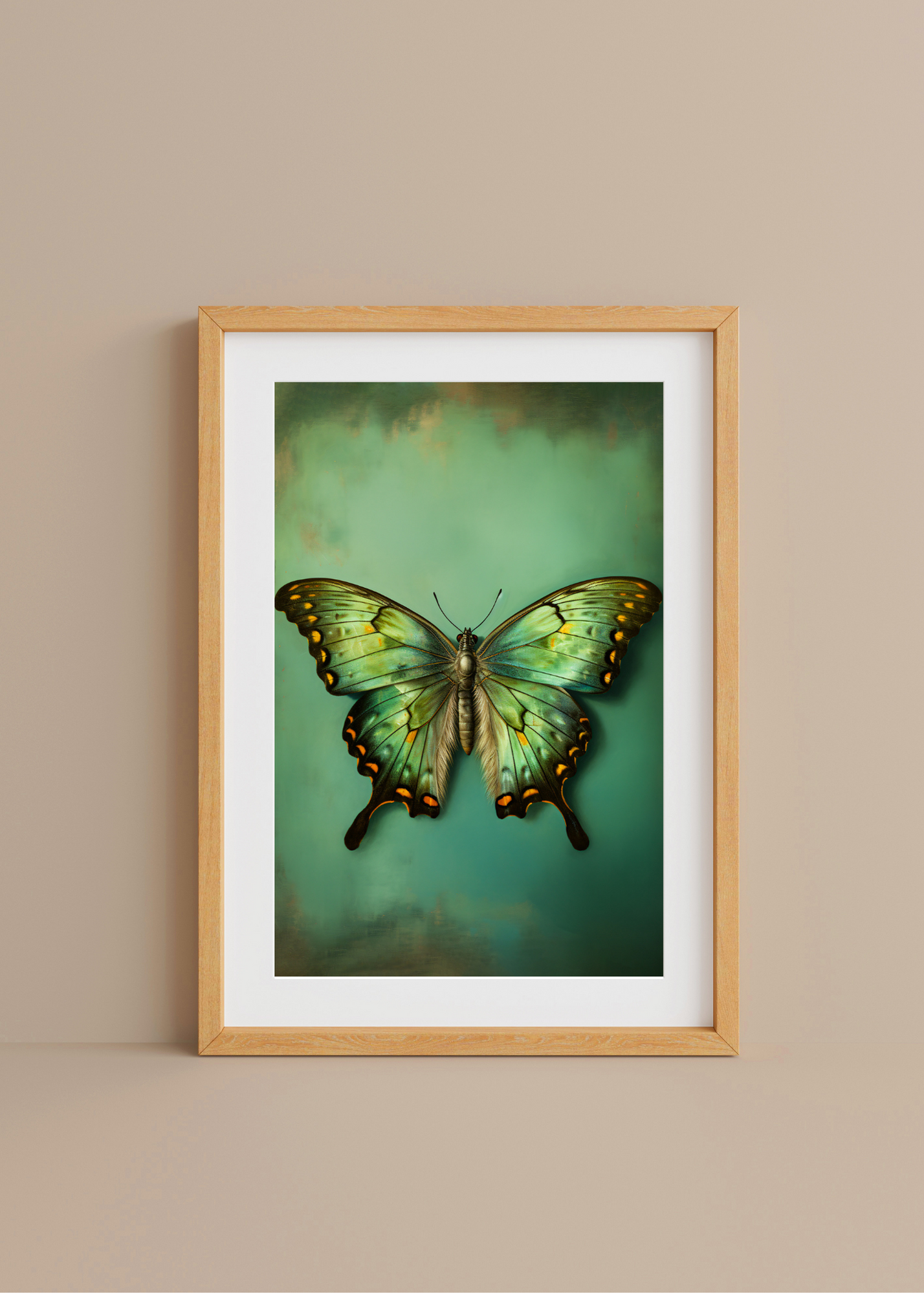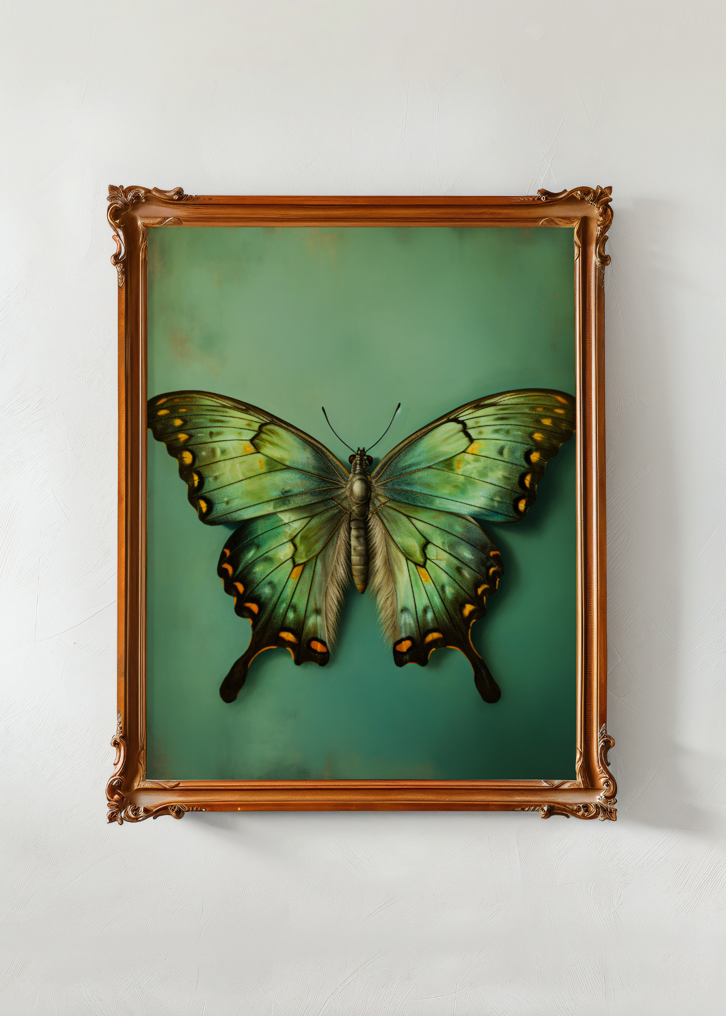 Emerald Stillness— Bathed in velvety shades of teal and jade, this enchanting butterfly feels like it’s paused mid-glide through a sun-dappled glade. Iridescent green wings stretch outward with touches of amber and soft obsidian, every shimmer like a whisper of magic. The rich background seems to hum with a forest hush, making this piece feel alive—tranquil, grounded, and ever so slightly ethereal. A gorgeous companion for daydreamers and quiet corners.