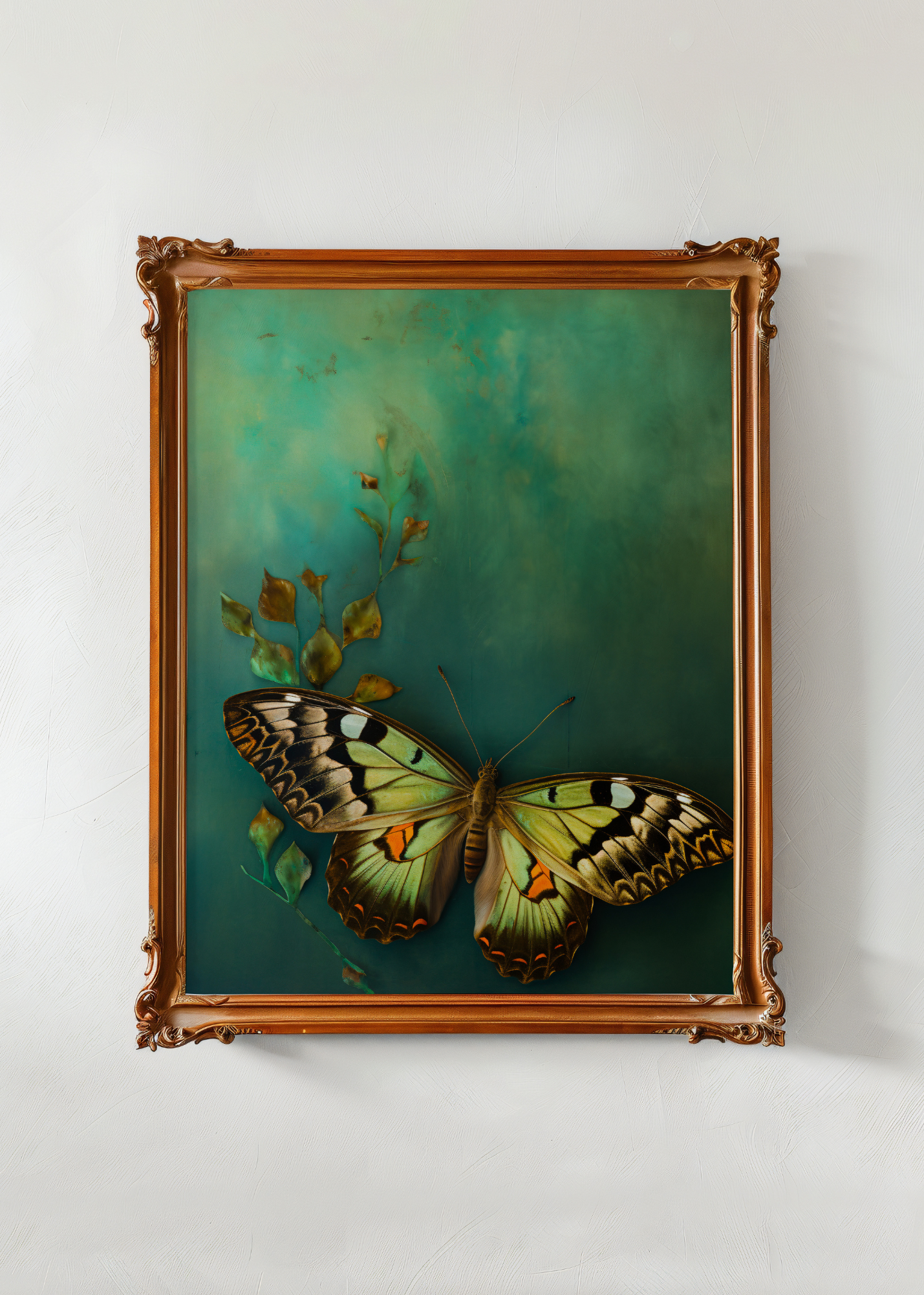 Green Whispers— Like a secret garden pressed between pages, this butterfly rests amid delicate gold and green stems. Its wings are kissed with soft citrus and smoky black, as if echoing the colors of dusk-touched wildflowers. The background melts in watercolor swirls of moss and aquamarine, evoking the gentle mystery of a hidden grove. A graceful piece for those drawn to the poetic and the peaceful.