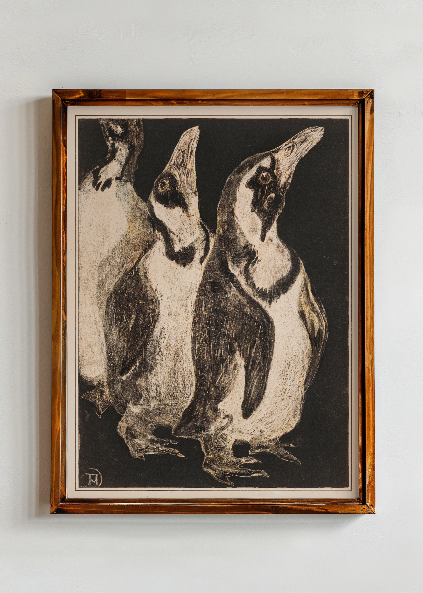 Three Penguins— Theo van Hoytema captures a gentle, wintry charm in Three Penguins, where these endearing figures stand close as if sharing warmth against the cold. Their rounded forms and softly rendered feathers give them a quiet elegance, each one slightly turned in posture, suggesting a subtle story told in glances and tilts. The background is sparse, allowing the focus to rest entirely on the companionship between them. There is something comforting in their stillness, something almost meditative. Van Hoytema, with his characteristic tenderness, presents not just birds, but a portrait of quiet togetherness, of soft endurance, and the sweet, wordless bonds found in shared silence.