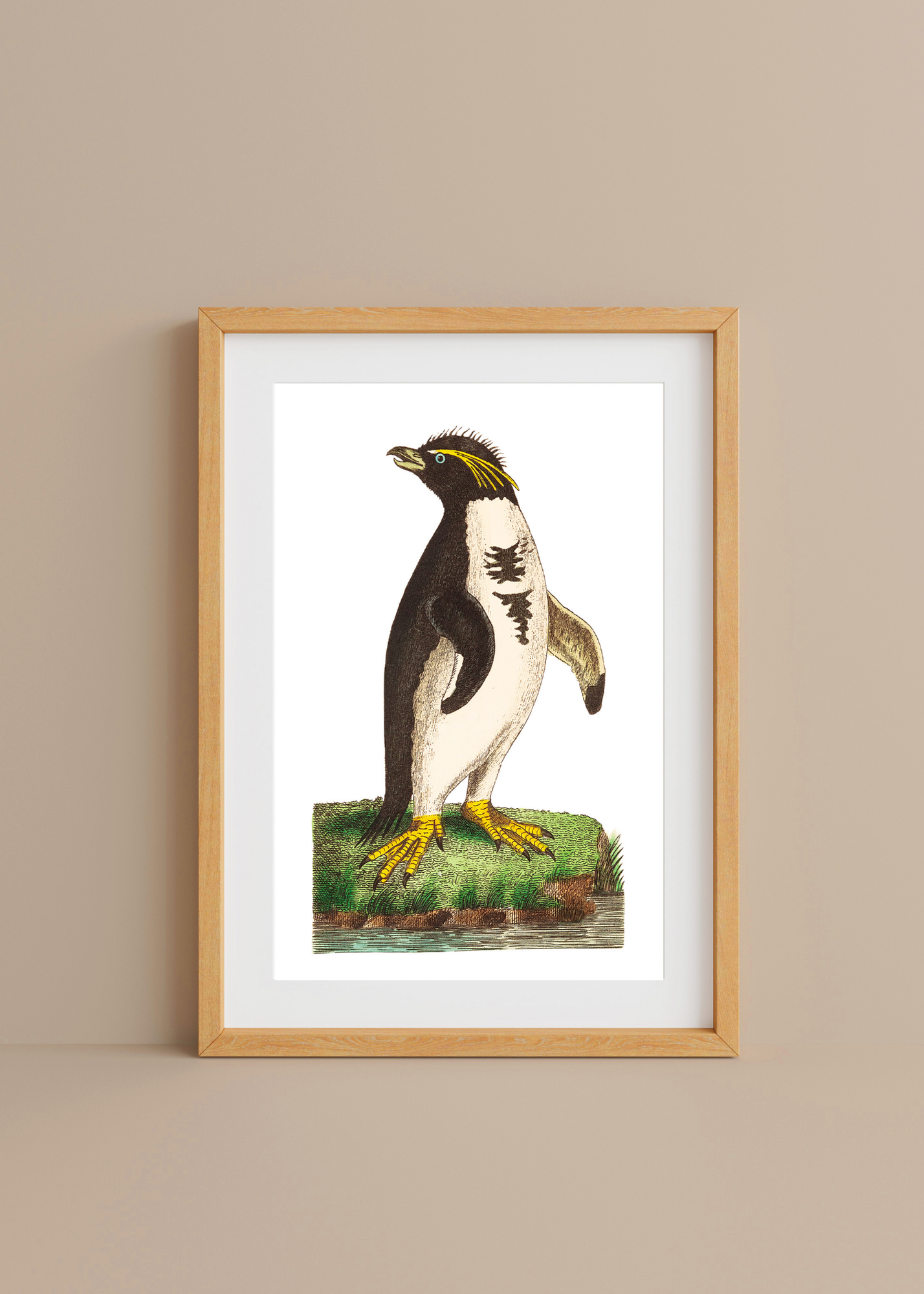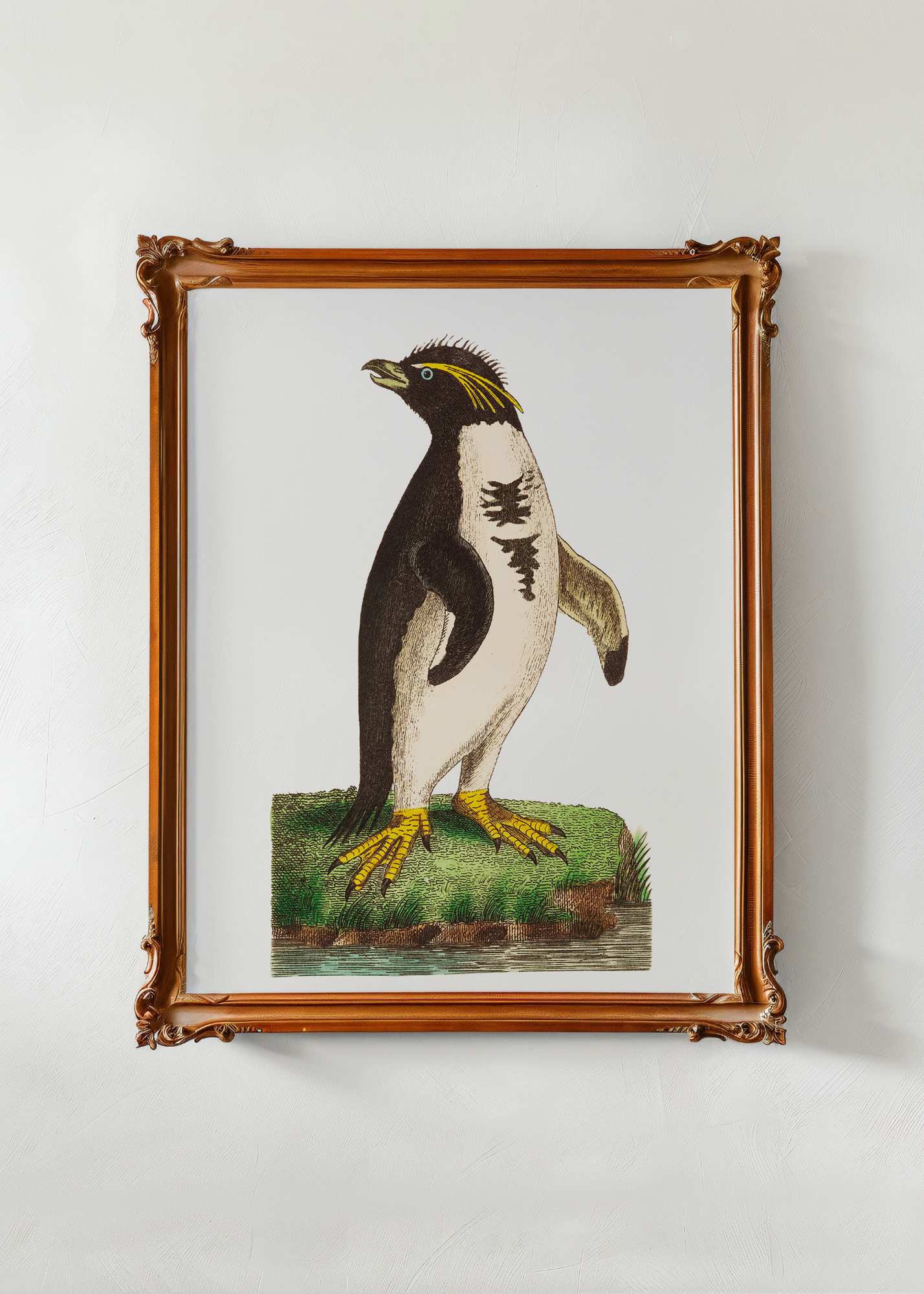Crested Penguin— Perched upon a ledge of stone and sea air, the Crested Penguin stands in quiet dignity, its feathered crest arcing like a crown of golden quills against the cool simplicity of its monochrome form. Captured in the elegant detail of 18th-century natural history, this portrait speaks not only of taxonomy, but of admiration—for the strange majesty that lives at the edges of the world.