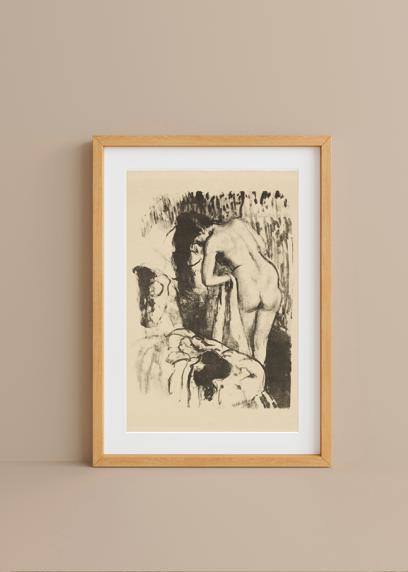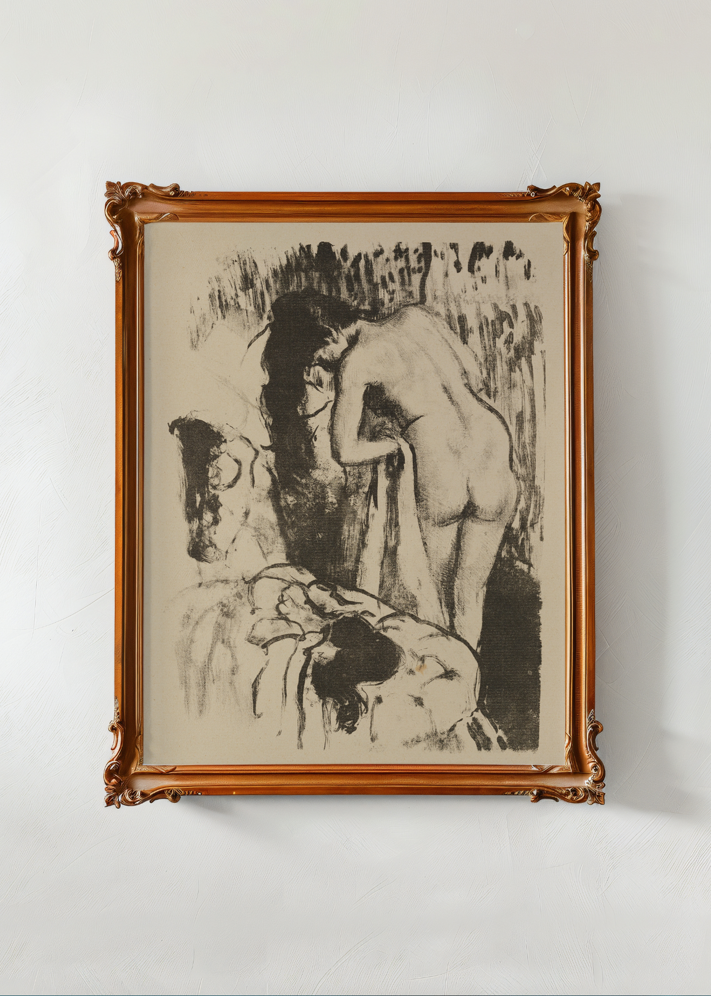 Woman Standing, Drying Herself— Rendered delicately and with confident strokes, Degas’ Woman Standing, Drying Herself is a moment of intimacy caught in quiet reverence. The figure, turned inward, stands in an unguarded pose, one arm lifted in the everyday ritual of drying her skin. There is no gaze toward the viewer, no performance—only the quiet rhythm of solitude and care. Her form, softly contoured and bathed in warm, natural tones, radiates a gentle vulnerability. The background is nearly abstract, allowing her presence to anchor the scene. In this glimpse behind the veil of daily life, Degas captures the beauty of a moment not meant to be seen—tender, personal, and human.