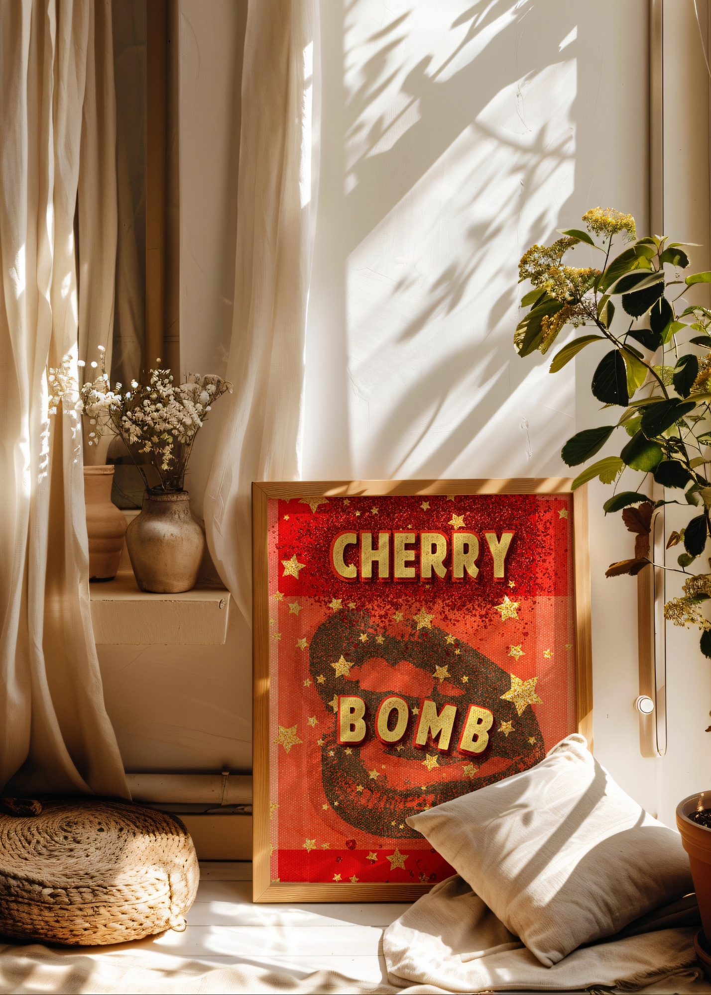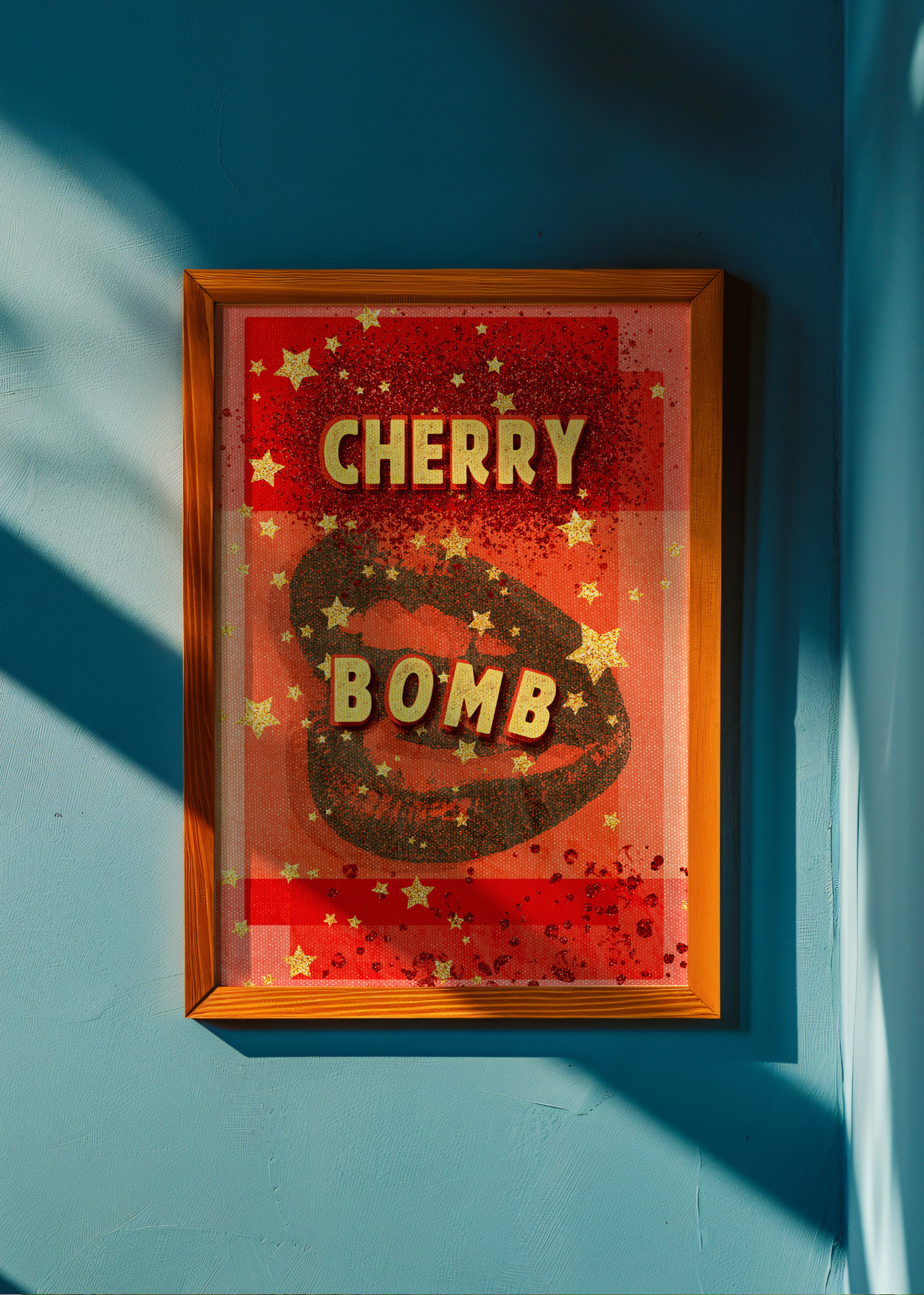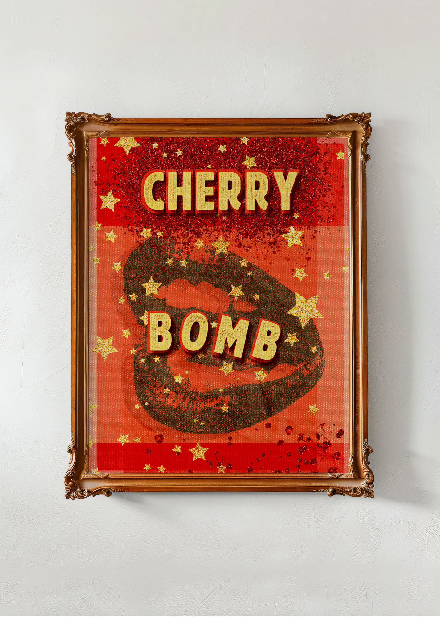Cherry Bomb— This one’s bold, brash, and full of rock-and-roll soul. Layers of hot pinks and reds mingle with painterly textures and dark red splotches, all set aflame by bursts of golden yellow stars scattered across the print like sparks in the night. Hidden in the layers is an open mouth—lipsticked, confident, and fearless—mid-laugh or mid-lyric. Across the center in glittering gold: “Cherry Bomb.” A loud, proud nod to Joan Jett and anyone who’s ever taken up space with unapologetic fire.
