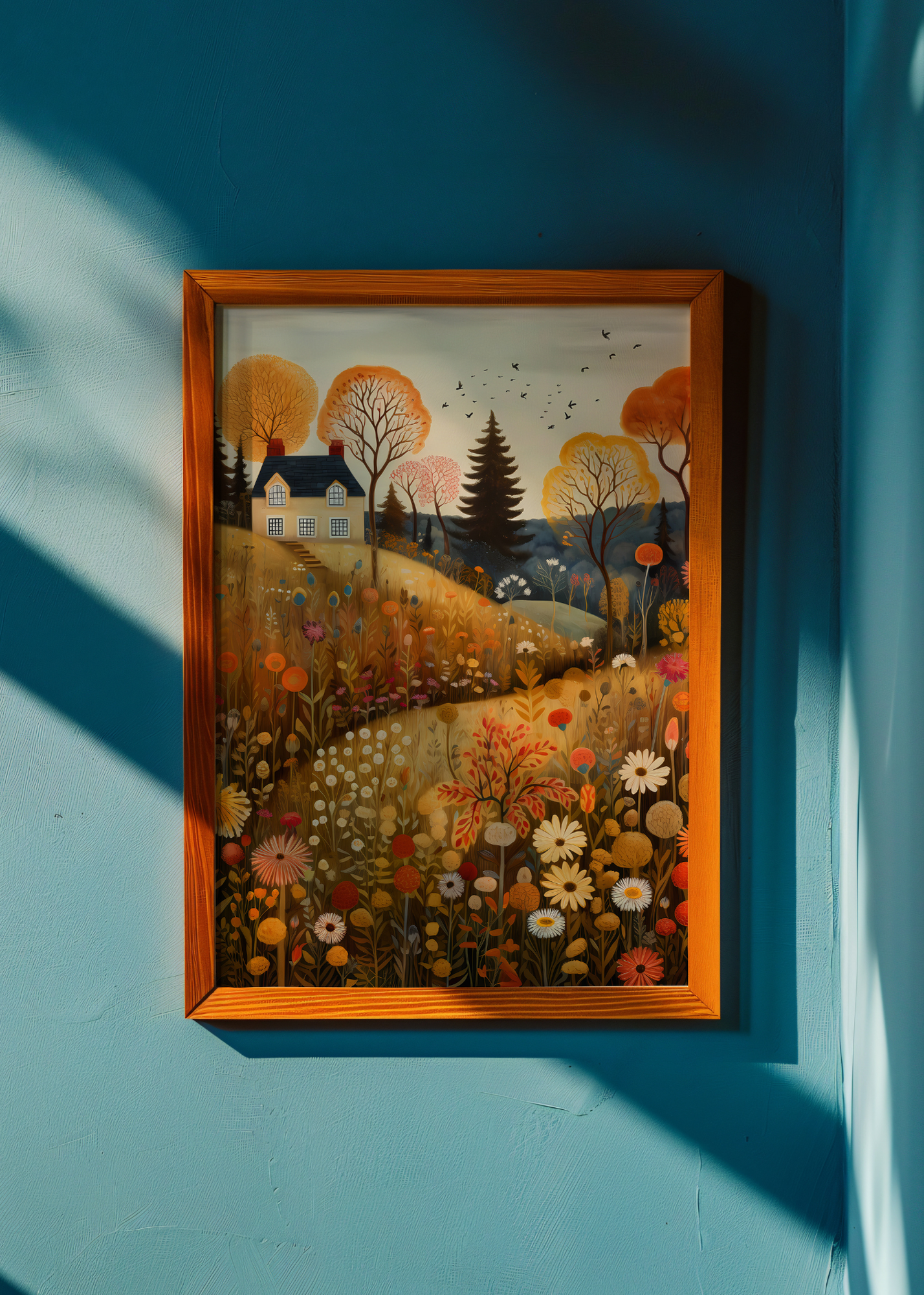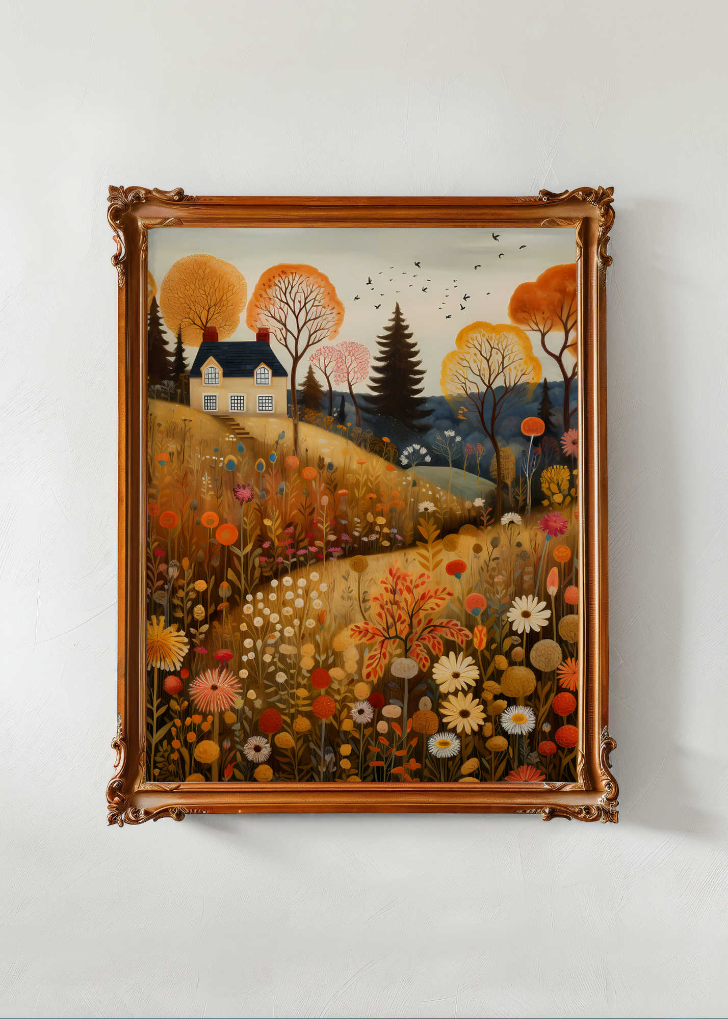 Autumn Whimsy— This whimsical print invites you into a golden-hour fairytale where wildflowers sway like confetti across a rolling hillside. An inviting cottage perches atop a trail that seems to hum with the crunch of leaves underfoot. The amber glow of autumn trees, pops of coral, and dreamy blush-pink blooms give the entire scene a honeyed, cozy feel. It’s a tribute to sweater weather, long walks, and the comfort of coming home.