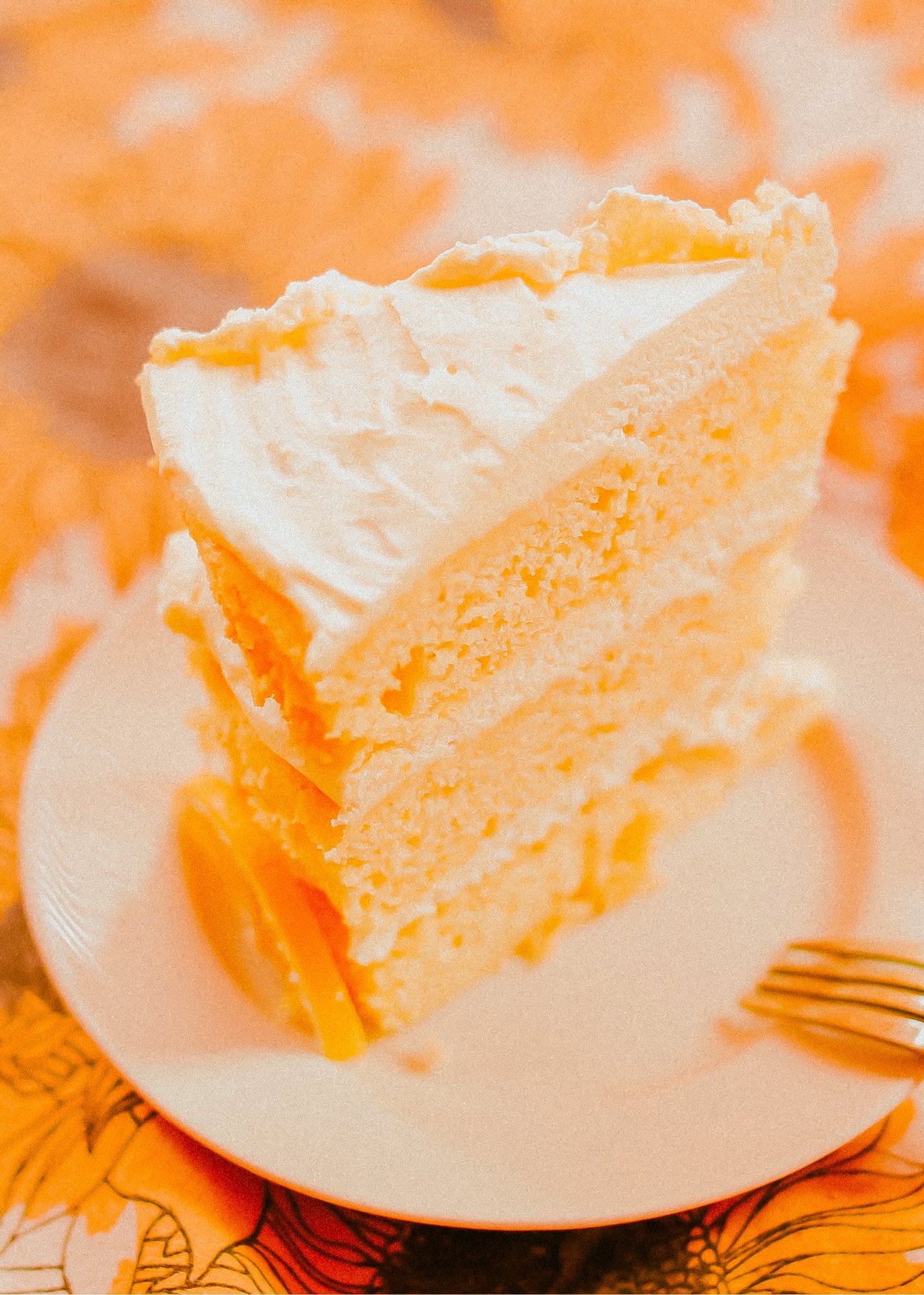 The display case gleams, lined with confections, but one dessert draws you closer. A towering vanilla cake, pale and plush, freckled with real vanilla bean and crowned with a swirl of whipped buttercream, almost too perfect to touch. Almost.