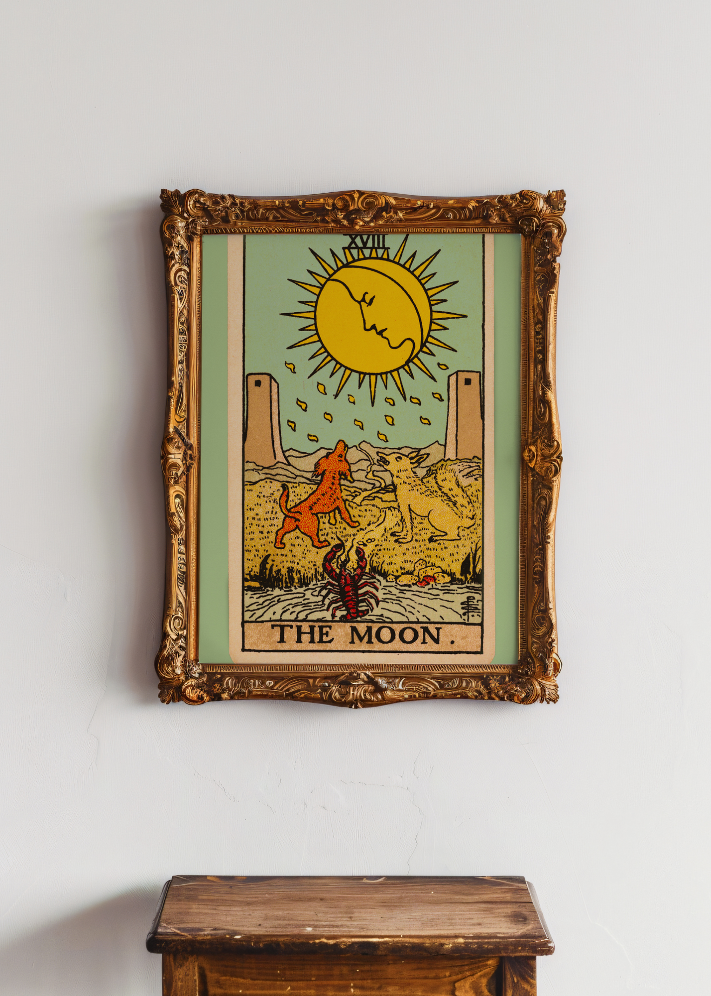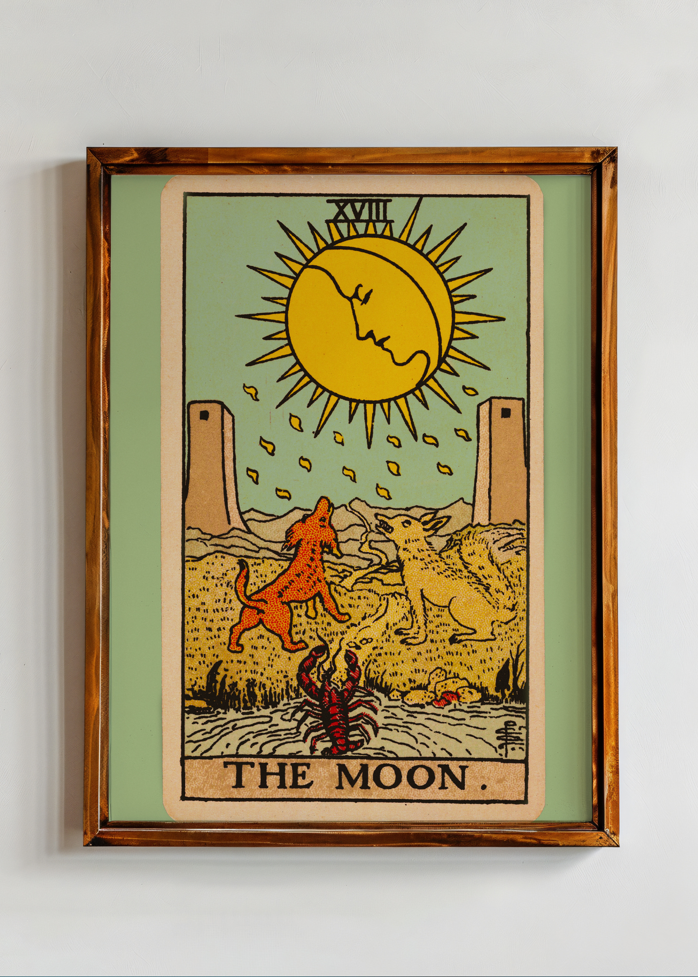 The Moon Tarot— Pamela Colman Smith's rendering of The Moon pulses with quiet mysticism, capturing the essence of uncertainty, intuition, and hidden truths. The moon herself gazes downward, pale and knowing, casting a light that reveals just enough to unsettle. Below, a dog and a wolf raise their heads in mirrored howls, symbols of the tame and wild that dwell within. A small crustacean inches out of the water onto the path, marking the beginning of a strange and personal journey. Two towers rise in the distance, silent sentinels to whatever lies beyond the veil. The palette is muted, the atmosphere dense with meaning, as if the card itself breathes in riddles. This is not a card of clarity, but of feeling one's way forward, guided by instinct and the quiet shimmer of inner knowing.