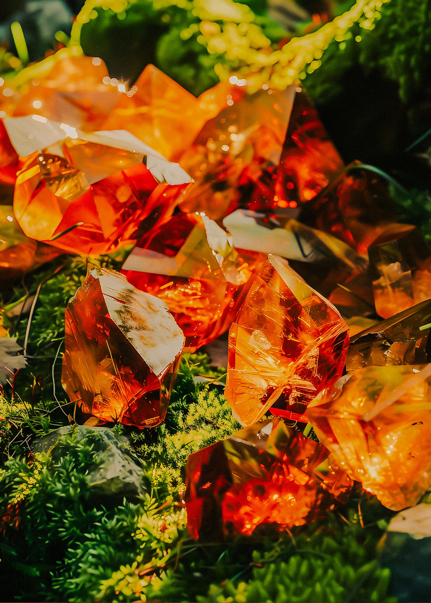 The forest hushes as twilight falls, painting the canopy in dusky amber light. The trees stand tall like ancient sentinels, their bark cool beneath your fingertips, their leaves whispering in a language older than time. The path beneath your feet is softened by a blanket of oakmoss—thick, velvety, and fragrant—its scent rising with each step, rich and earthy like the breath of the forest floor.