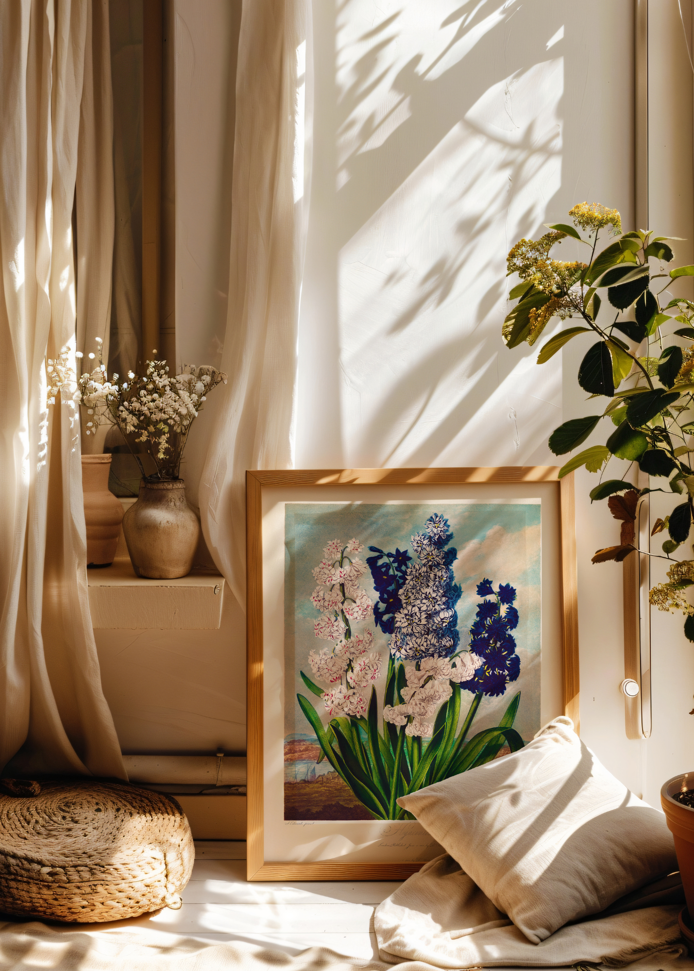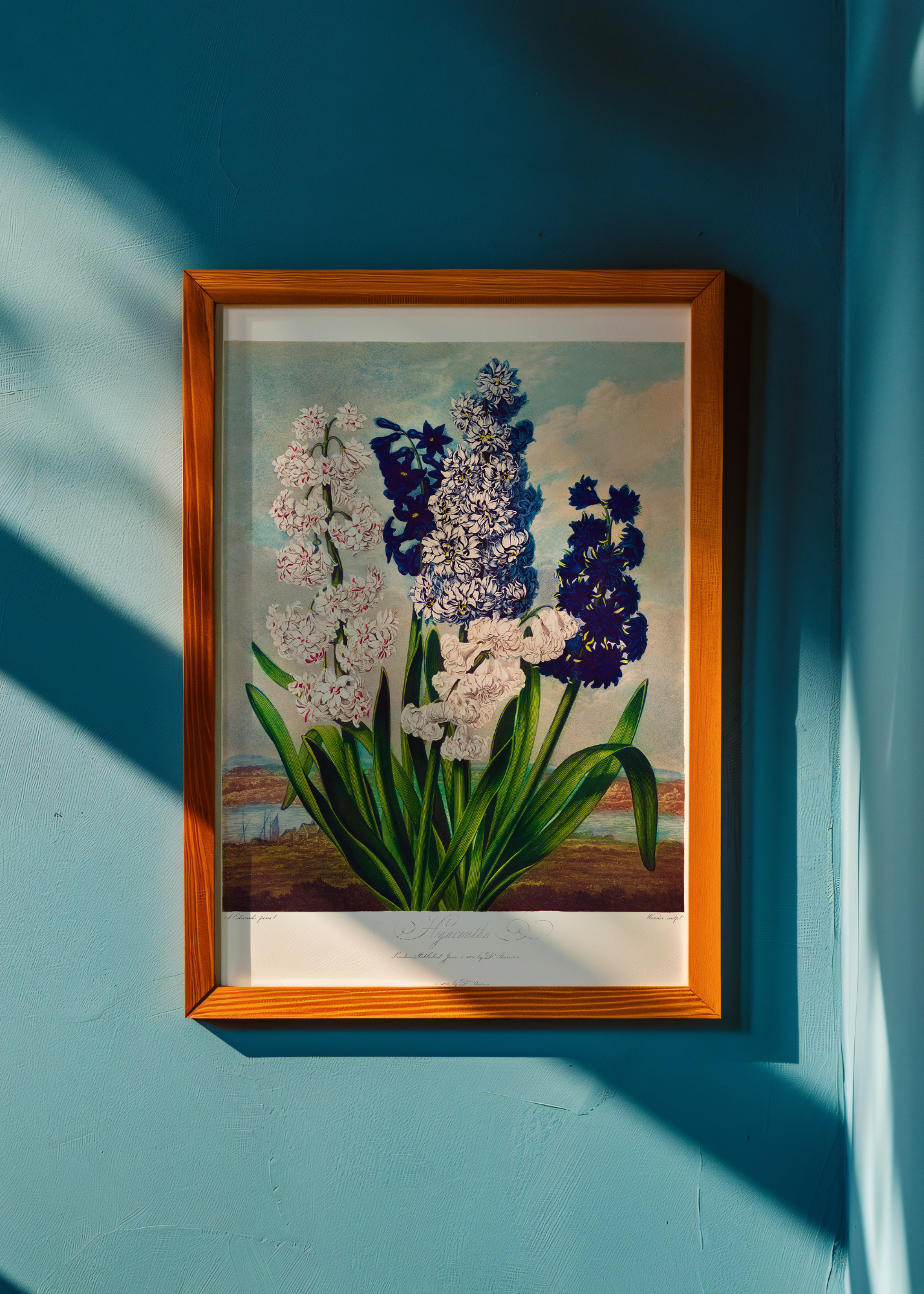Hyacinths by Robert John Thornton is a luminous botanical illustration from The Temple of Flora (1807), a groundbreaking blend of science and romanticism. Known for his richly detailed florals set against dramatic, dreamlike landscapes, Thornton's work remains one of the most iconic botanical series ever published.