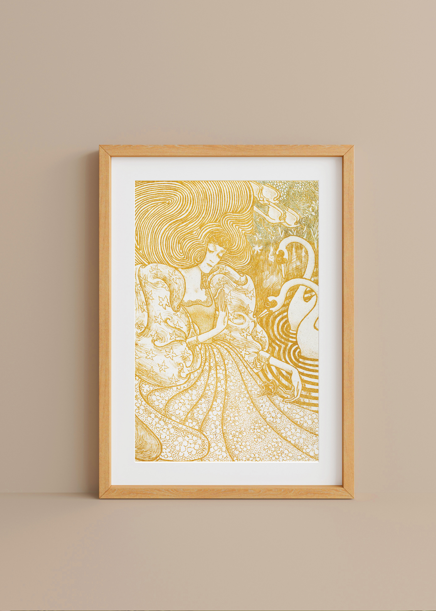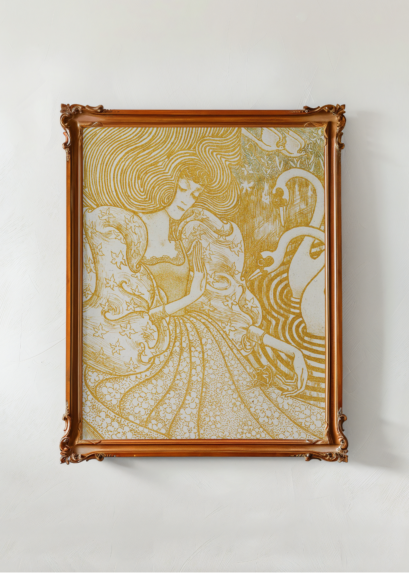 Woman with a Butterfly at a Pond with Two Swans— In this ethereal composition, Jan Toorop invites us into a delicate, symbol-laden world where emotion flows like water. A solitary woman leans gently over a still pond, her gaze resting softly on the surface where reflection and reality blur. Near her hand flutters a butterfly, ephemeral and light as breath, hovering at the edge of touch. Two swans glide serenely across the water, their white forms graceful and mirrored, offering a quiet counterpoint to the figure's inward contemplation. The scene is steeped in Art Nouveau elegance, with flowing lines and organic detail that wrap the moment in timeless stillness. It feels like a dream held gently in waking hands—one filled with longing, transformation, and the sacred hush of nature when it pauses to listen.