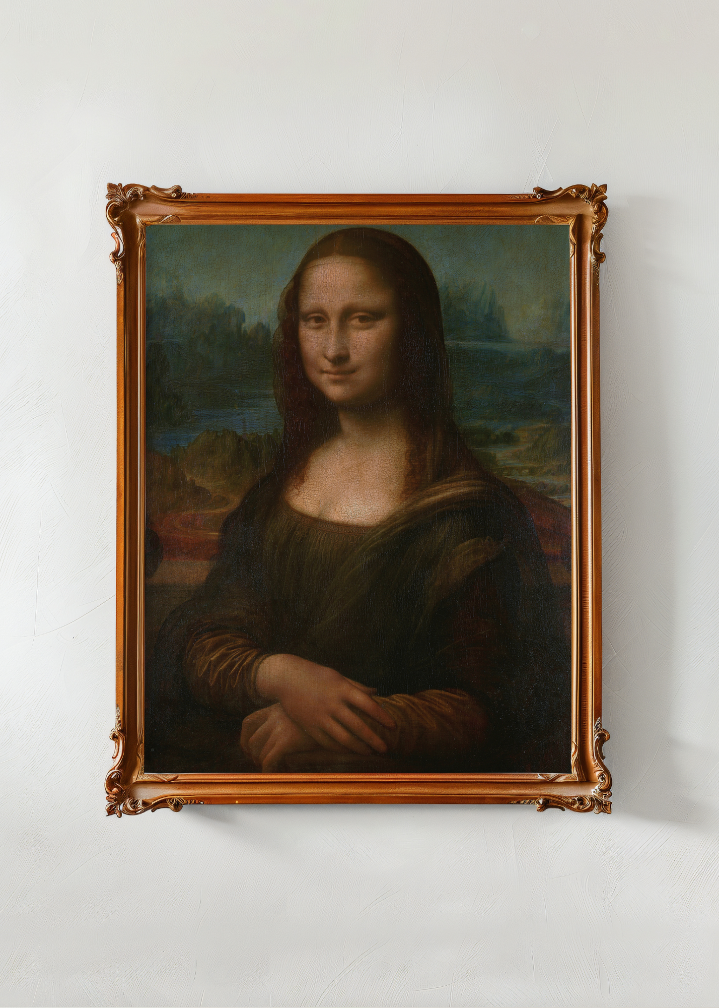 Behind her, a landscape folds into twilight, mirroring the subtle complexity of her expression. This painting is a meditation on human presence, the fragile boundary between seen and unseen, known and unknowable. The Mona Lisa is a quiet enigma, forever poised on the edge of revelation—an eternal muse whose story is written in the language of shadow and light.