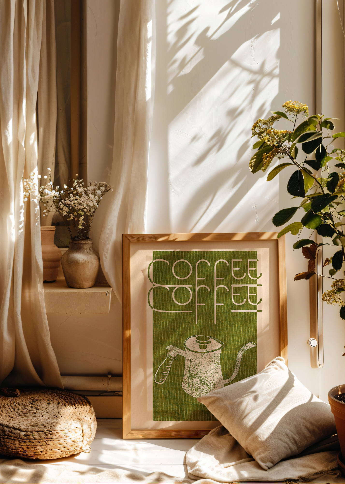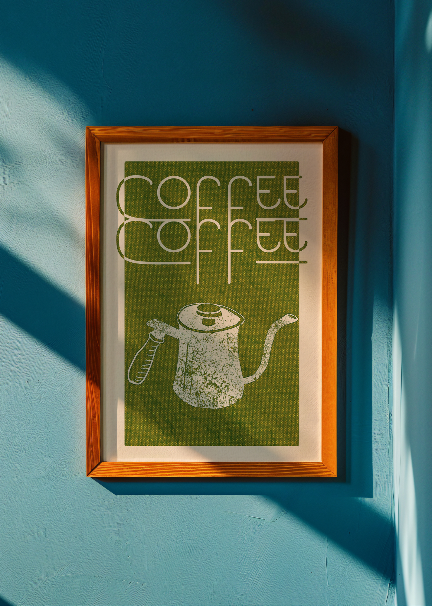 Coffee Coffee— With gentle lines and a steady hand, Coffee Coffee captures the quiet ritual of morning. A slender percolator, long-spouted, stands against a soft green background—simple, modern, and unhurried. The repeated word hums like a mantra, a call to comfort, to presence, to the warmth of a familiar brew. A piece that feels like a pause, like home.
