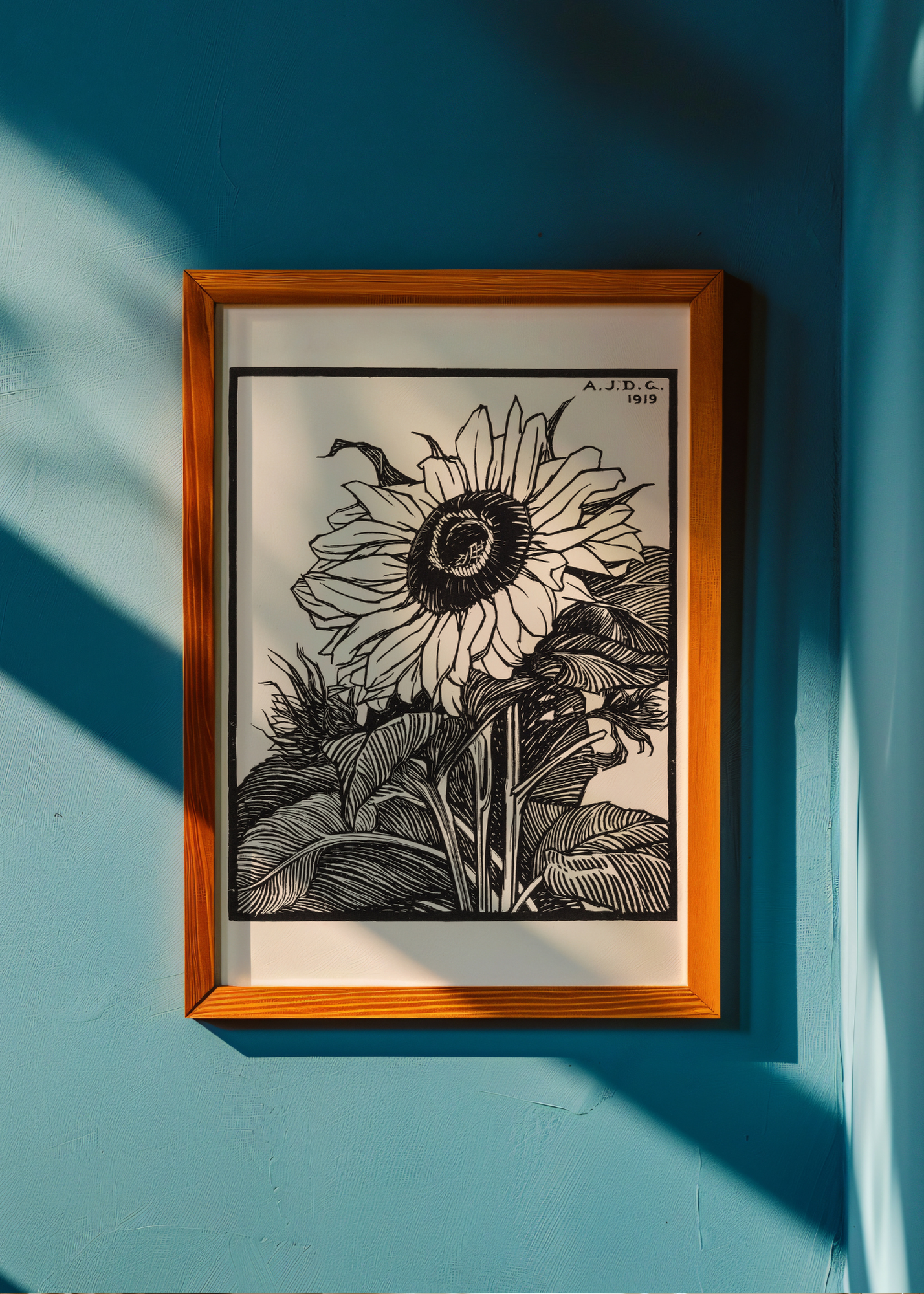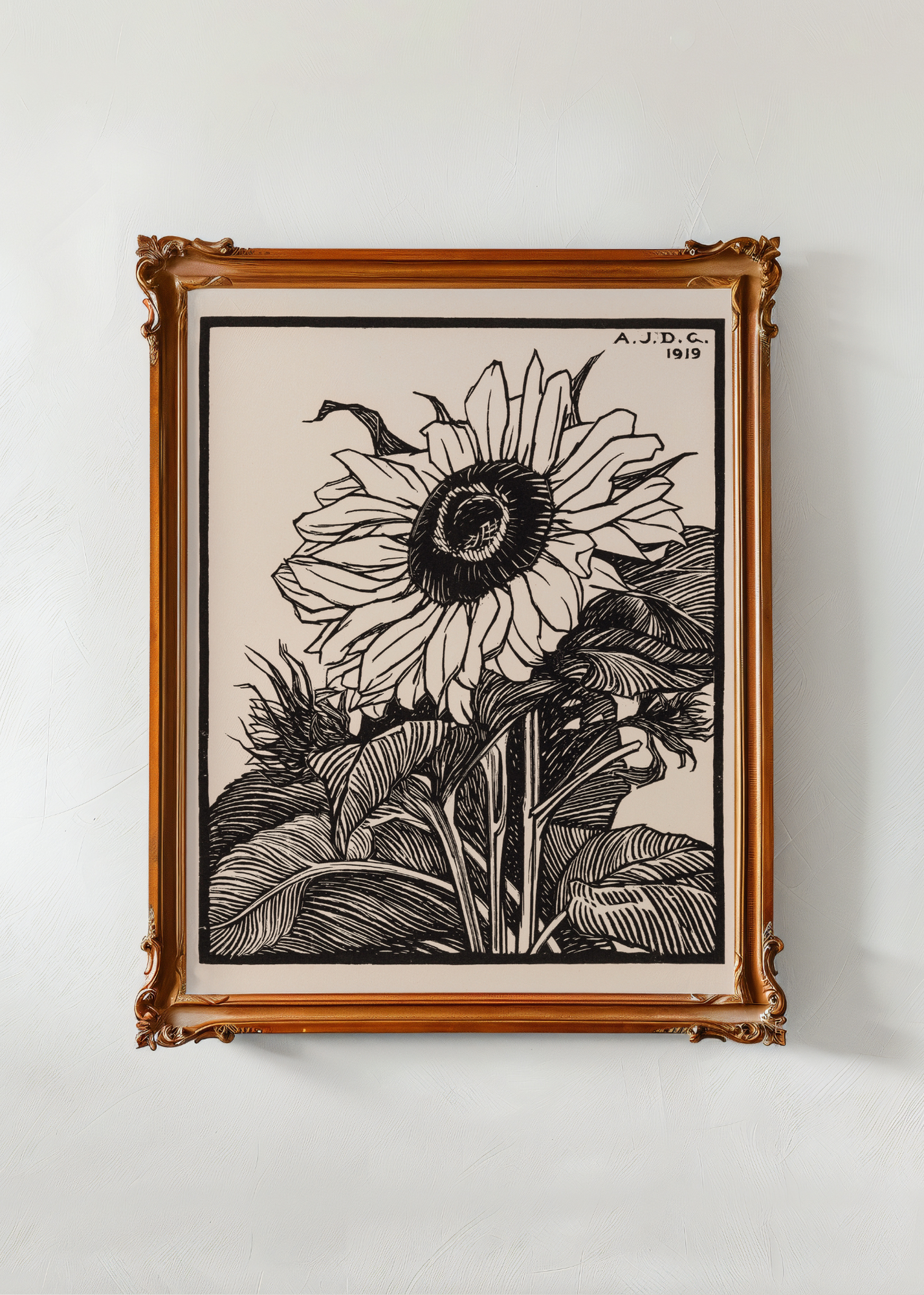 Rendered in rich contrasts and gentle curves, the piece captures more than a plant—it captures the character of the sunflower itself: resilient, reaching, sunlit from within. The leaves bend with subtle movement, their shapes echoing the rhythm of wind and time, and the background falls away, allowing the bloom to command full attention.