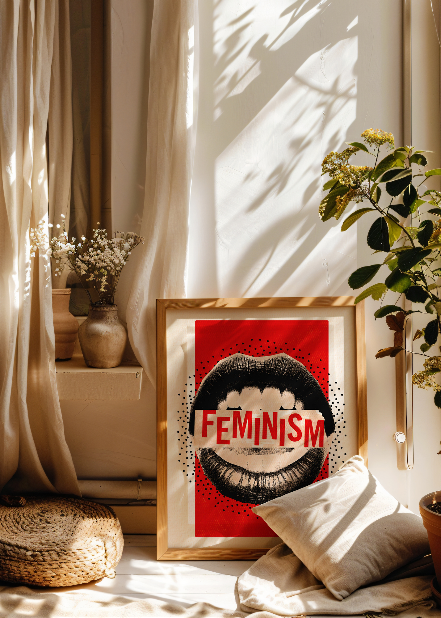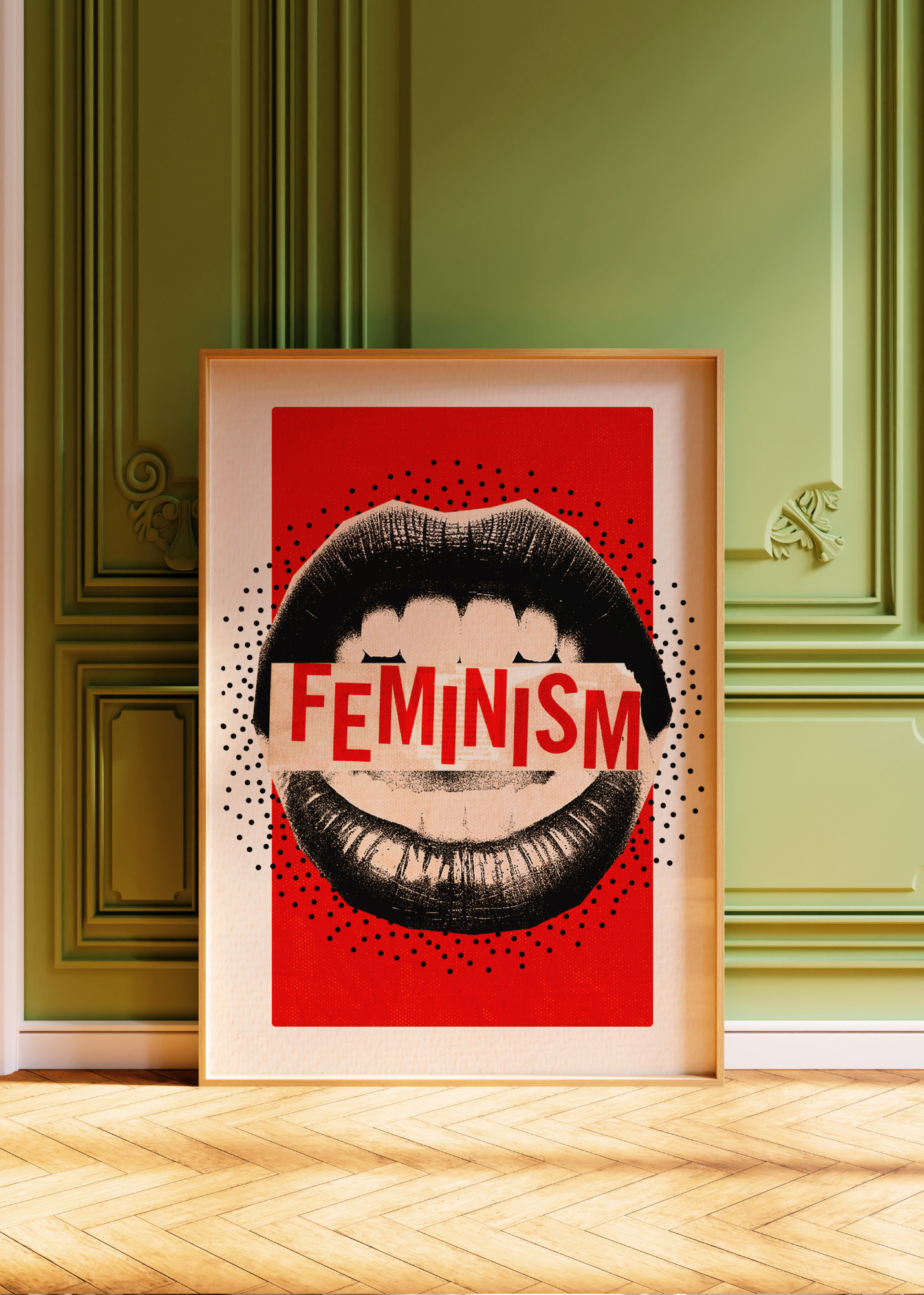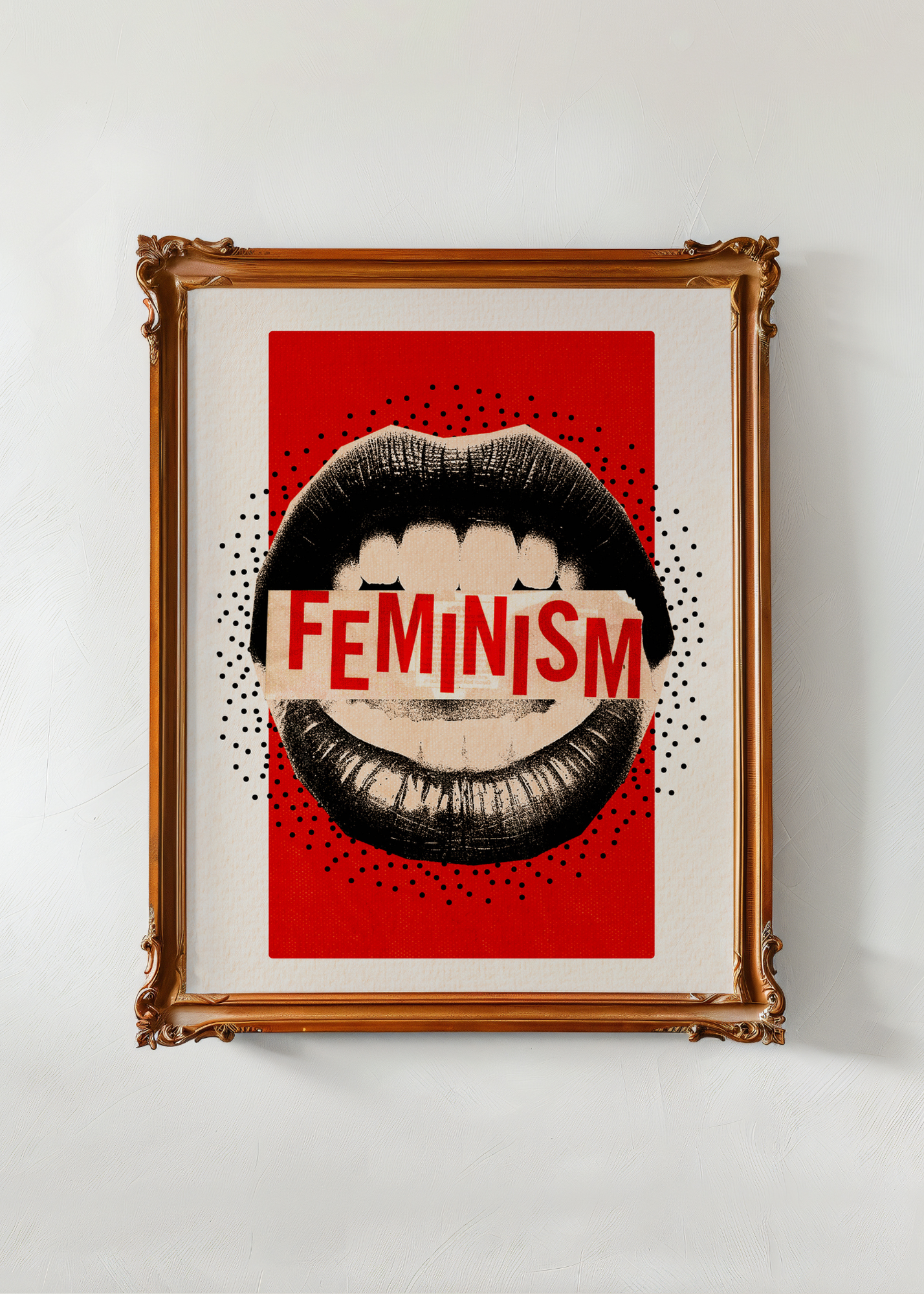 Feminism— Loud, proud, and powerfully punk. A bold red background sets the tone for a high-contrast black and white image of a woman’s open mouth—lipstick on point, teeth bared, and a cutout that reads “feminism” tucked between her lips like a revolution ready to be spoken. This print is a rallying cry and a fashion statement all in one. Fierce, fearless, and gloriously loud.