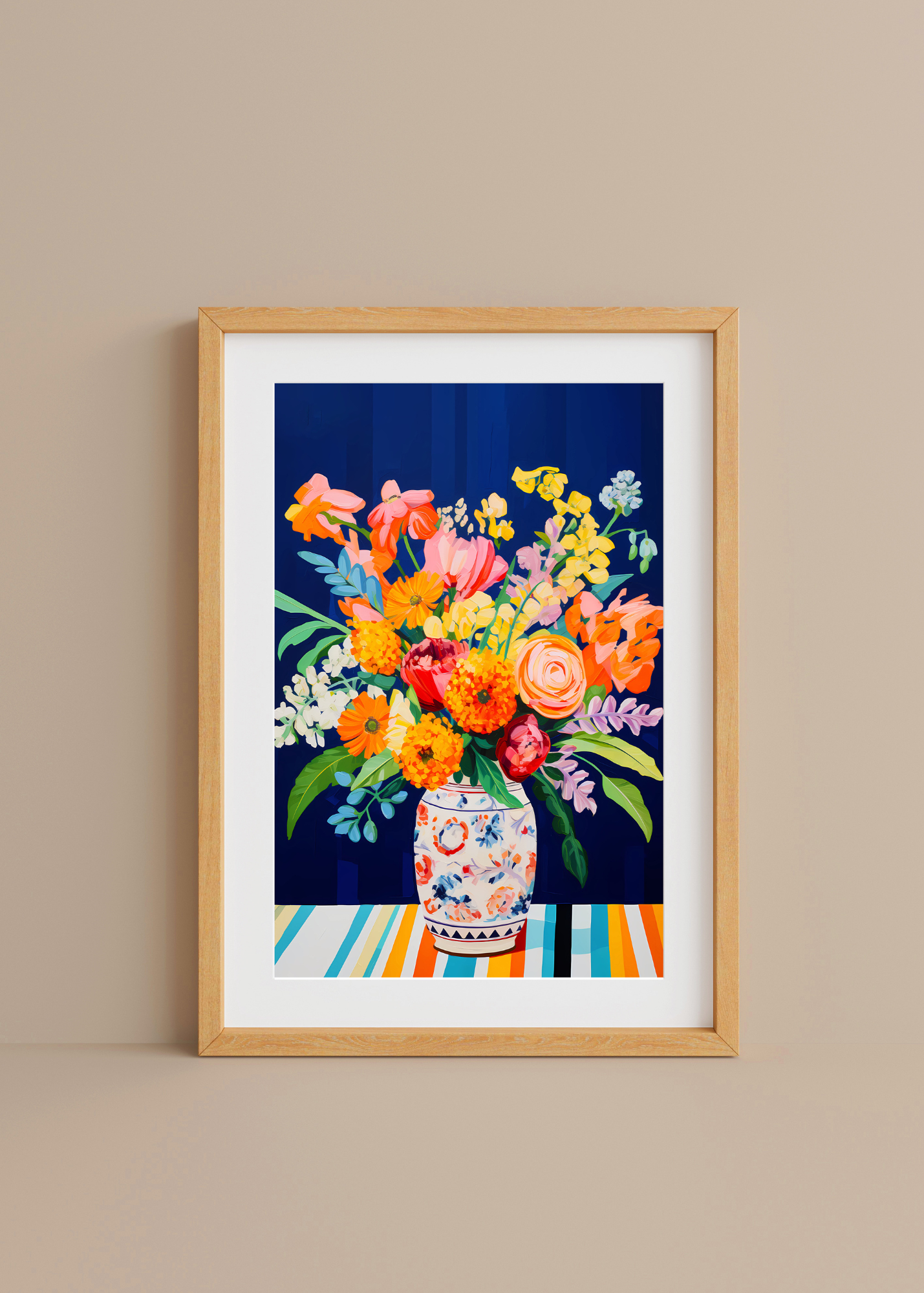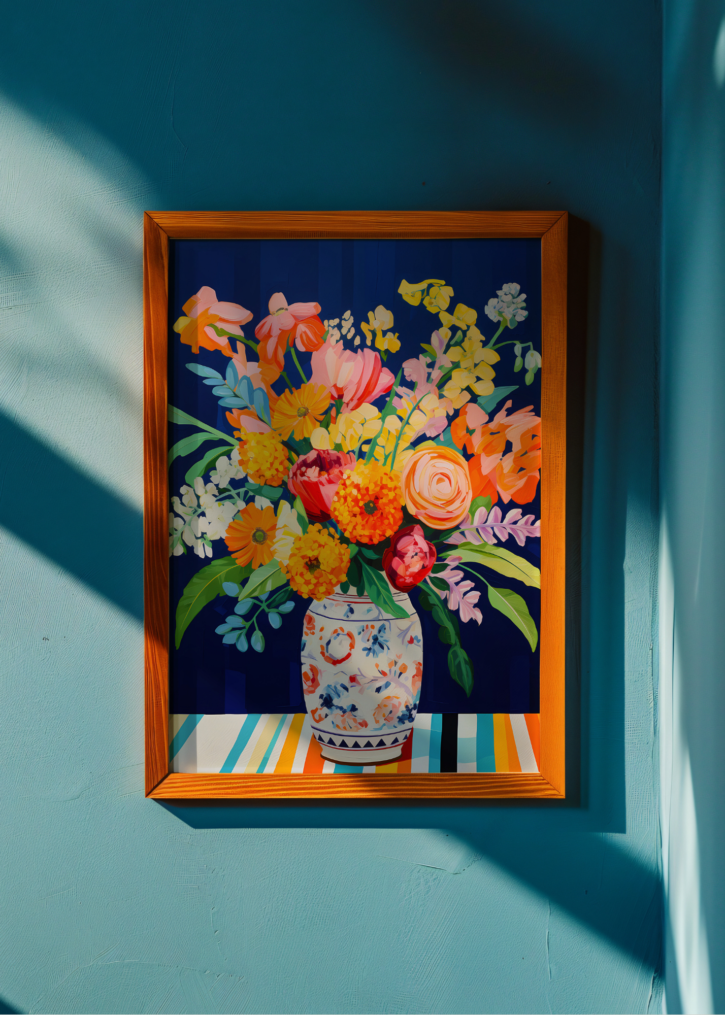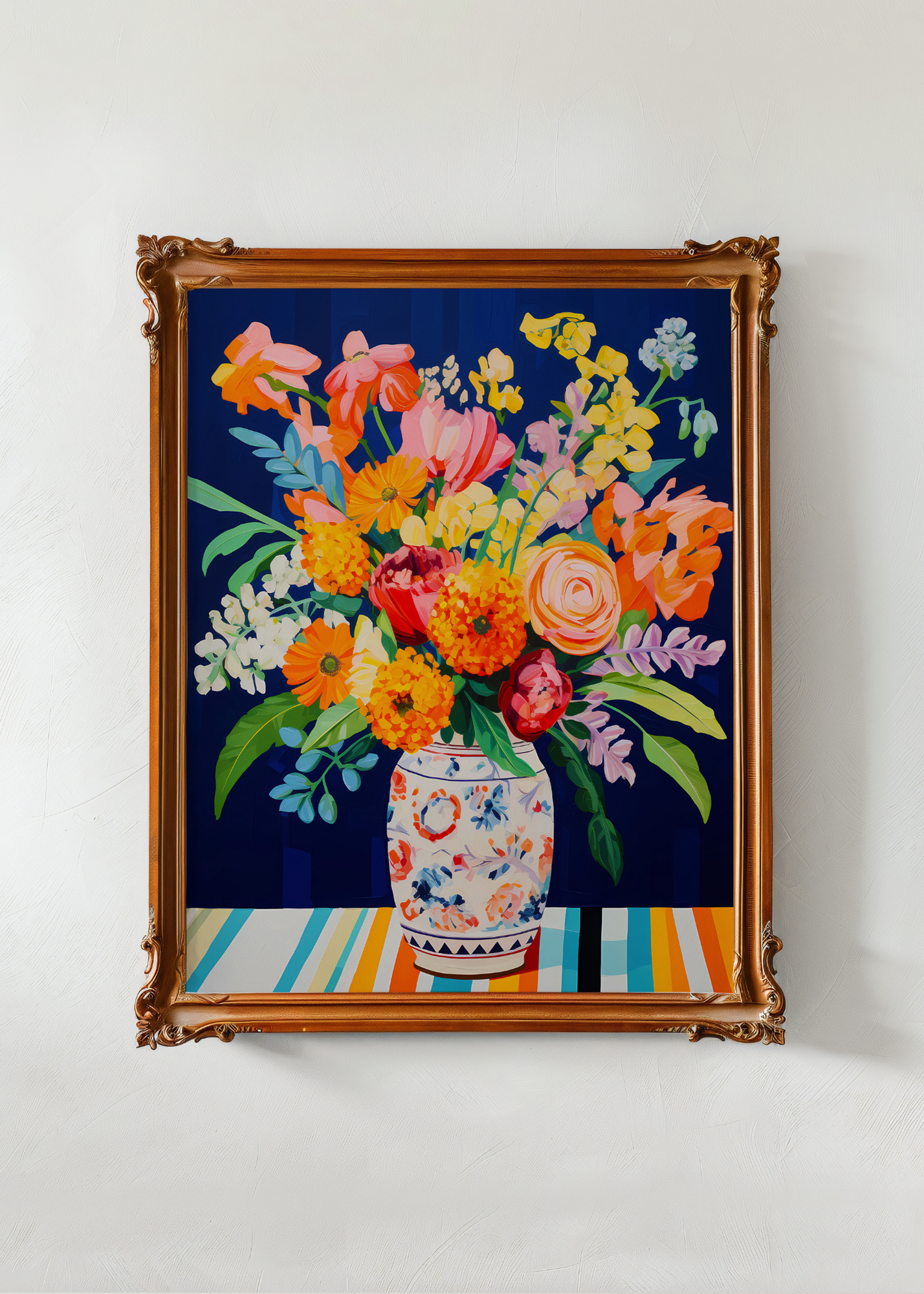Twilight in Bloom— Like a garden under starlight, this piece features a vase of vivid blooms set against a dramatic navy background. Shades of marigold, coral, and blush pop with gentle intensity, while the patterned vase grounds the wild beauty in cozy familiarity. A floral dreamscape glowing in the quiet dark.