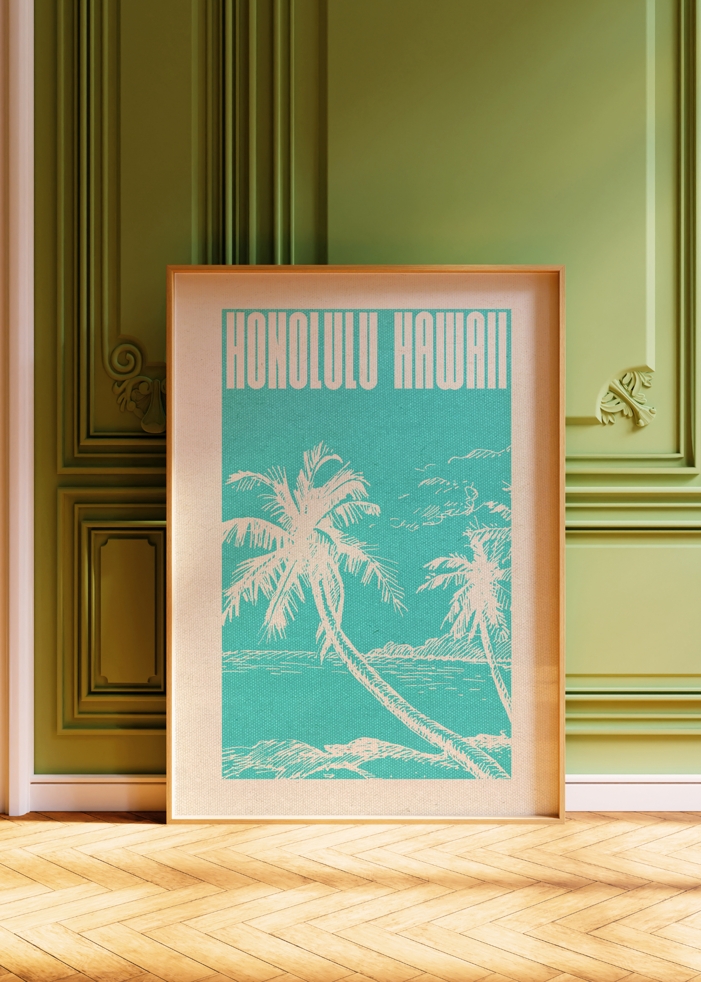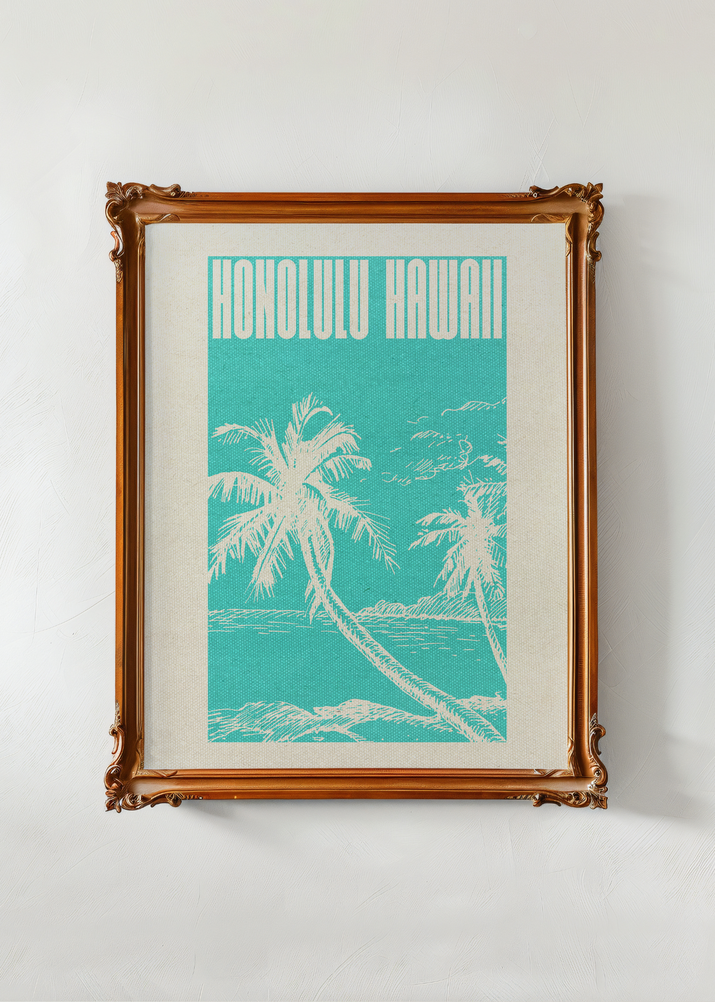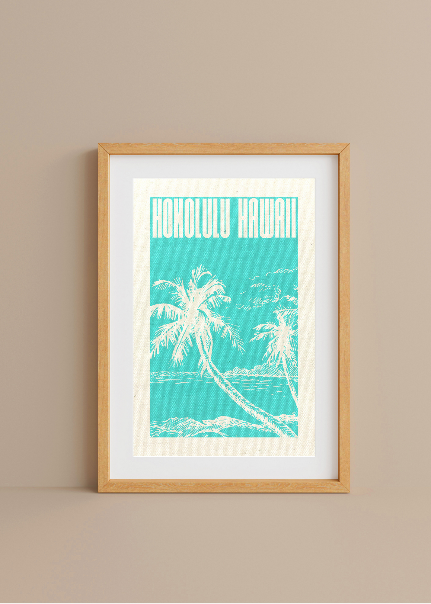 Hawaii— A creamy white frame surrounds a striking teal background filled with a crisp white illustration of a coastal Hawaiian dream—beach, ocean, and palm trees swaying in the breeze. With bold “Honolulu Hawaii” lettering beneath, this print feels like a travel postcard from a day you never wanted to end. Chill, breezy, and full of sunshine.