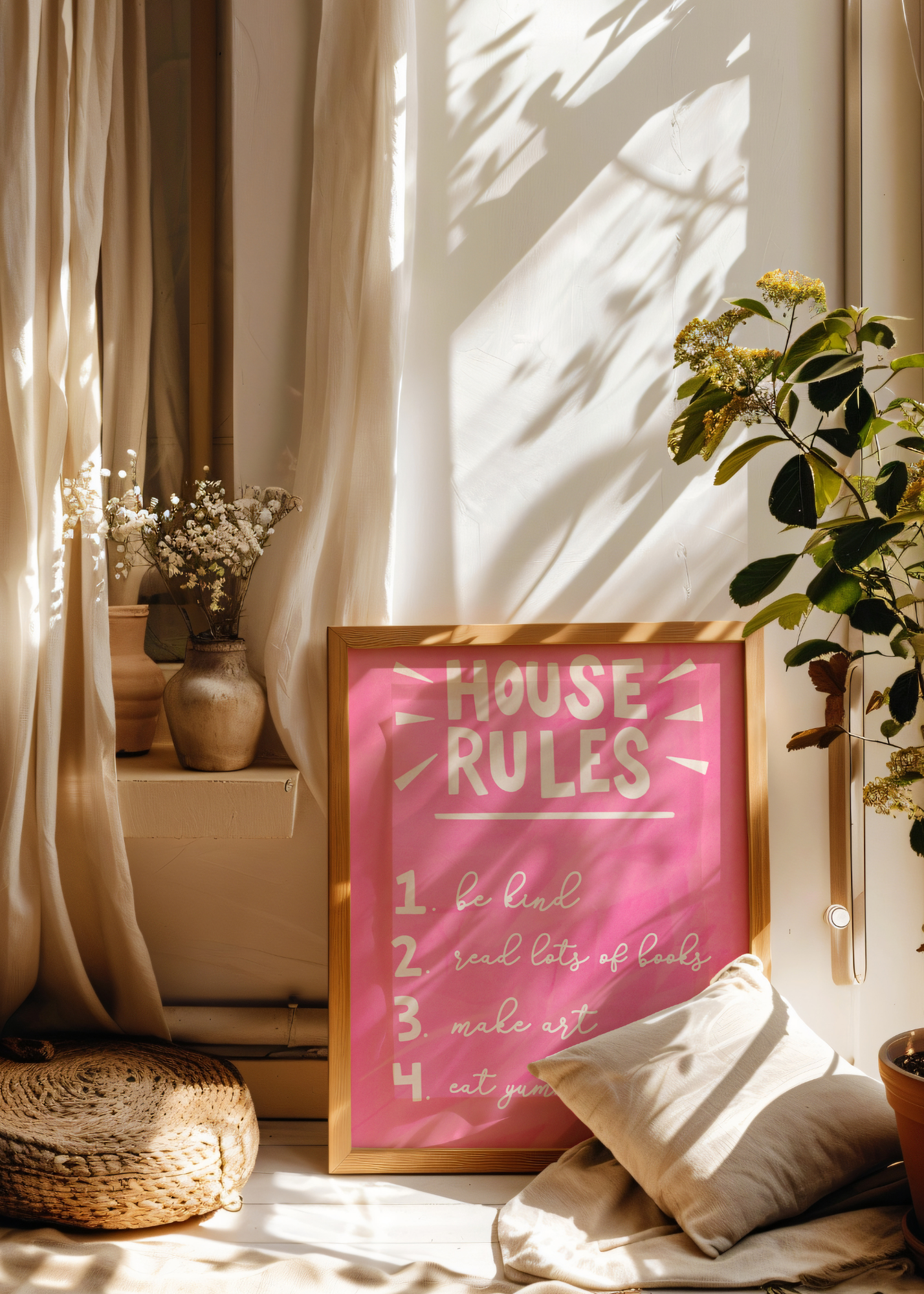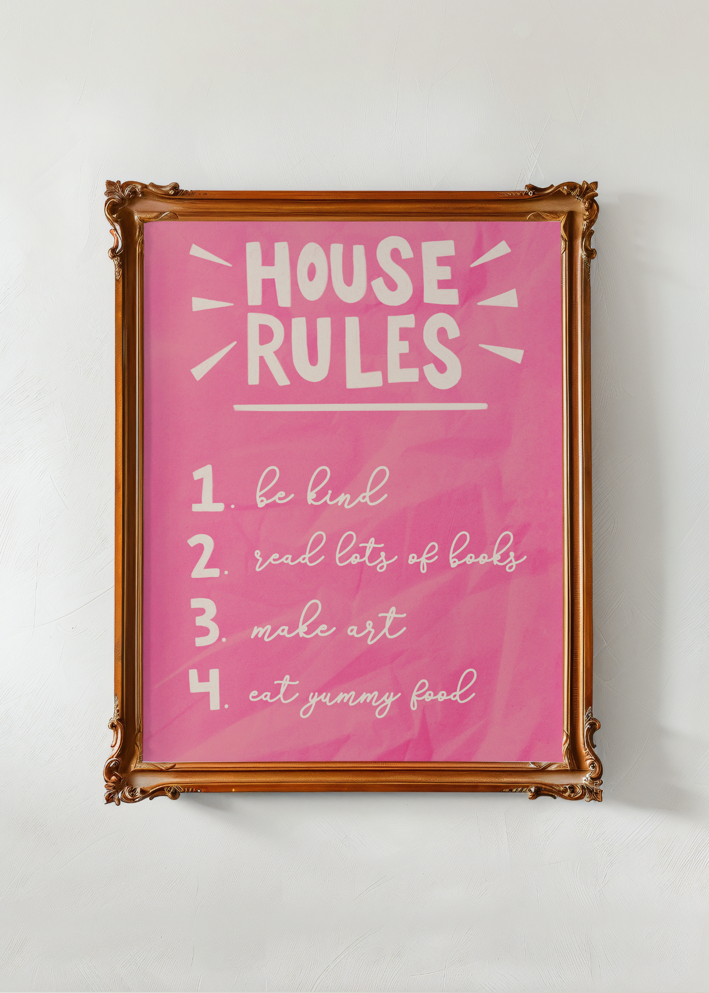House Rules— Set against a bubblegum pink background, this print is your home’s joyful manifesto. In bold white letters, “House Rules” beams from the top, followed by a heartfelt list of four sweet, grounding reminders: be kind, read lots of books, make art, and eat yummy food. Each rule is a little celebration of what makes life feel safe, warm, and full of heart.