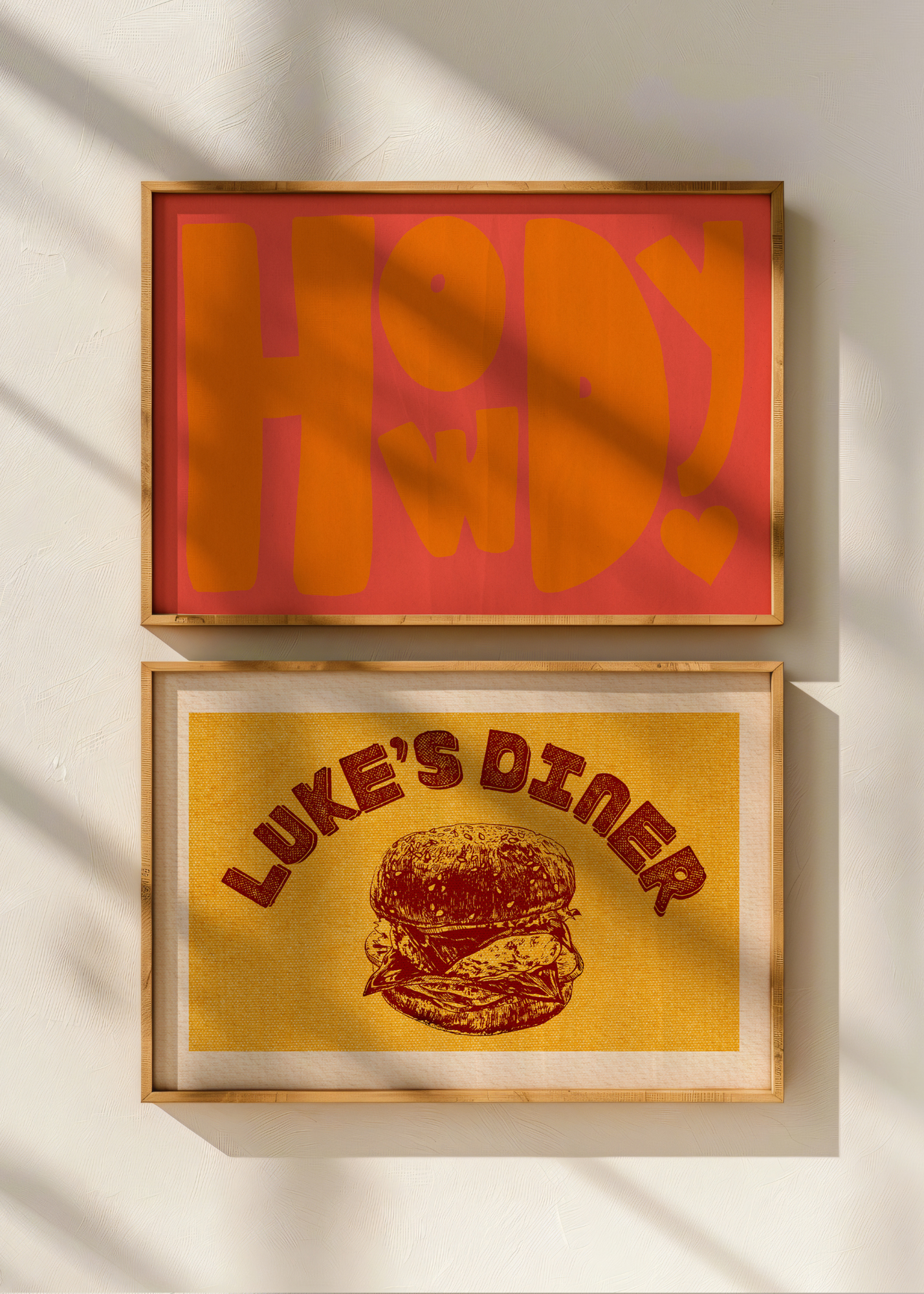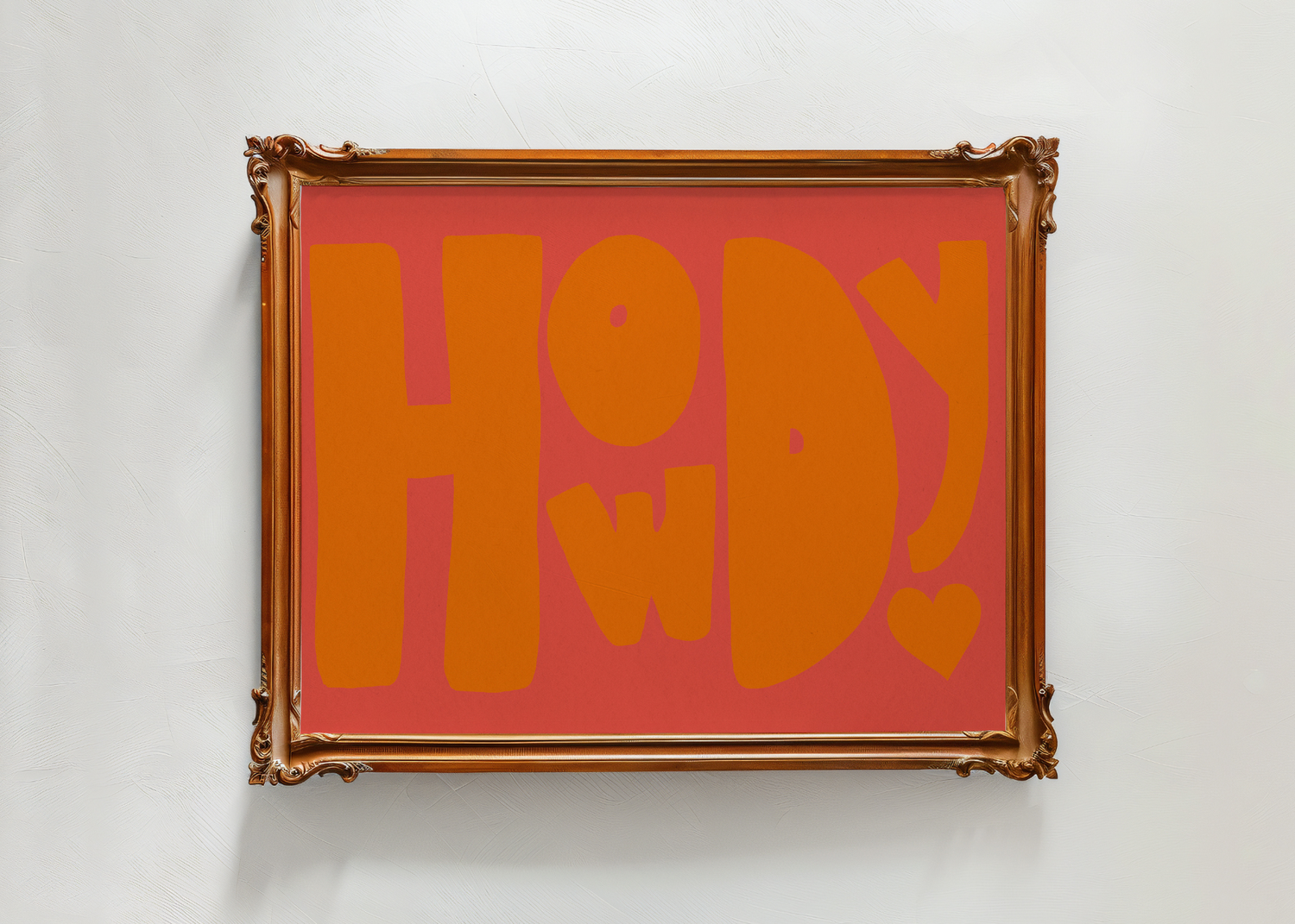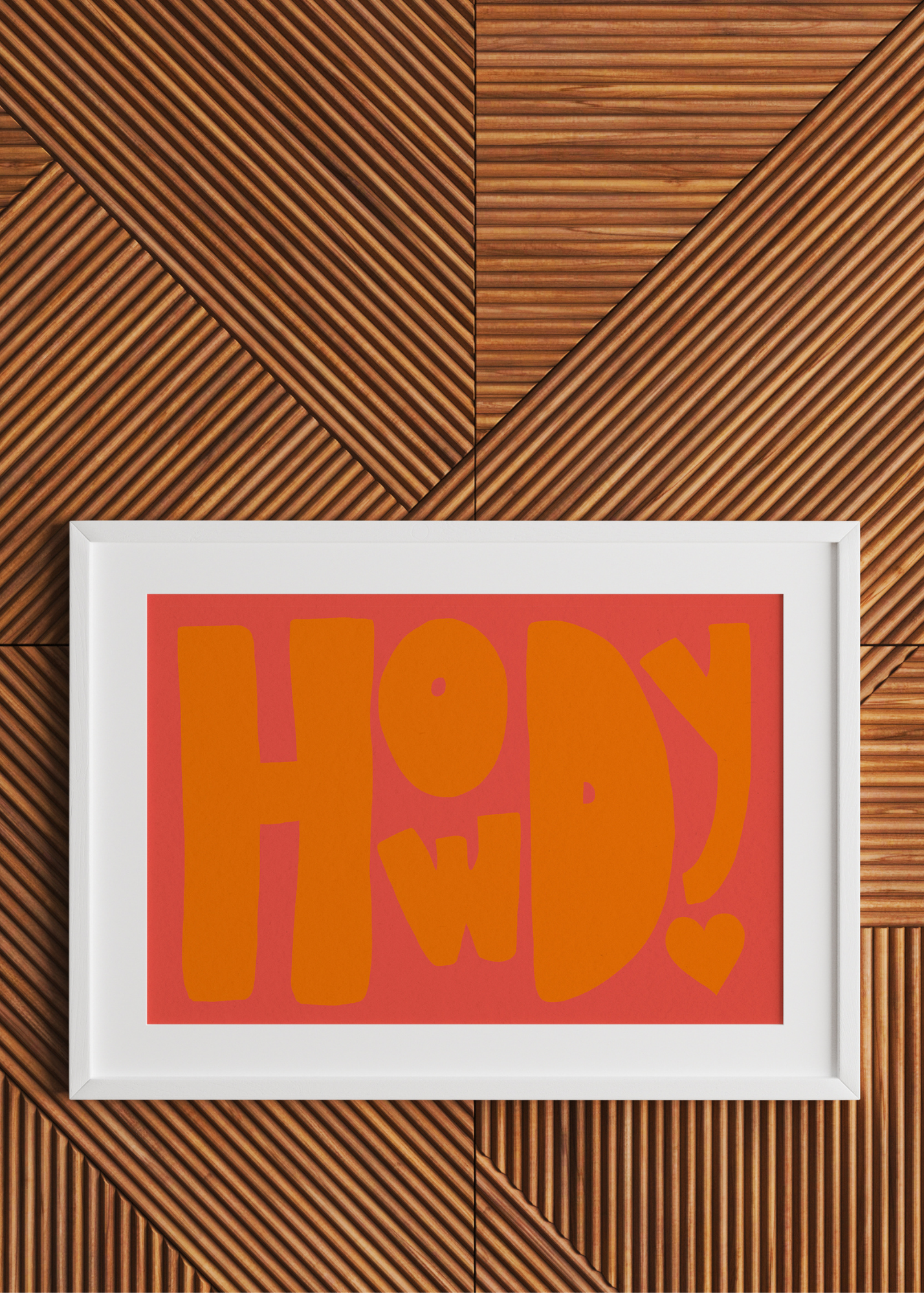 Howdy— This print is bold, playful, and absolutely packed with personality. A muted peachy pink background sets the stage for the hand-drawn lettering of “Howdy” in a brilliant juicy orange—complete with a sweet little heart for extra charm. It’s the kind of greeting that kicks off good stories, invites laughter, and brings a little Southern sass wherever it hangs.