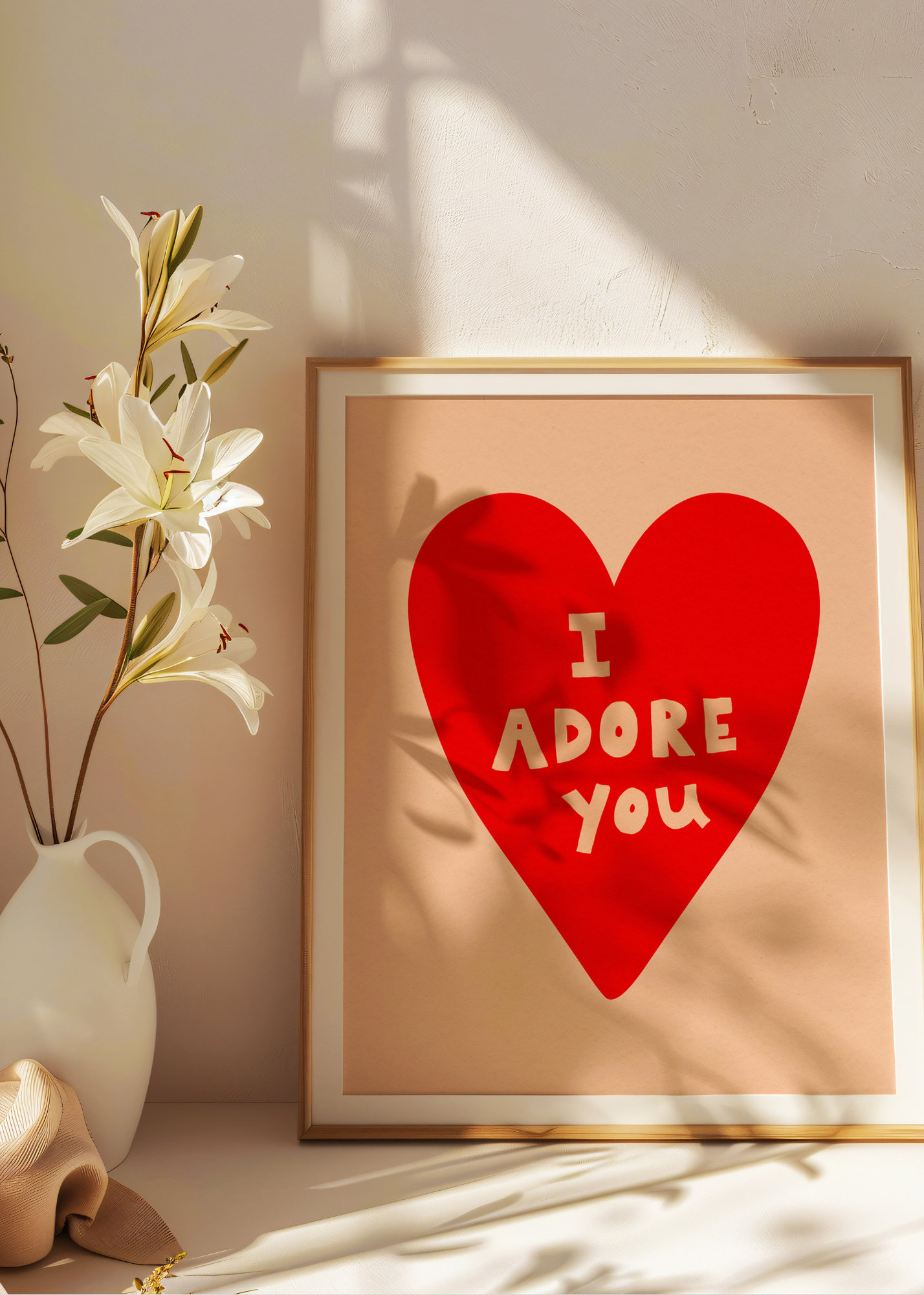 I Adore You— This cozy little print feels like a hug wrapped in paper. On a creamy textured background, a hand-drawn bright red heart takes center stage. Inside the heart, in soft, chunky lettering that reads “I adore you.” It’s a gentle reminder that love doesn’t have to be loud—it just has to be true. Perfect for partners, best friends, or your own sweet self.