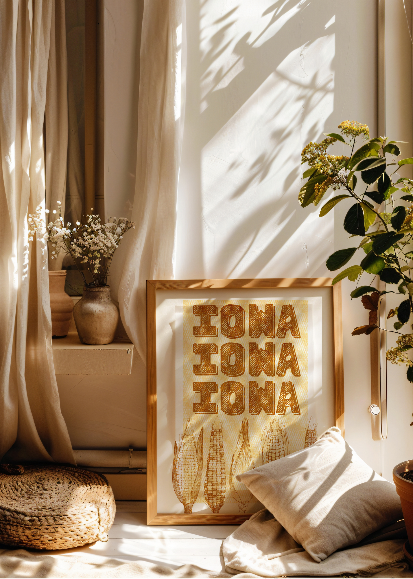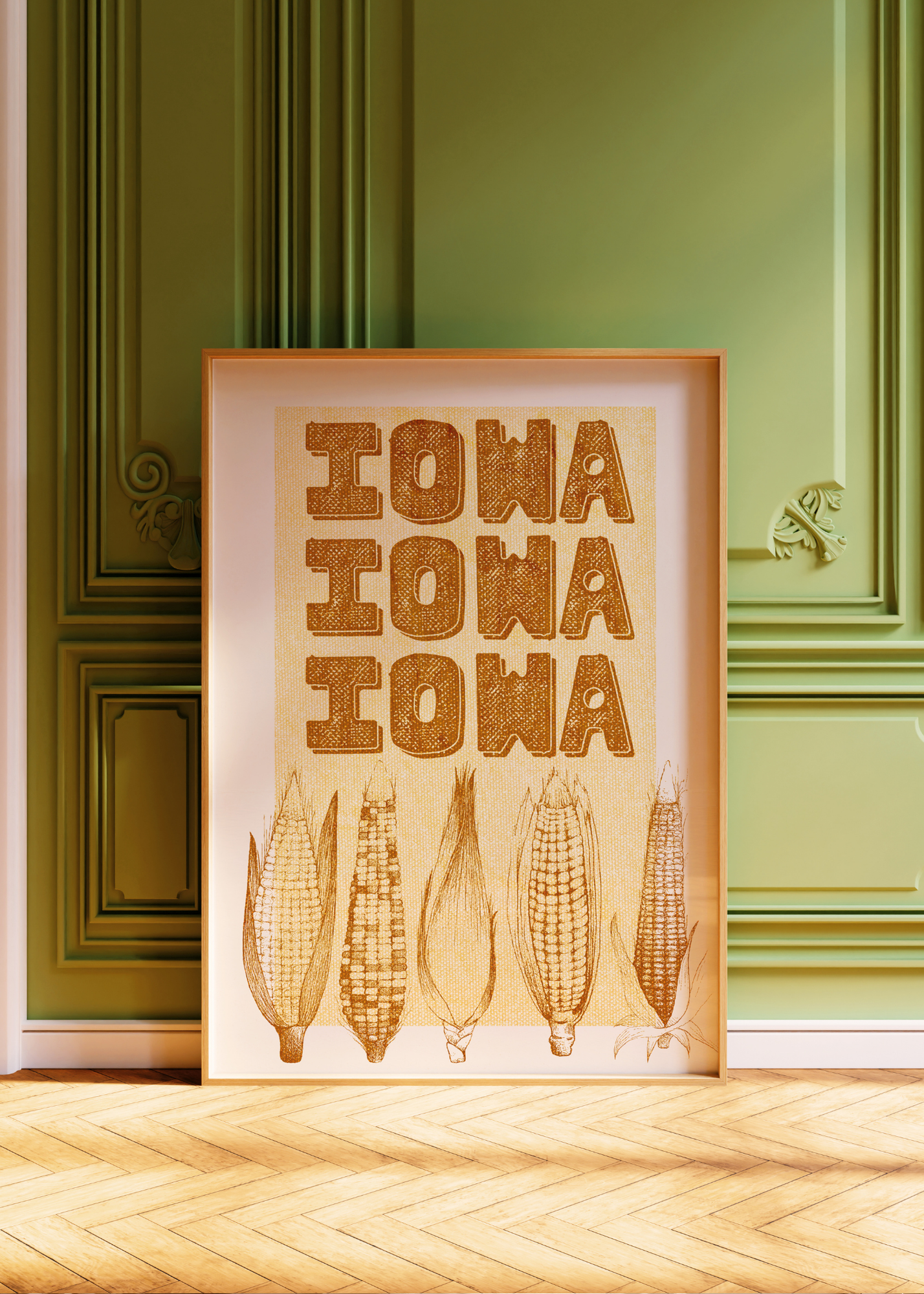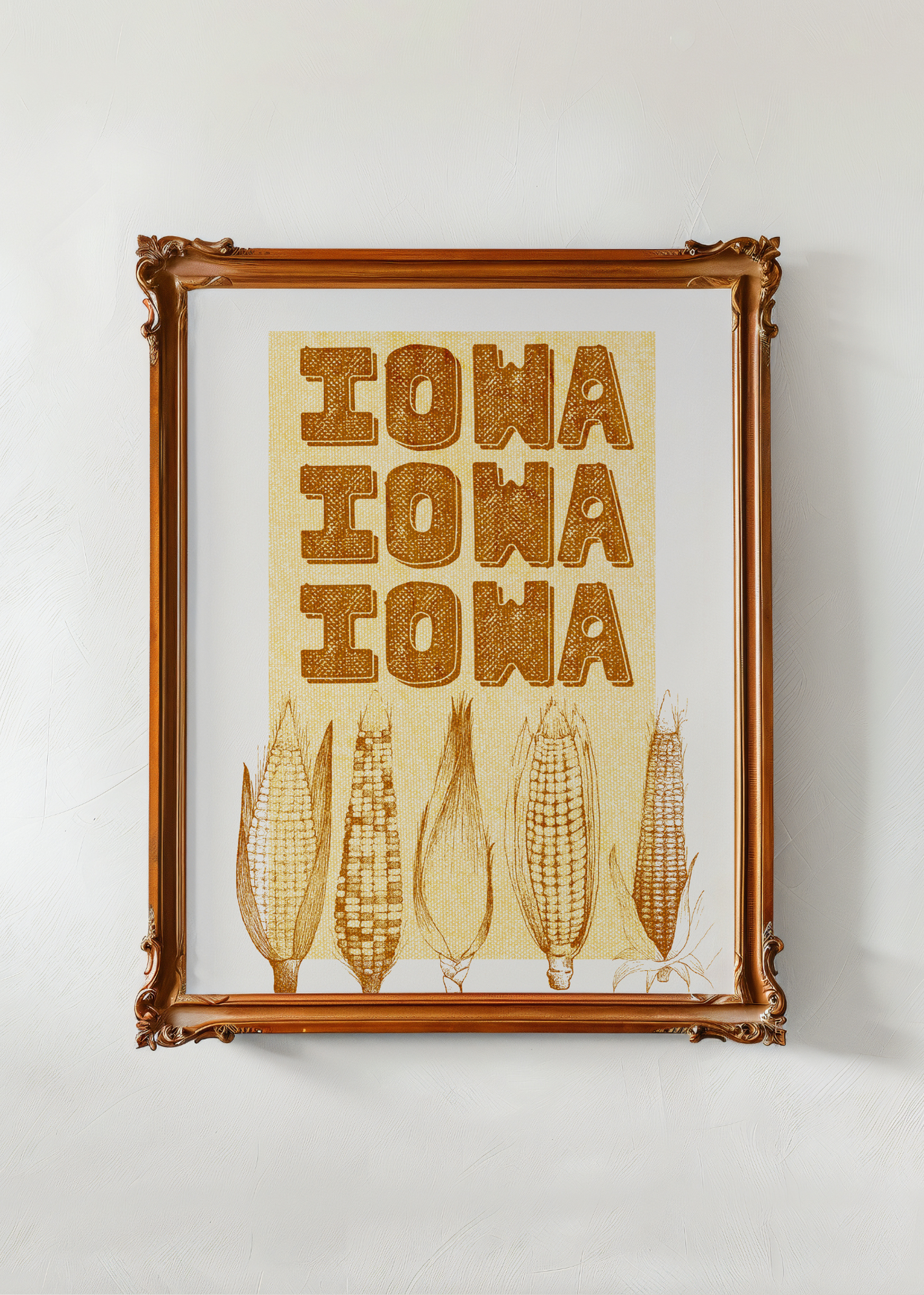 Iowa Iowa— This print is a charming shout-out to the heartland. Set in a white frame, and a warm, sunny yellow background, it features bold stacked lettering: “Iowa Iowa Iowa.” At the bottom, a sweet cluster of illustrated ears of corn adds a little farm-fresh flair. Nostalgic, whimsical, and perfect for Midwest lovers and corn enthusiasts alike.