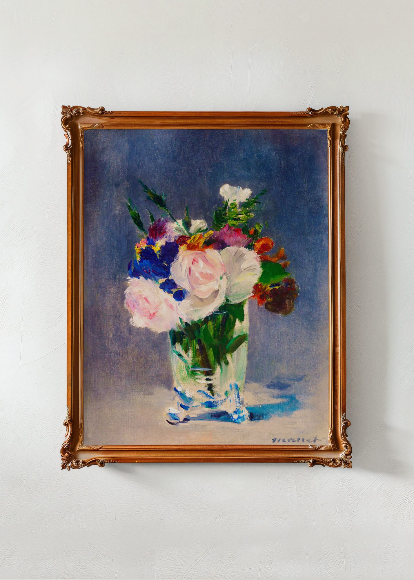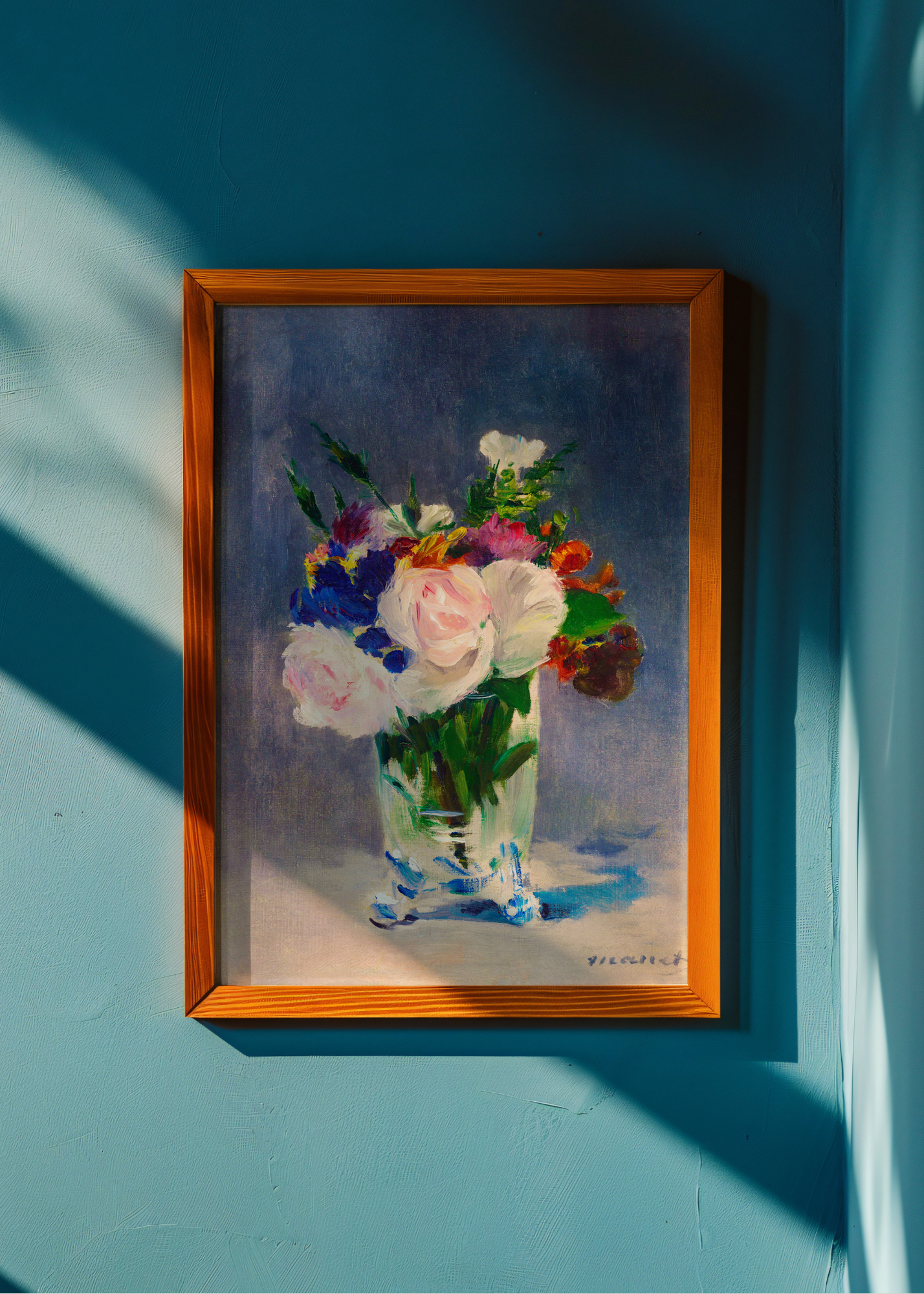 Flowers in a Crystal Vase— In Flowers in a Crystal Vase (c.1882), Édouard Manet captures a fleeting breath of nature’s gentleness—soft blooms leaning tenderly from a clear vessel, as if pausing mid-sigh. Light dances along glass and petal alike, illuminating the stillness with quiet reverence. This delicate composition is both tender and ephemeral, like a whispered thought preserved in paint. A graceful meditation on beauty at its most momentary.