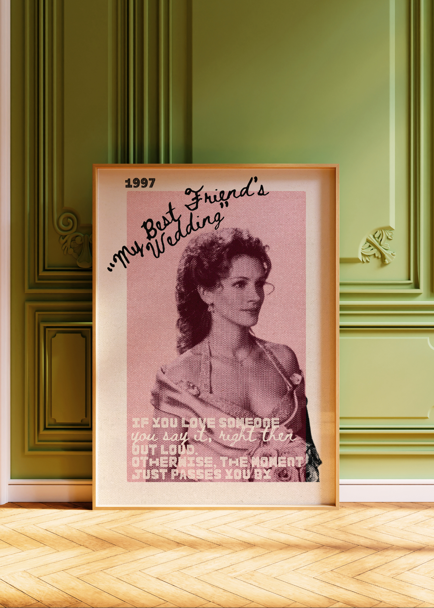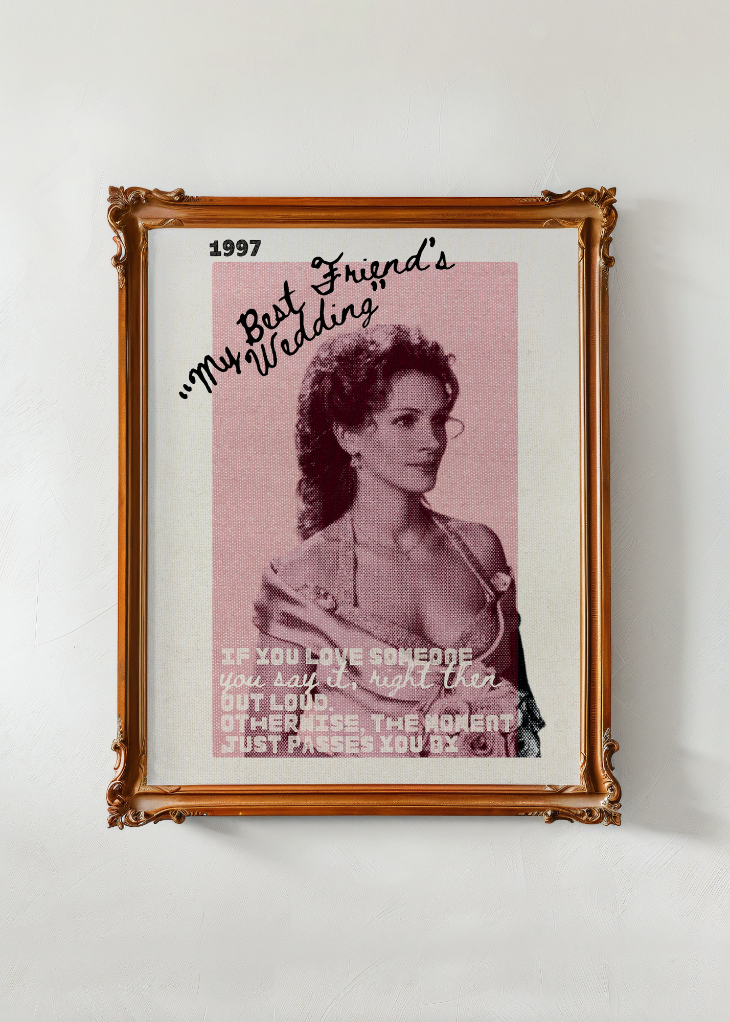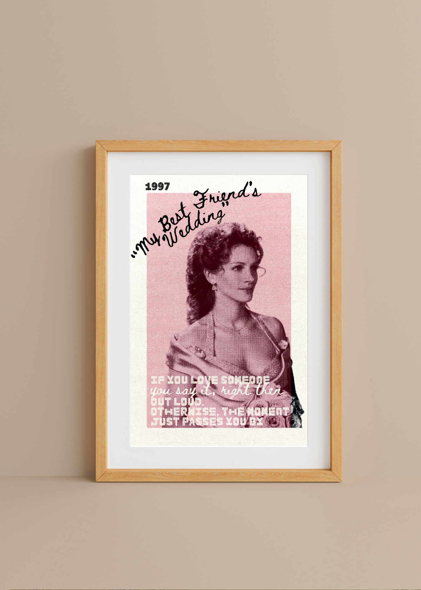 My Best Friend's Wedding— This lavender print is a cinematic swoon fest featuring Julia Roberts as Julianne Potter in that unforgettable dress, with the quote: “If you love someone, you say it, right then out loud…” A heartfelt nod to one of rom-com’s most iconic moments—melancholy, hopeful, and utterly timeless.
