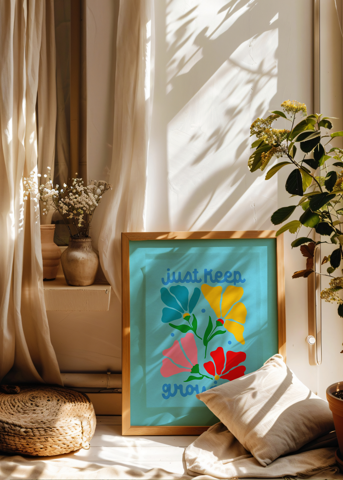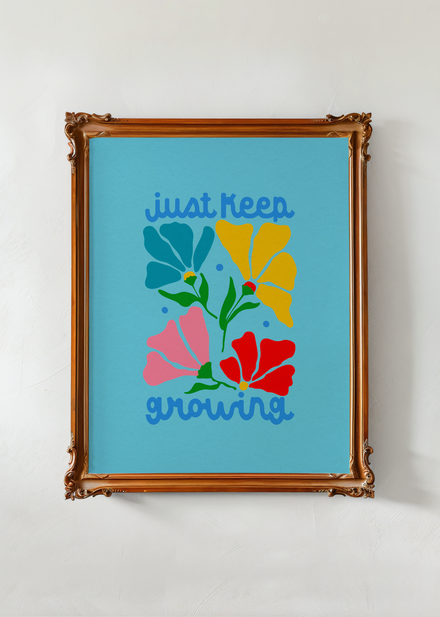 Just Keep Growing— In each version, a square cluster of bubbly, abstract flowers blooms at the center, with the phrase “Just keep growing” in matching bubble cursive. Whether in teal, pink, green, or blue, every colorway is a colorful encouragement to stay soft, keep blooming, and never stop becoming.