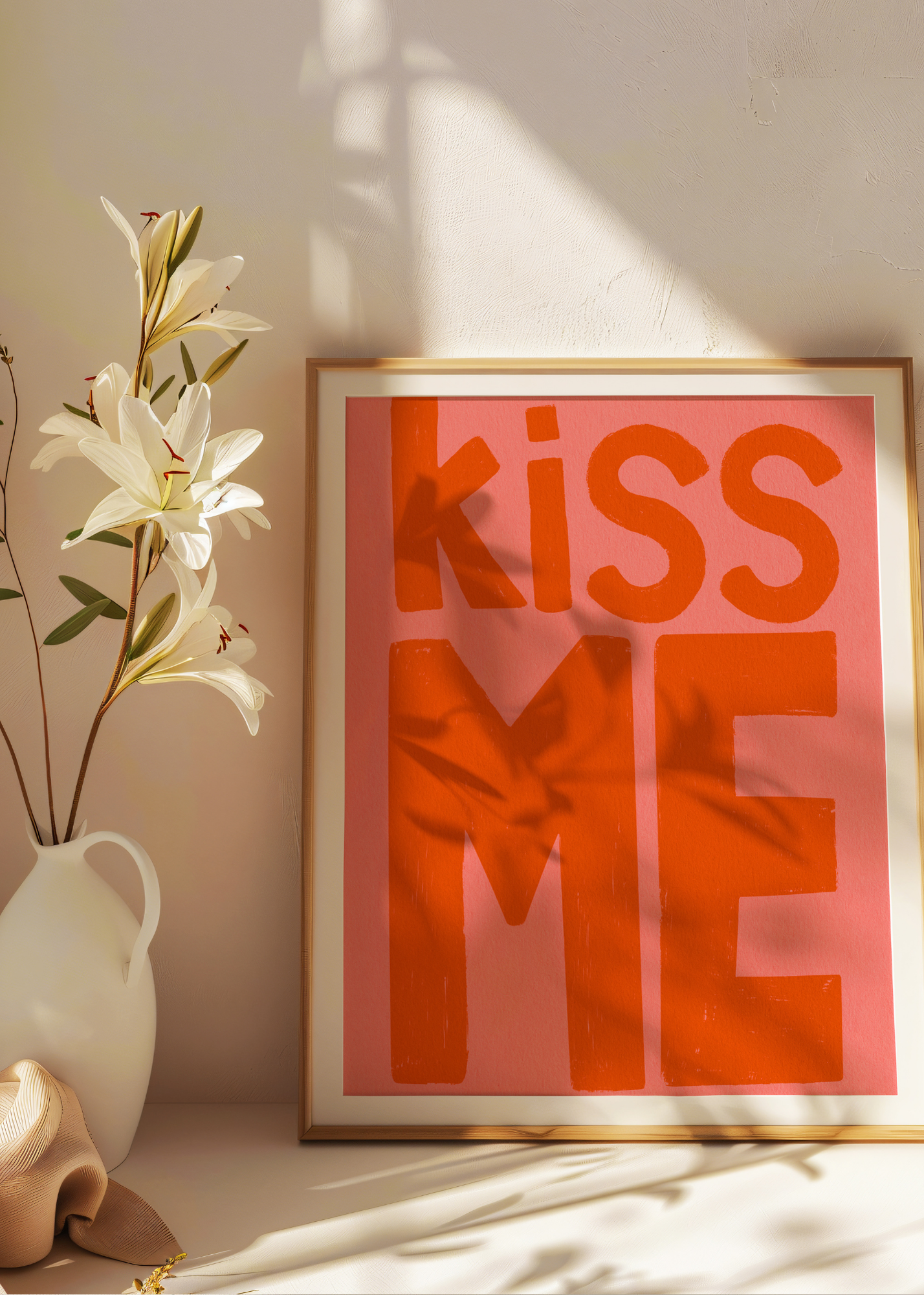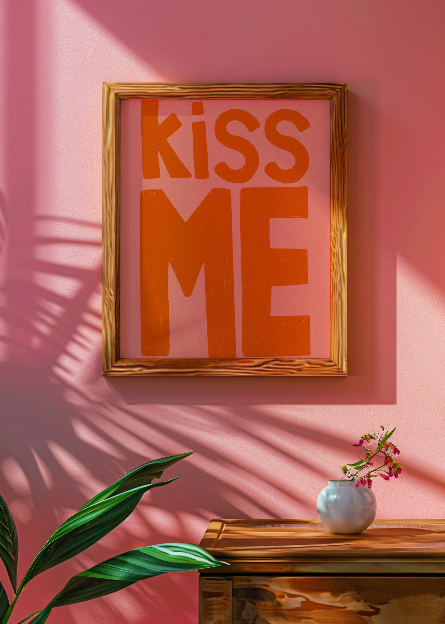Kiss Me— Large hand-drawn block letters say it all: “Kiss me.” Bright orange-red letters jump off a sweet pink background in this bold, flirty piece. It’s playful, confident, and sugar sweet—in the very best way.