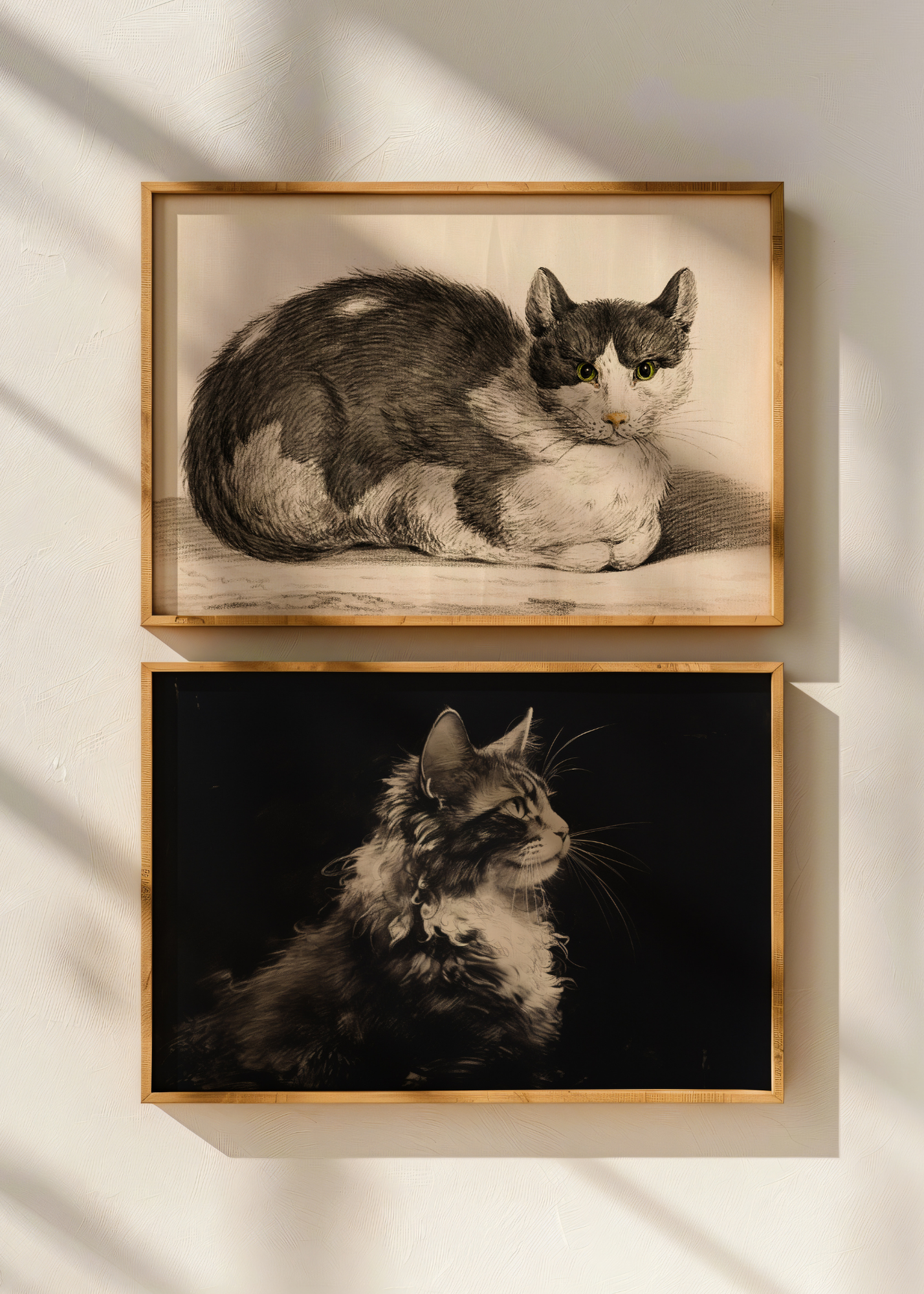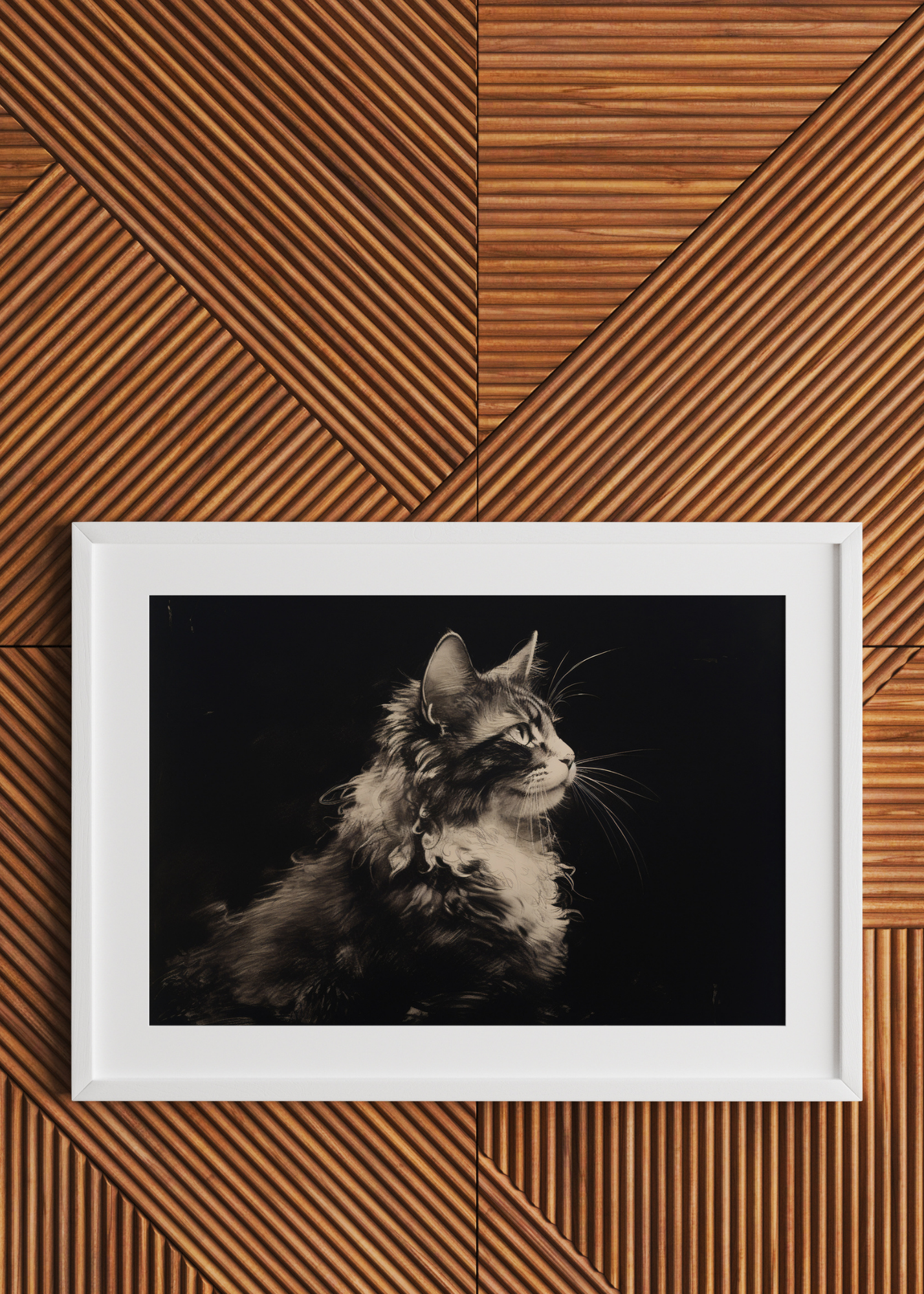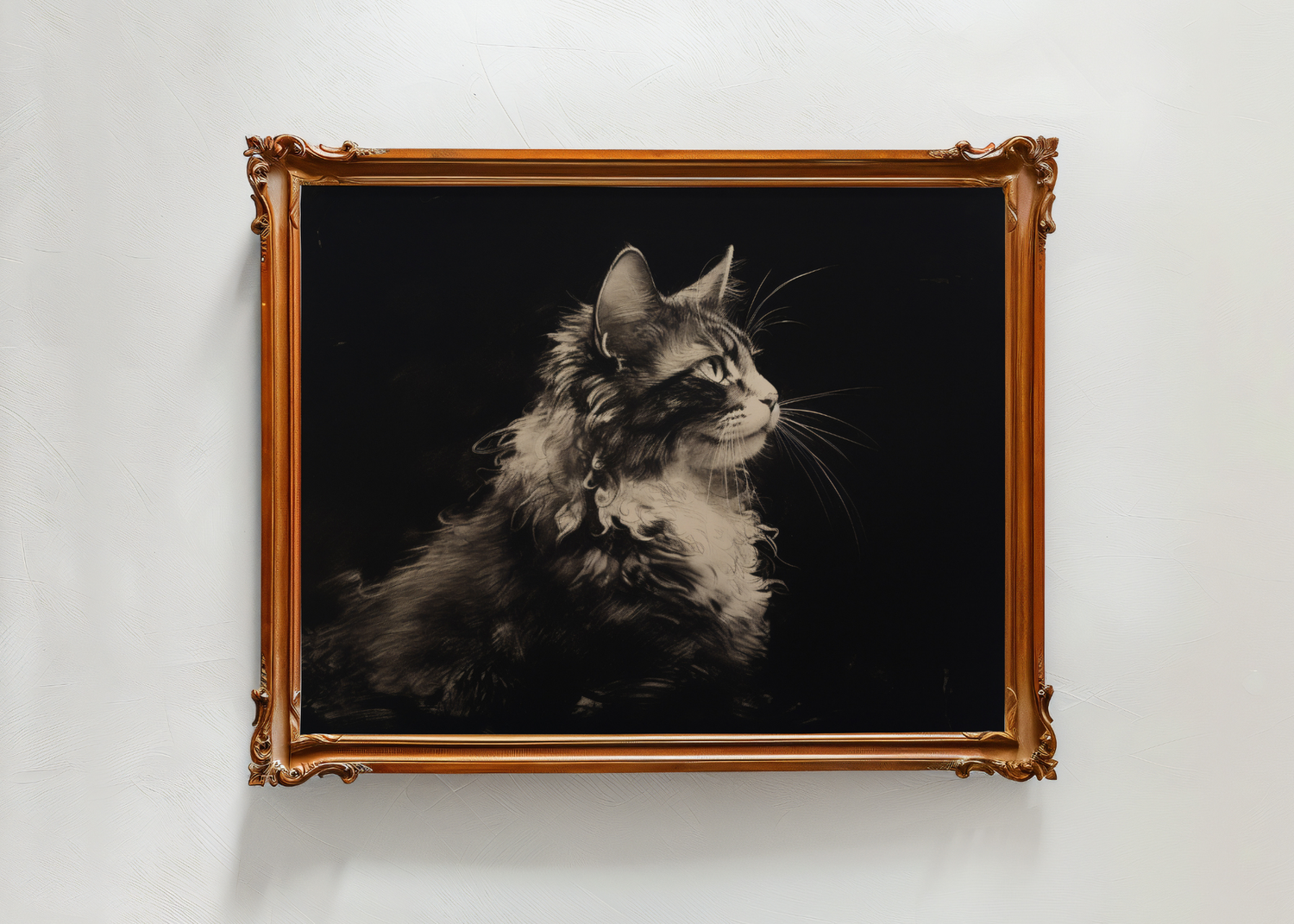 Midnight Reverie— A regal feline gazes into the dark with quiet wisdom, its fur a soft cascade of curls and shadow. Set against a rich black backdrop, the cat’s silhouette glows like moonlight through velvet. The frame, ornate and golden, feels like a portal to an old-world parlor where stories linger in corners and every glance holds meaning. This piece hums with elegance and nostalgia—a tribute to grace, both wild and tender.
