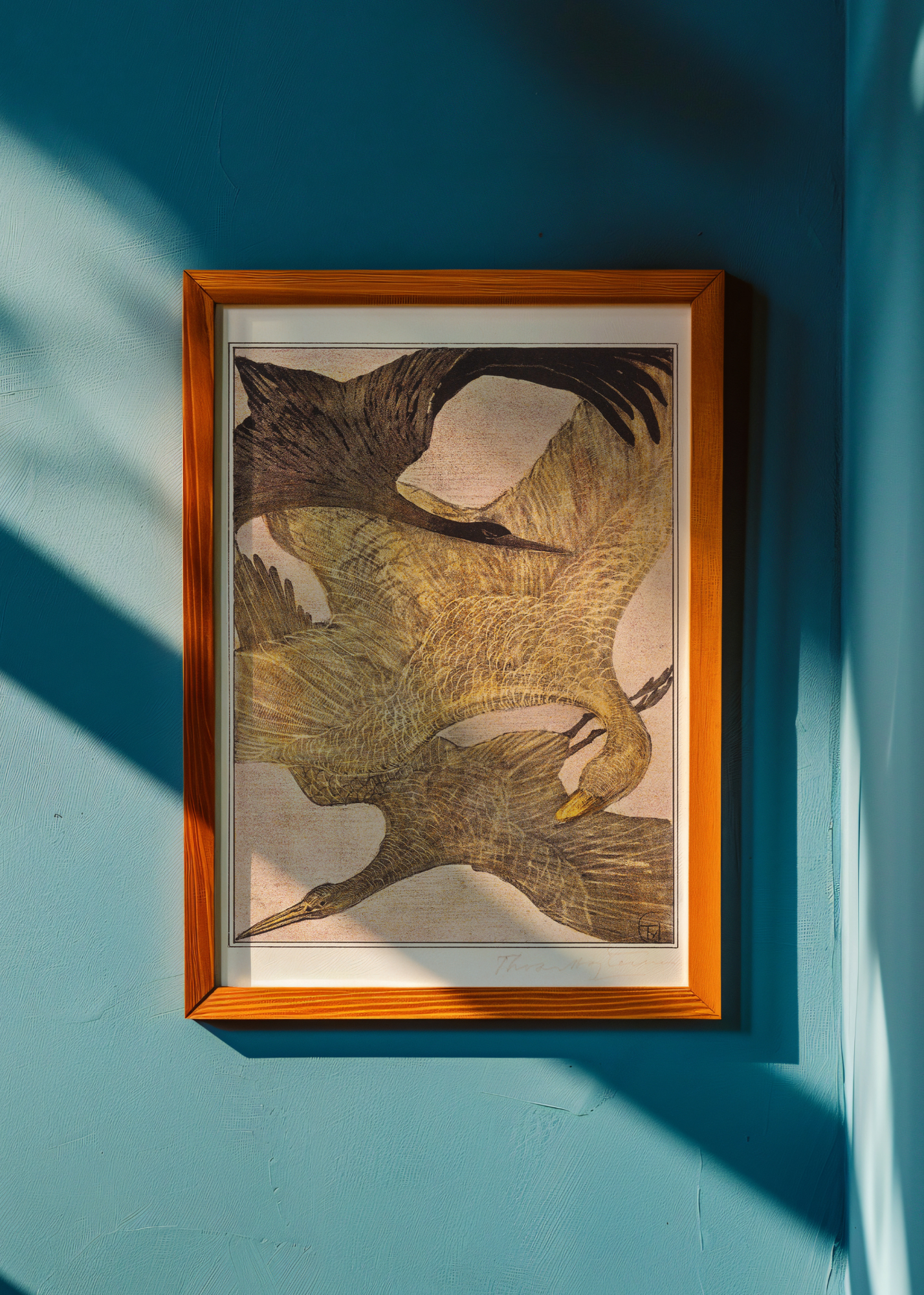 Three Flying Birds— Three silhouettes glide across an open sky, their wings outstretched in graceful rhythm. In Three Flying Birds, Theo Van Hoytema offers a quiet study in motion—elegant and free. The birds seem to drift between breath and breeze, a fleeting moment held still in ink and line. Light and tranquil, the composition whispers of open skies, shared paths, and the hush of early morning flight.