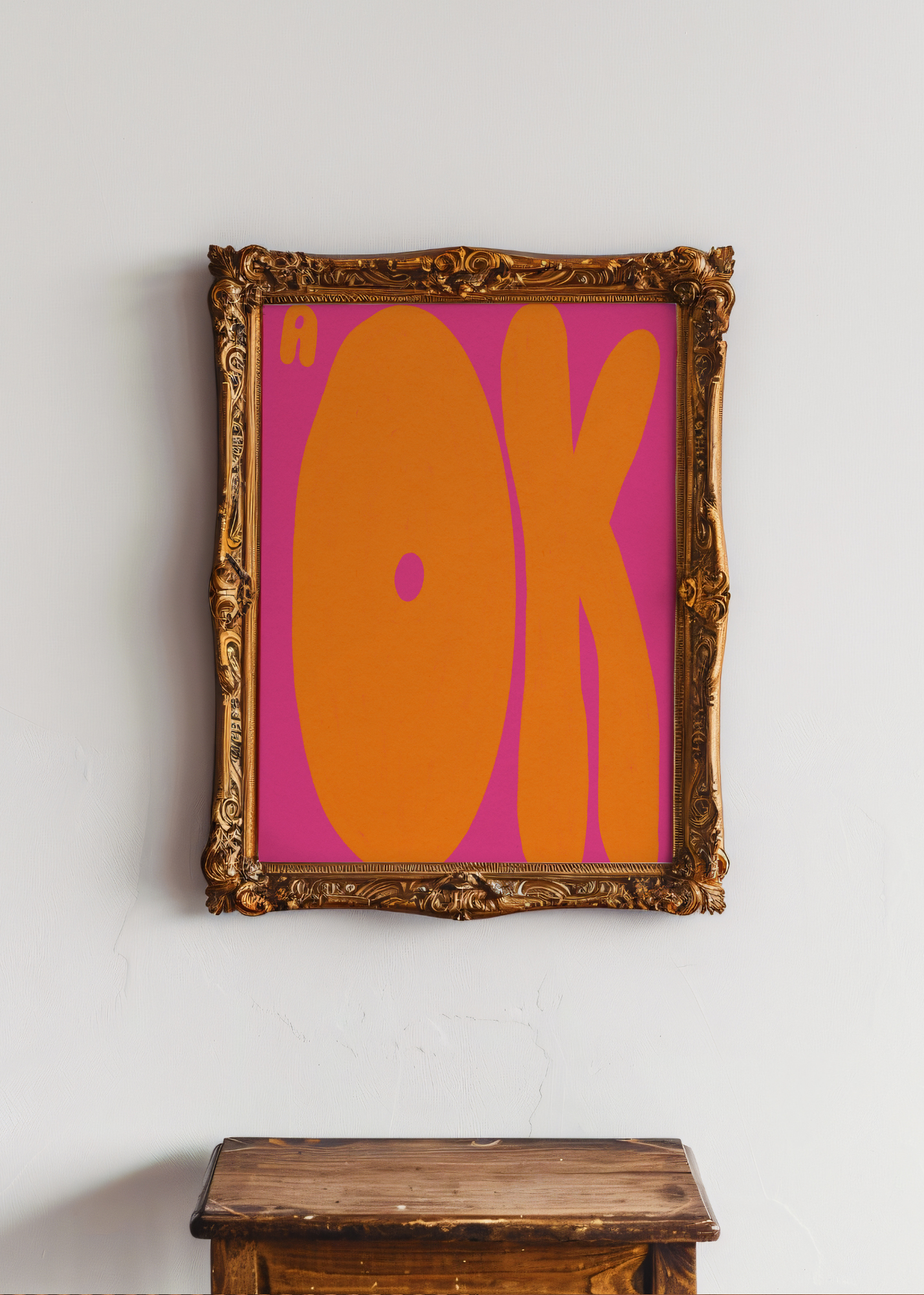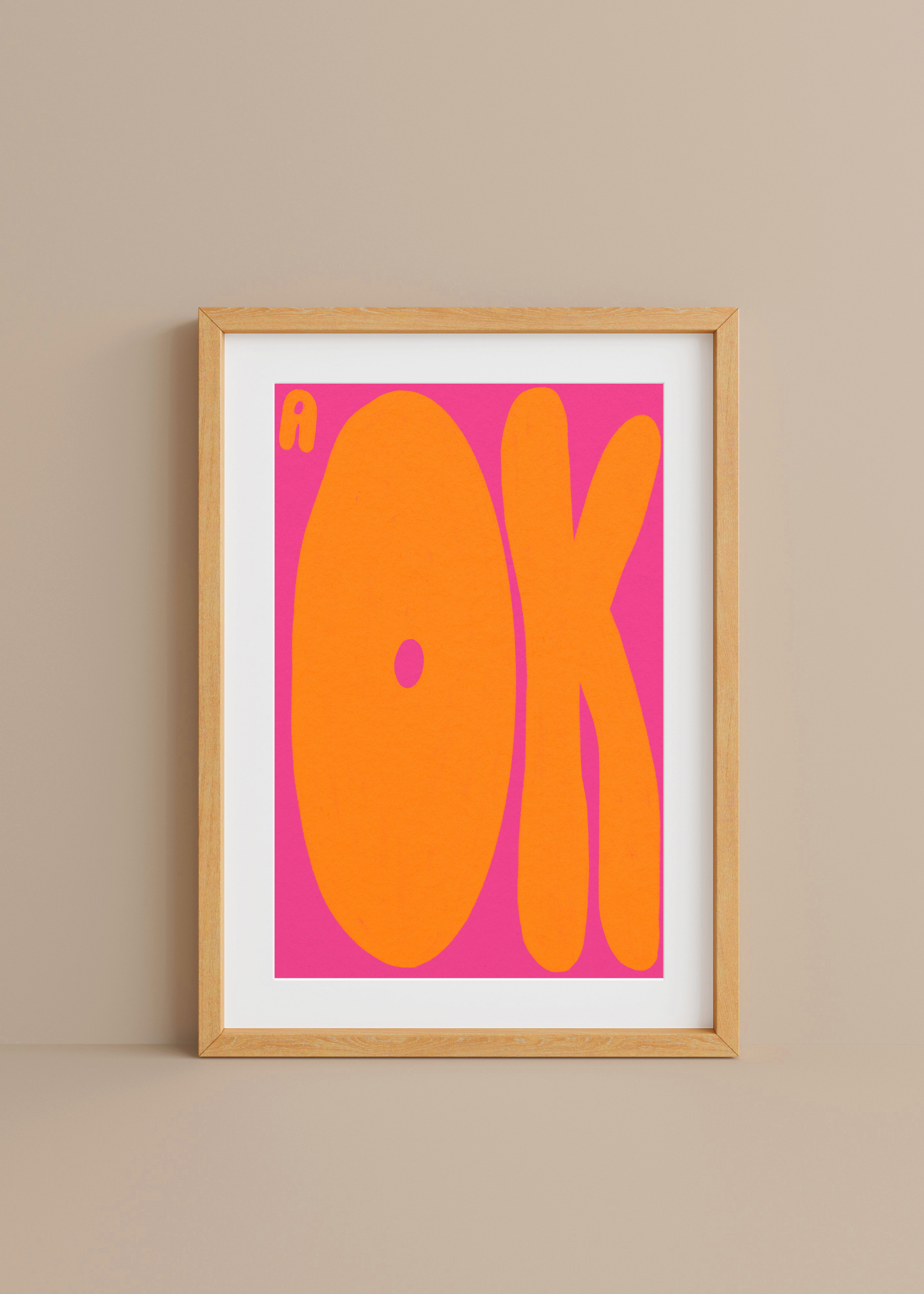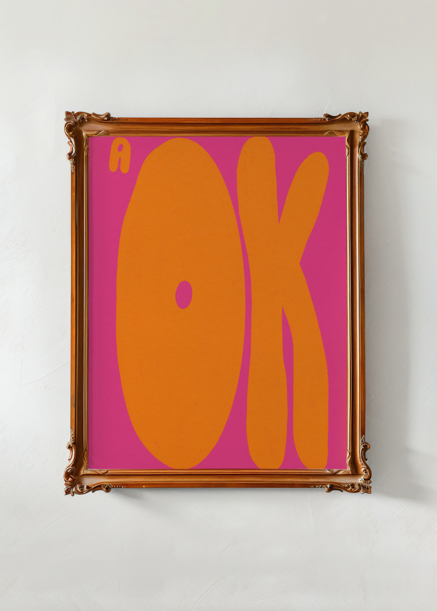 A Ok— Bold and unapologetically cheerful, A Ok is a pop of optimism in vibrant orange and electric pink. With oversized, hand-drawn letters that stretch and curve with a carefree spirit, this modern print is a gentle nudge that everything—truly—is okay. Playful, funky, and full of heart.