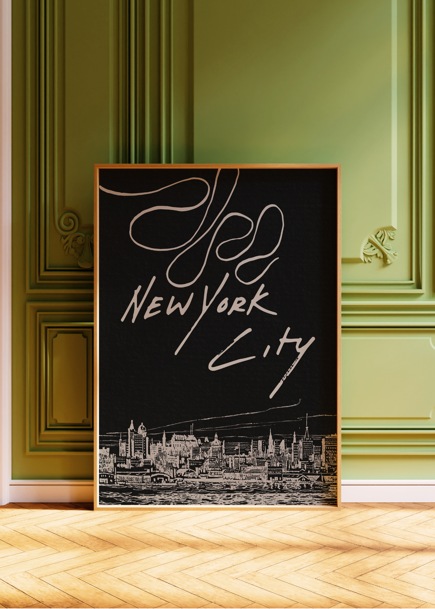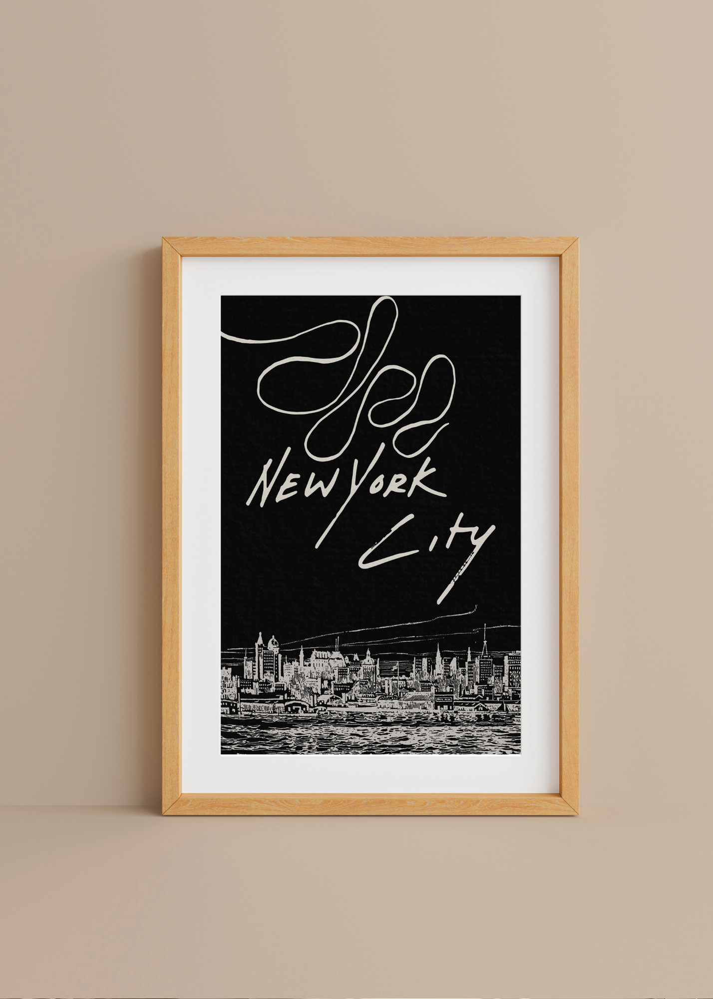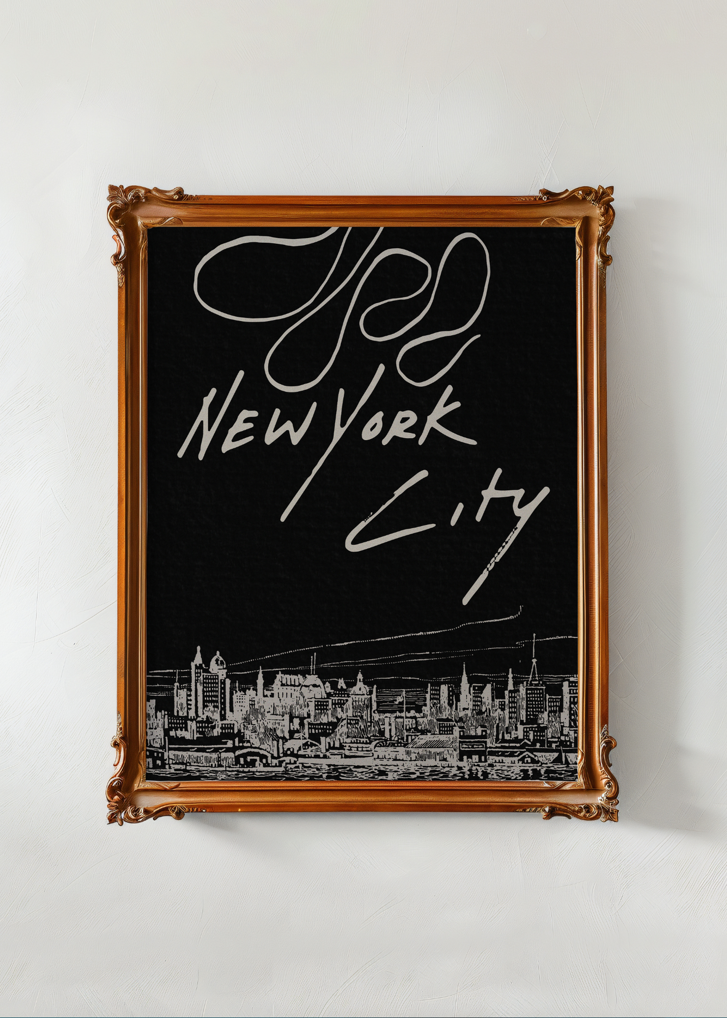 New York City— A modern black background frames a line-drawn slice of the New York City skyline, with the words “New York City” in bold lettering. Moody, minimal, and totally metropolitan.