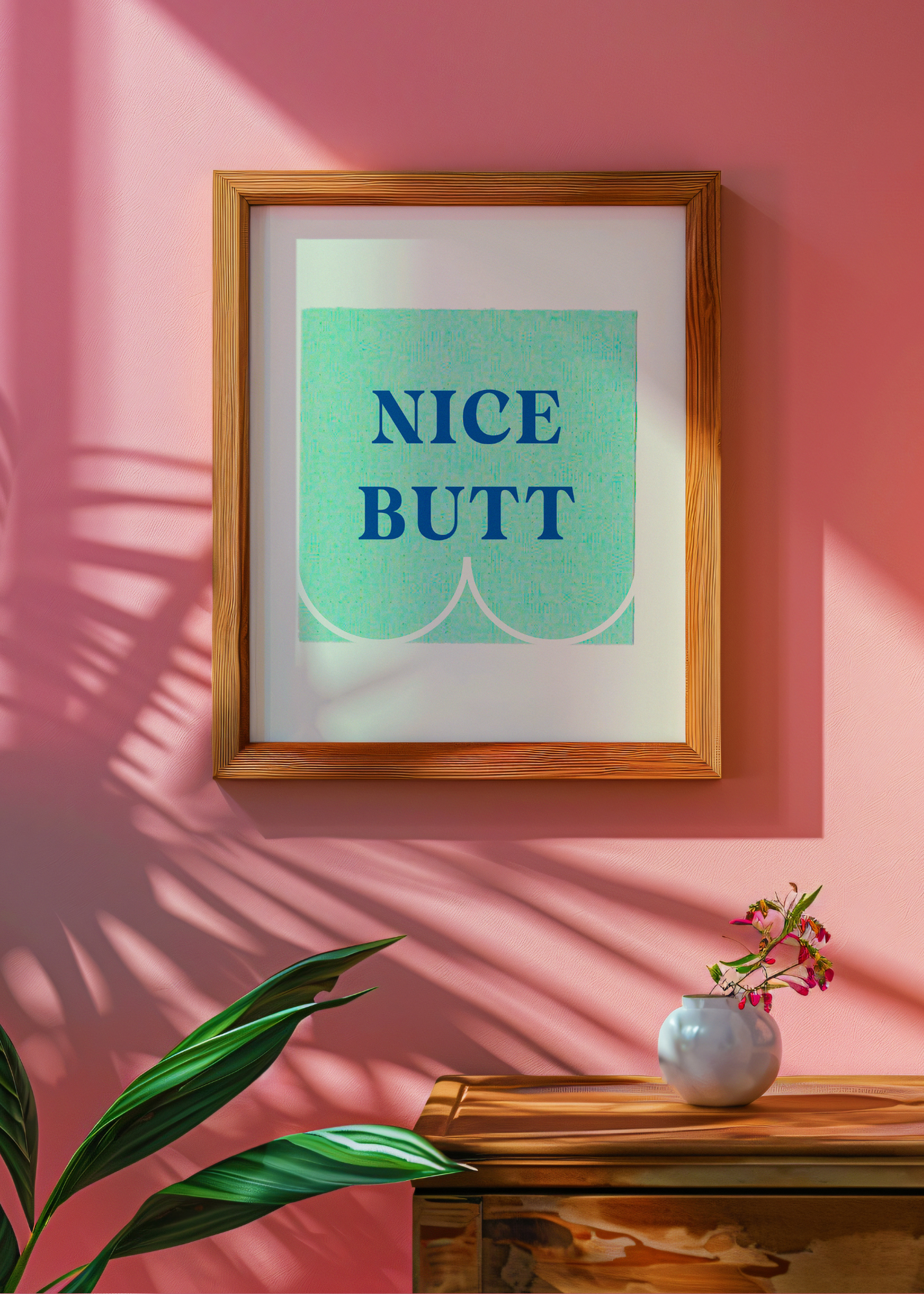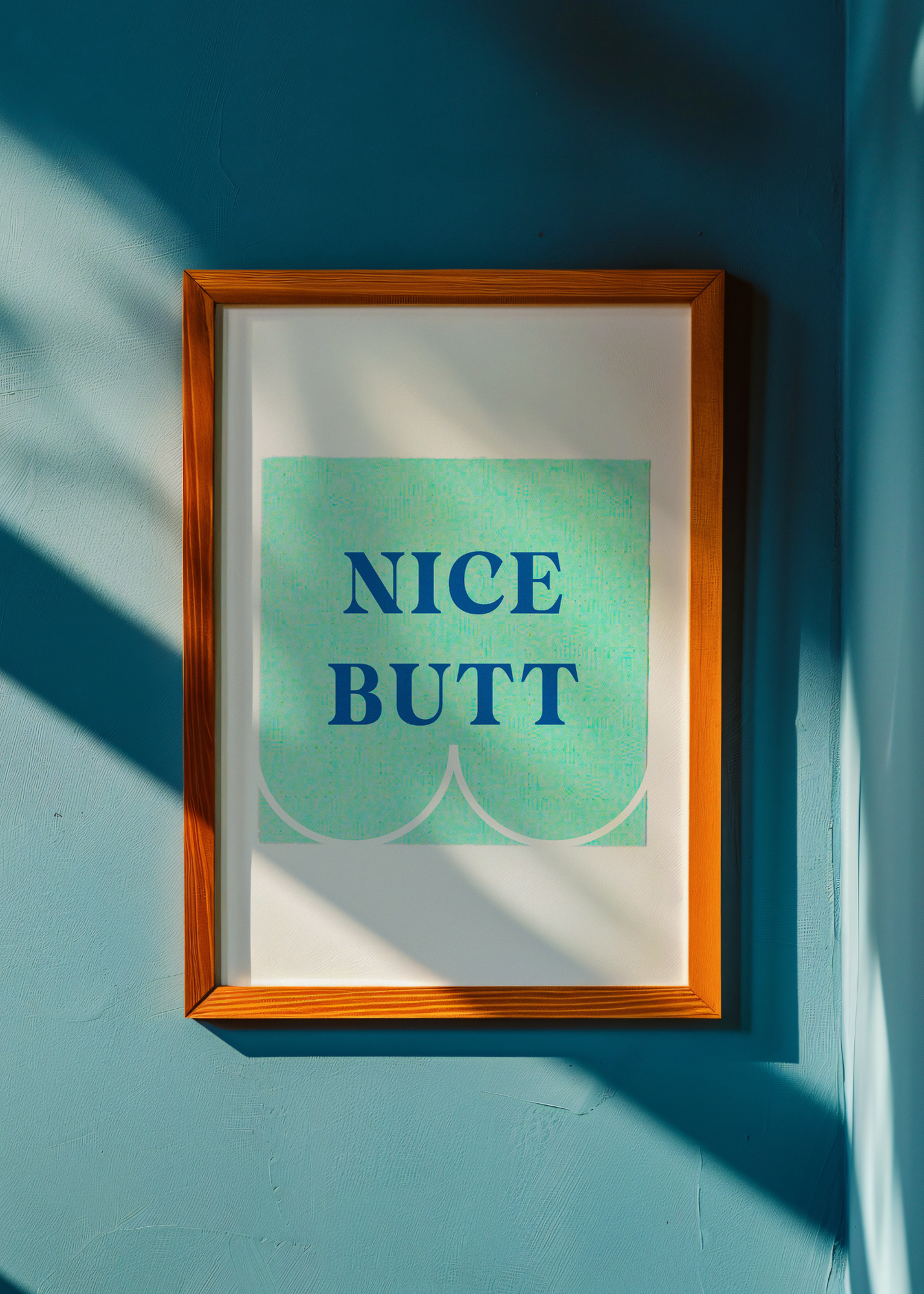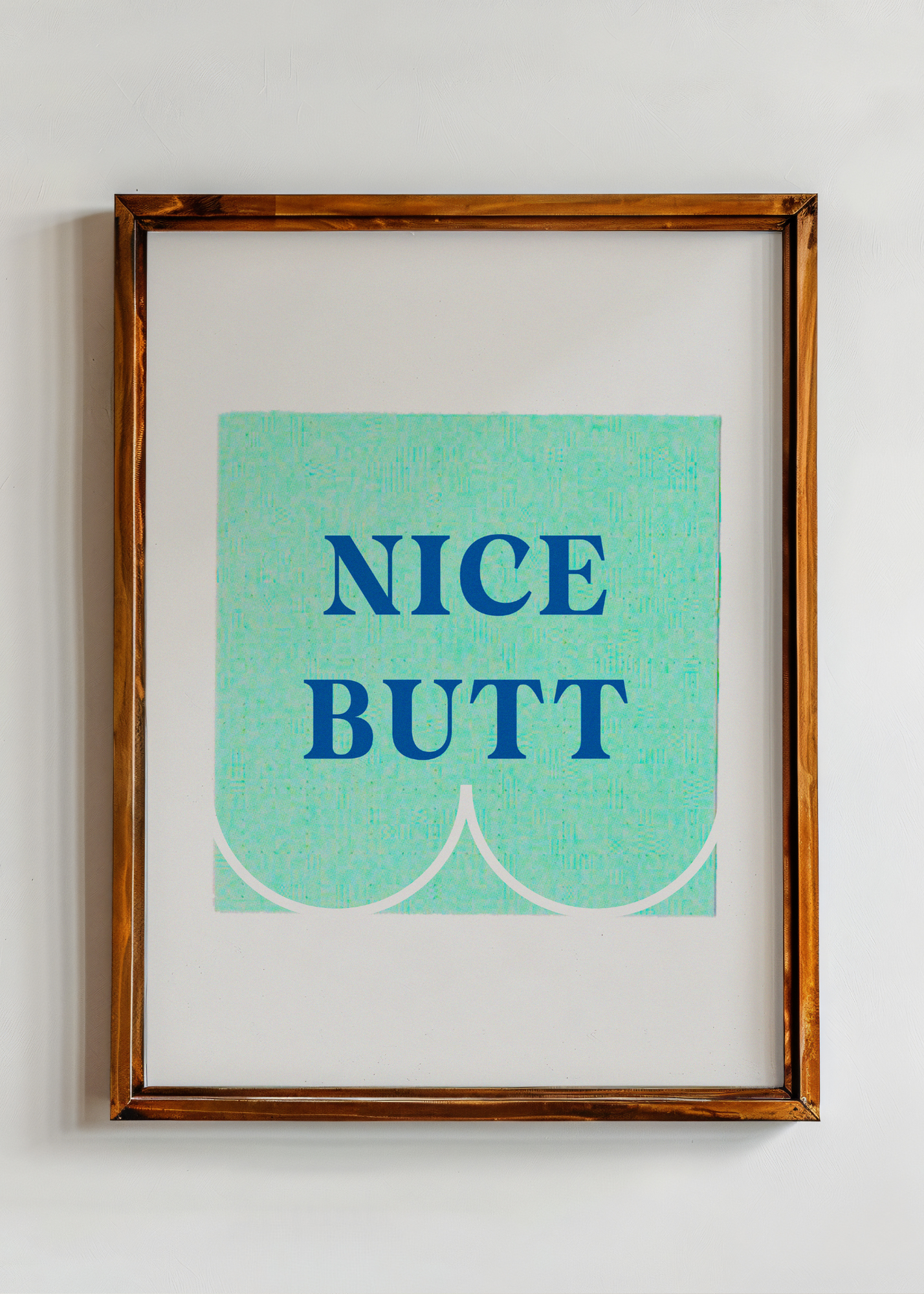 Nice Butt— Teal pops against a white background, hosting the bold phrase “Nice butt” in dark blue lettering. Below it, a delightfully simple line-drawn booty shape makes things—well—extra cheeky. This print’ has the perfect blend of flirt and fun, making it ideal for bathrooms, bedrooms, or wherever you want to drop a compliment with a wink.
