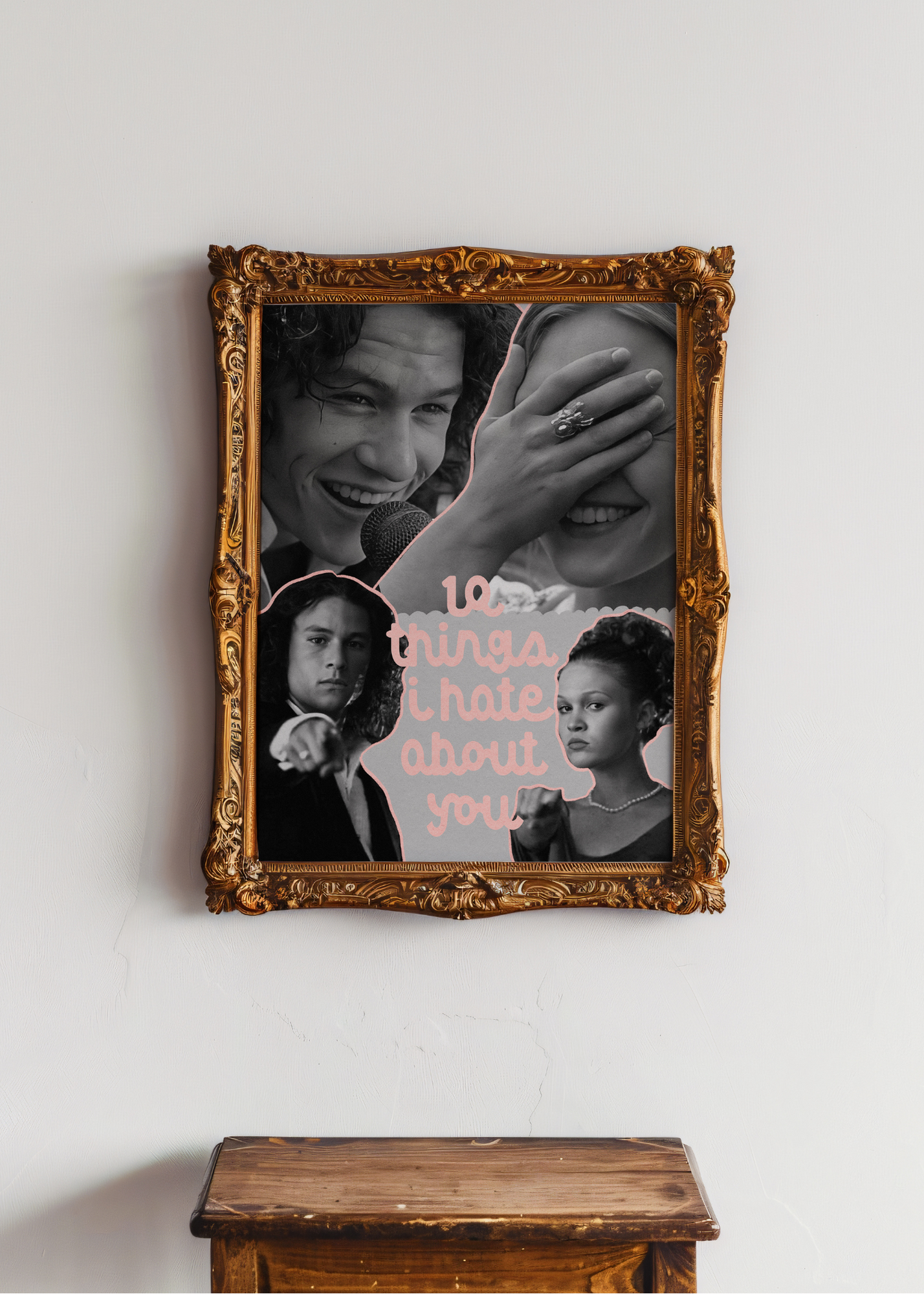 10 Things I Hate About You— A love letter to the unforgettable chaos and charm of teenage hearts. This print features Kat, Patrick— the iconic cast of 10 Things I Hate About You, captured in dreamy black and white with playful pink accents. It celebrates rebellion, romance, and those moments of vulnerability that make us feel deeply seen. A spirited tribute to a film that made us all believe in poetry, paintball dates, and love found in unexpected places.