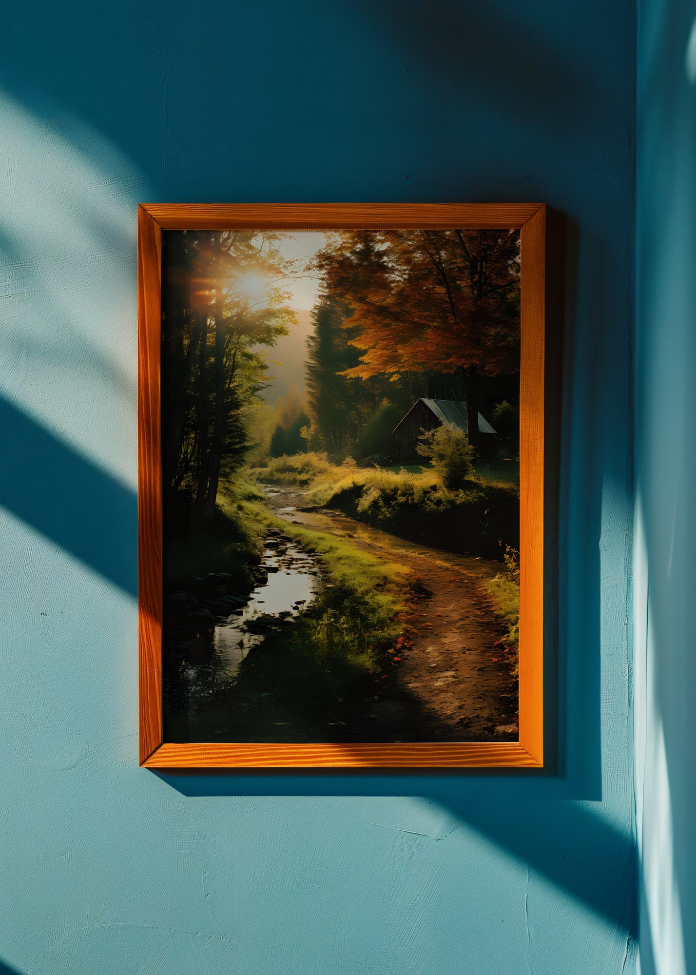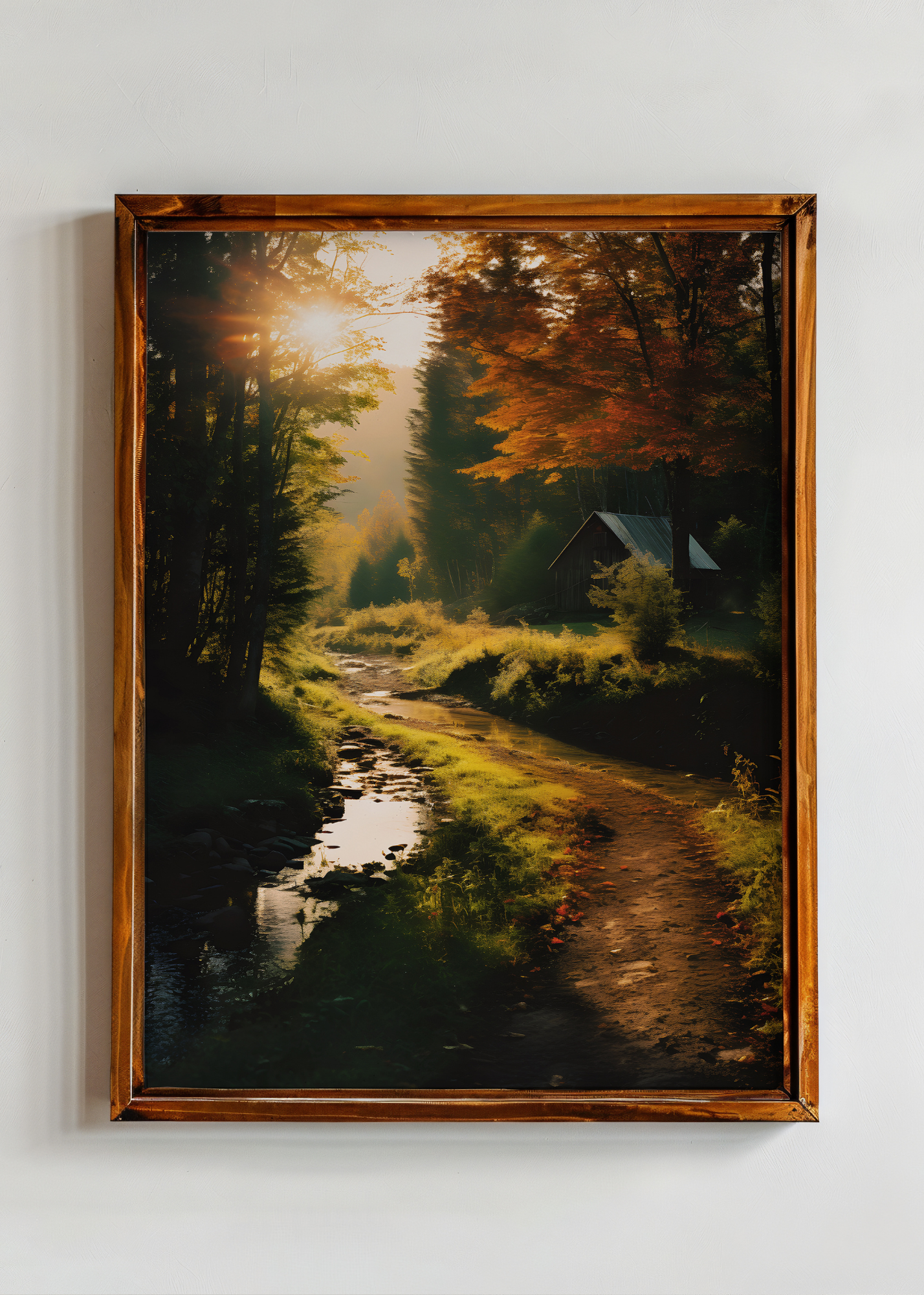 Forest Glow— Golden rays spill across a woodland trail, lighting up the trees like stained glass and tracing a stream that winds toward a shadowed cabin. Each leaf on the forest floor catches fire in the morning sun, glowing with the promise of quiet joy. This is a moment held in amber—where time slows, breath steadies, and wonder lives in every step. This print is a window into a gentler world.