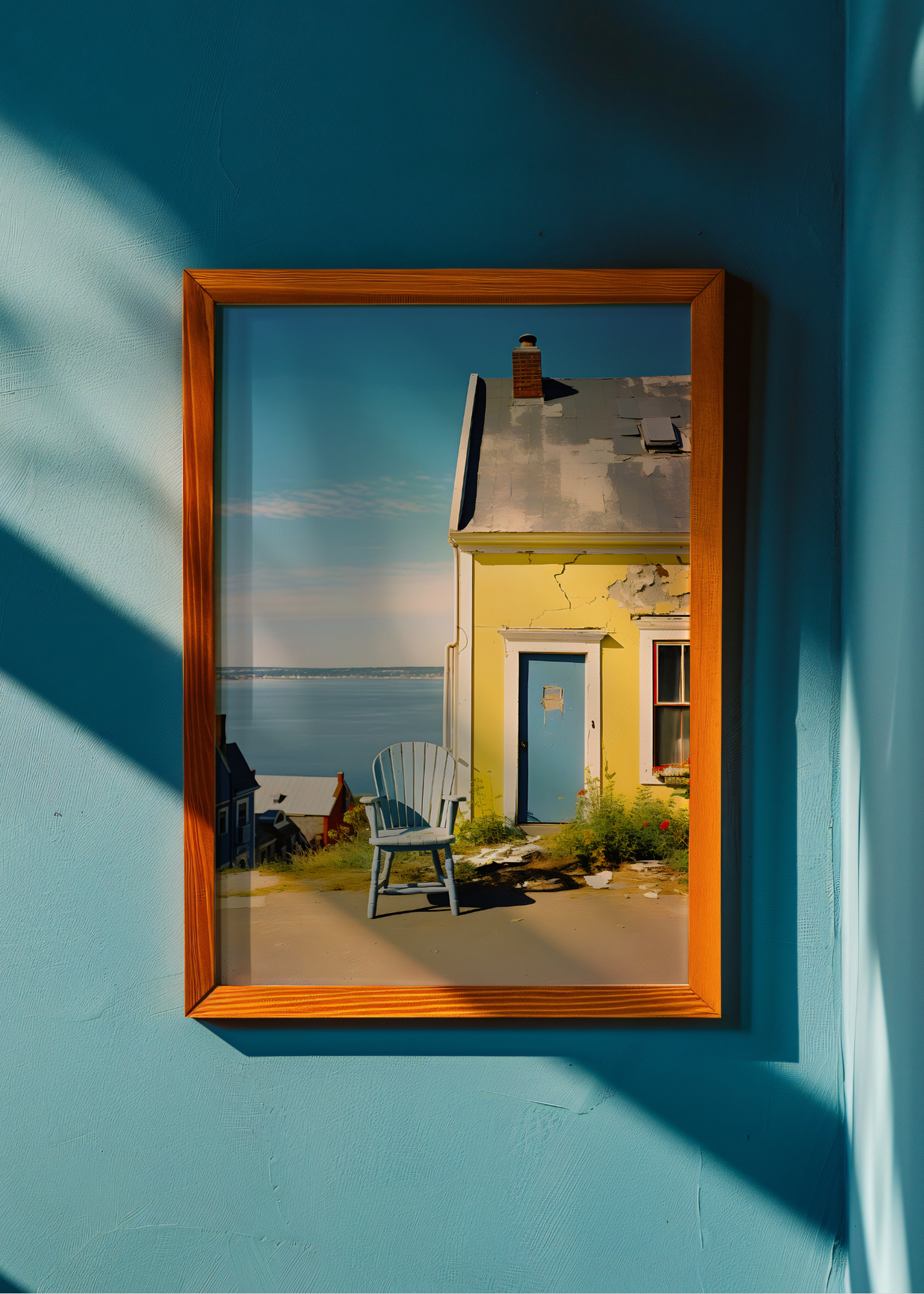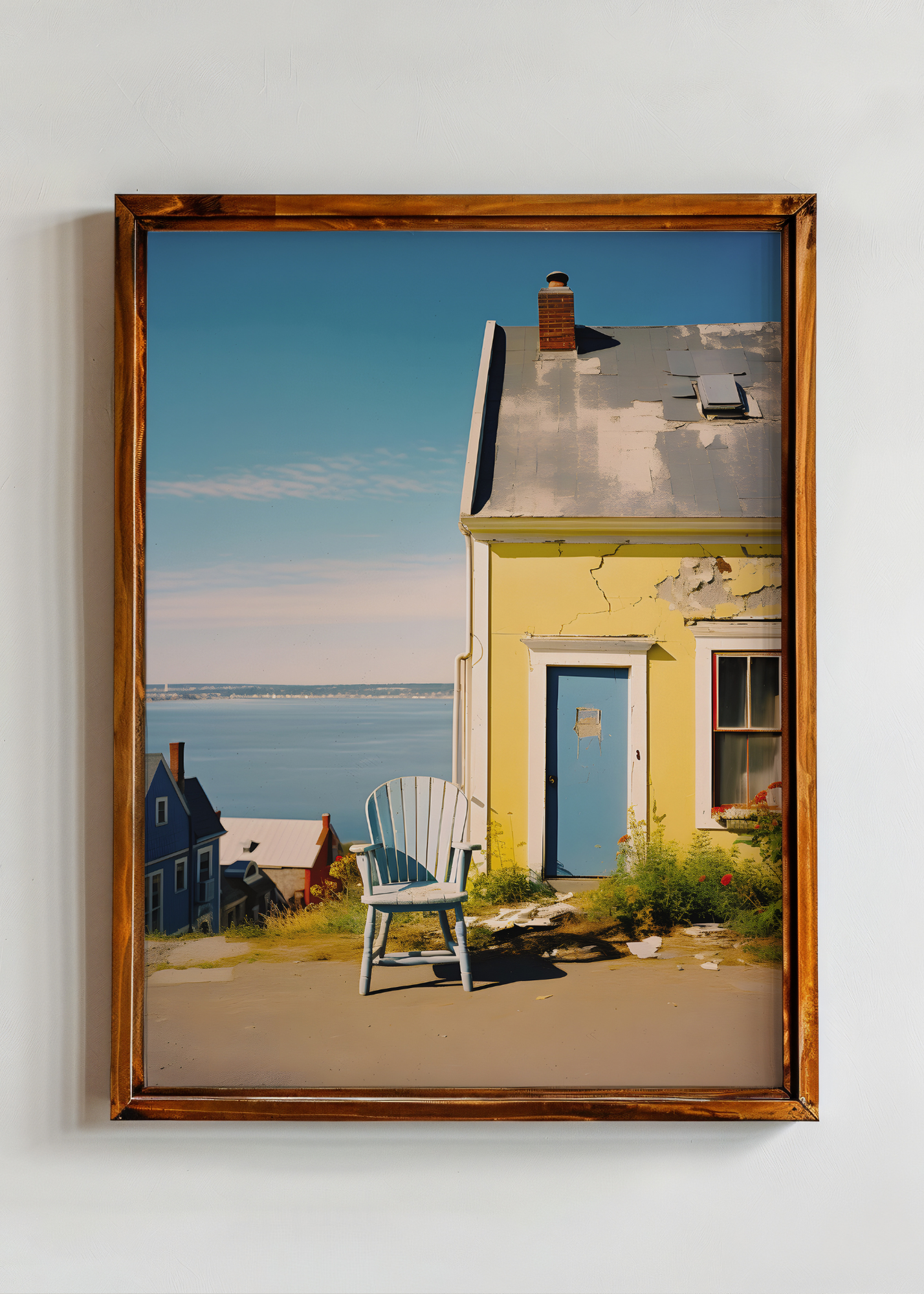 Seaside Stillness— Perched on a sun-bleached slope above the bay, this weathered yellow cottage looks out over the calm Atlantic, its blue door flanked by windswept blooms and peeling trim. An old Adirondack chair sits askew, perfectly positioned for watching sailboats drift or gulls wheel overhead. The cracked siding and tangled seaside plants tell of storms weathered and summers remembered. This piece hums with the rhythm of East Coast coastal towns—quiet mornings, briny air, and the enduring beauty of a life lived by the sea.