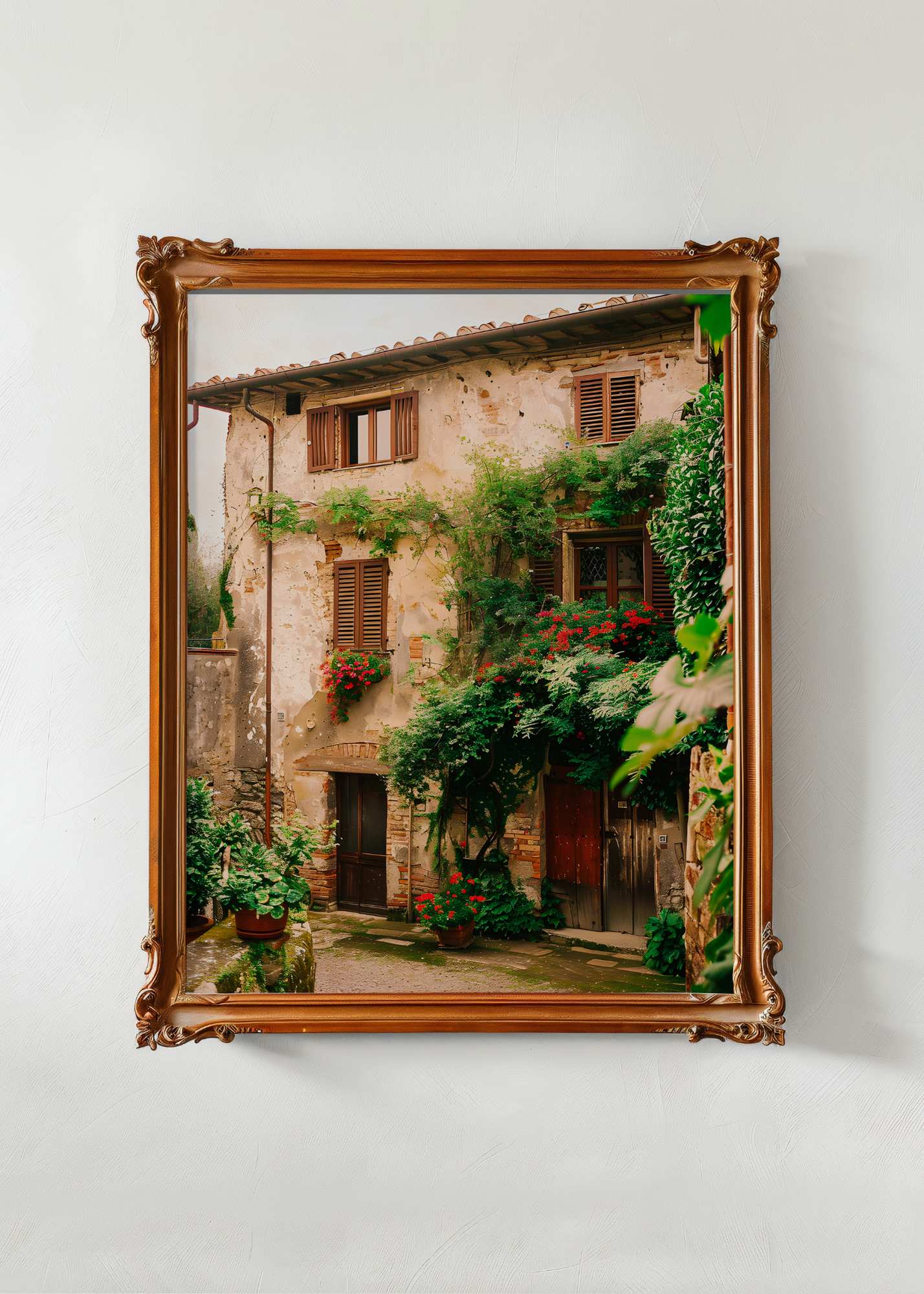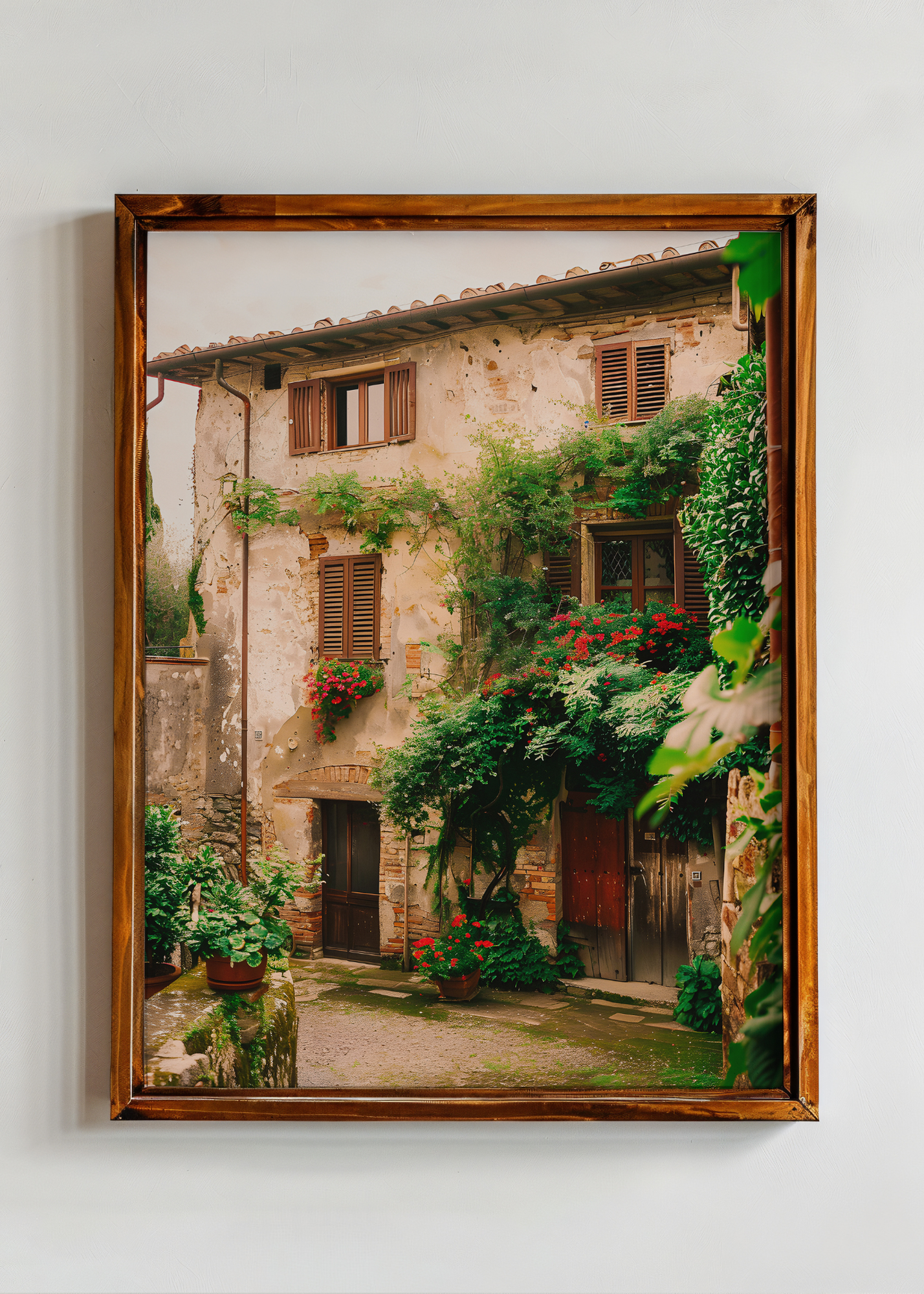 Courtyard in Bloom— Old stone and terracotta come to life beneath a blanket of vines and cascading flowers. This Tuscan courtyard is a lush embrace of color and quiet—a place where the days linger and conversations stretch on past sunset. The worn shutters, the arched doorway, the climbing green—each detail sings of age, romance, and rootedness. This piece is a blooming invitation to slow down and stay awhile.