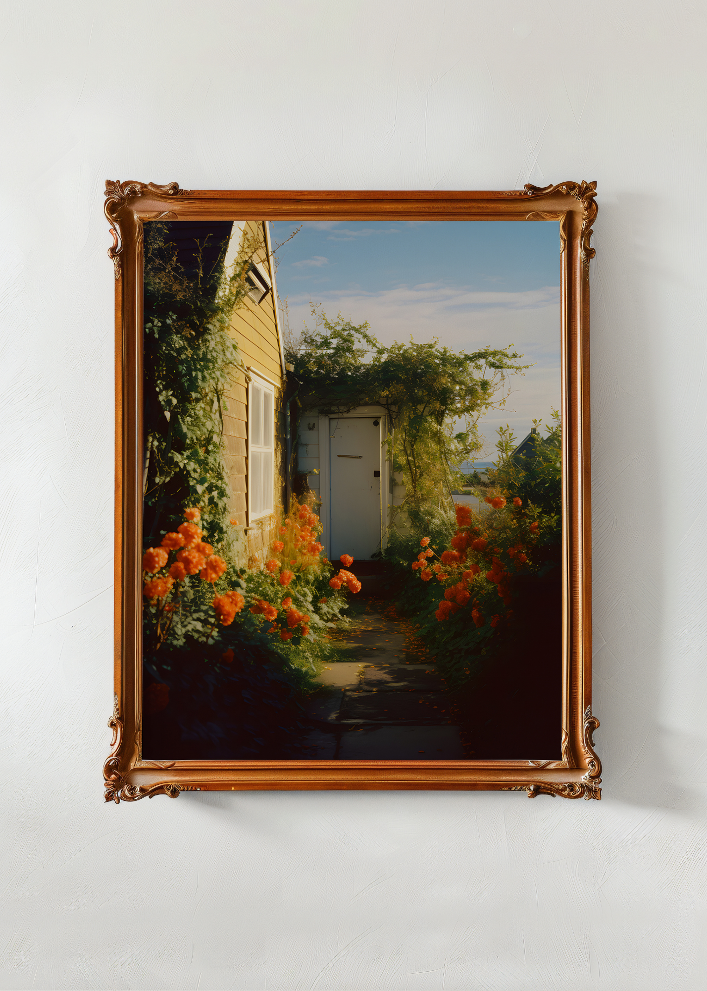 Late Blooming Light— Sunlight spills across the doorway like a warm hello, catching on the petals of zinnias and marigolds that bloom wild along a flagstone path. The cottage walls are golden and kind, holding years of laughter and sea wind. The vines overhead bend low, like they’re leaning in to listen. This print is a backyard fairytale—a place where the days stretch long and the garden always answers back.